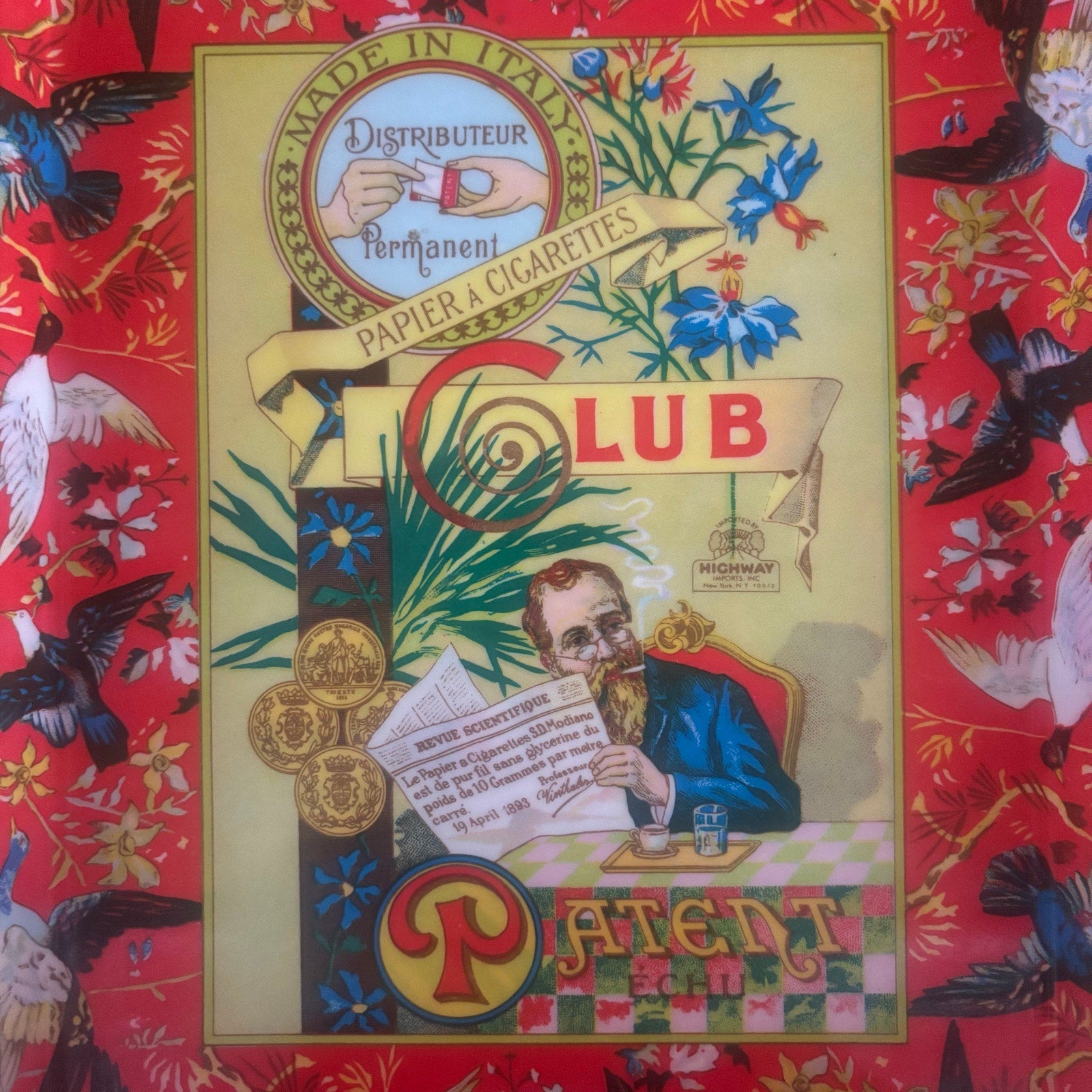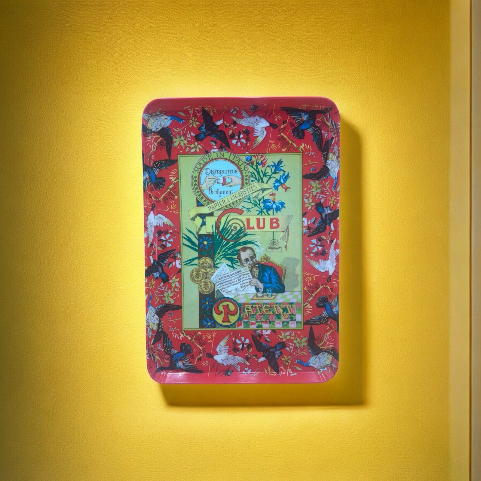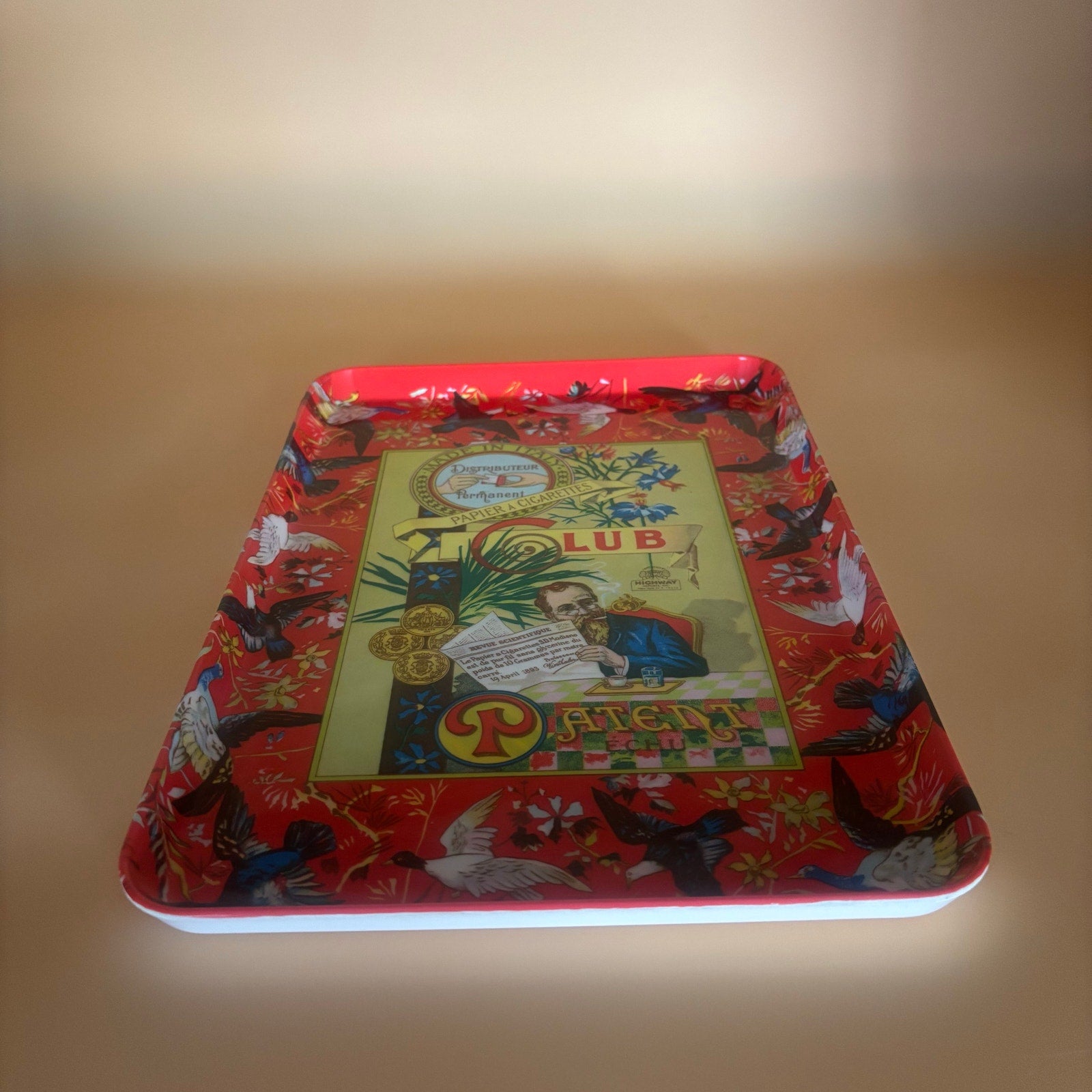 Beautiful vibrant colors! Bold vintage Club Modiano tray featuring the iconic Distributeur Papier à Cigarettes artwork with a red floral and bird border, gold medal illustrations, and central portrait design. There is no marking of origan. It has the same vibrant colors as the 4"x6" tray listed that is marked made in Italy and the same circle on the bottom. There is a small burn mark above the “M” in “Permanent”—see photos for close-up. Ideal for display, tobacciana collectors, or retro decor.