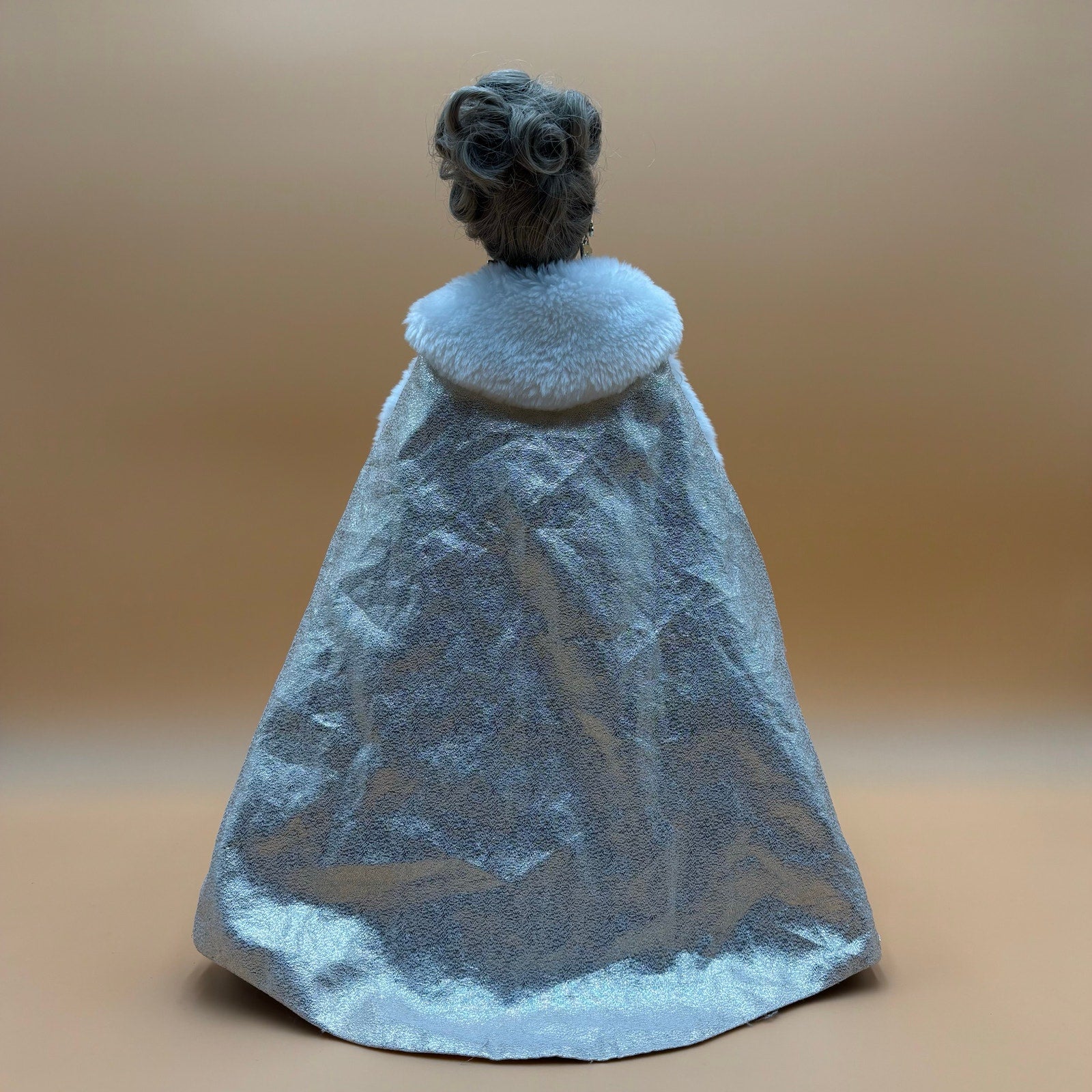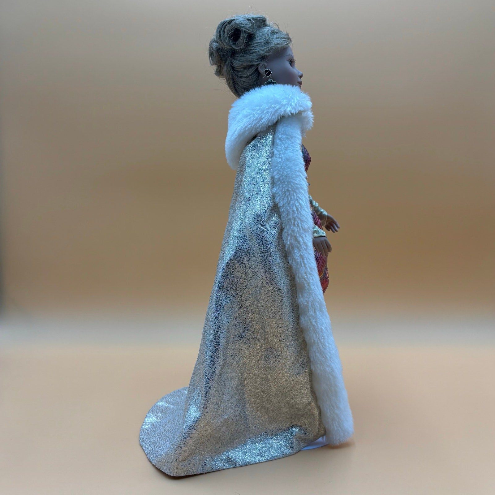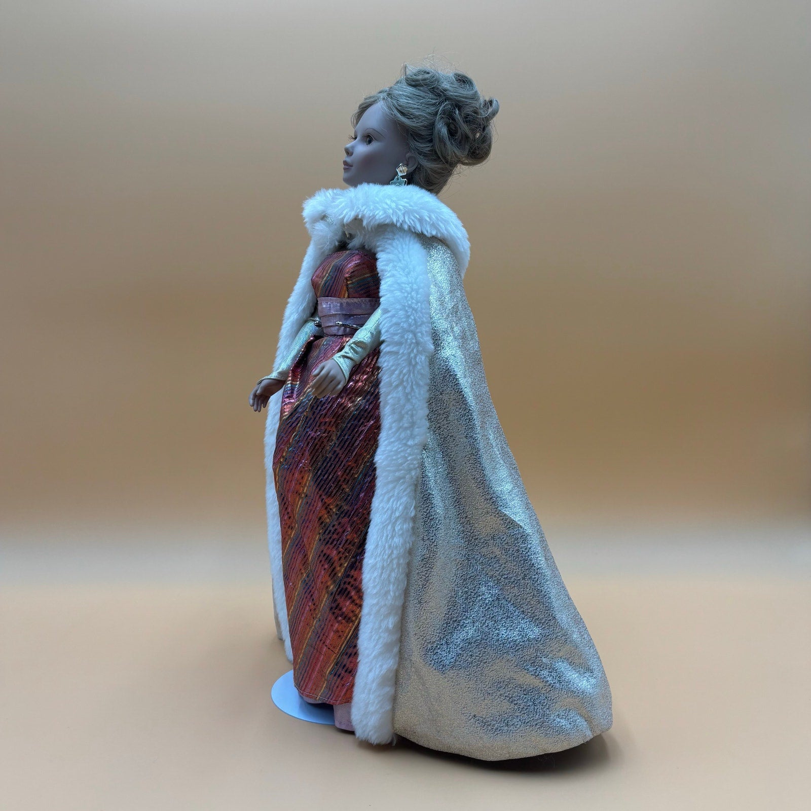 Vintage 1996 Playmates Toys "Young Lady So Beautiful" soft vinyl doll. Features elegant evening gown in shimmery copper/rose tones with white fur-trimmed cape. Blonde upswept hairstyle and detailed facial features. Includes display stand. Estate sale find.