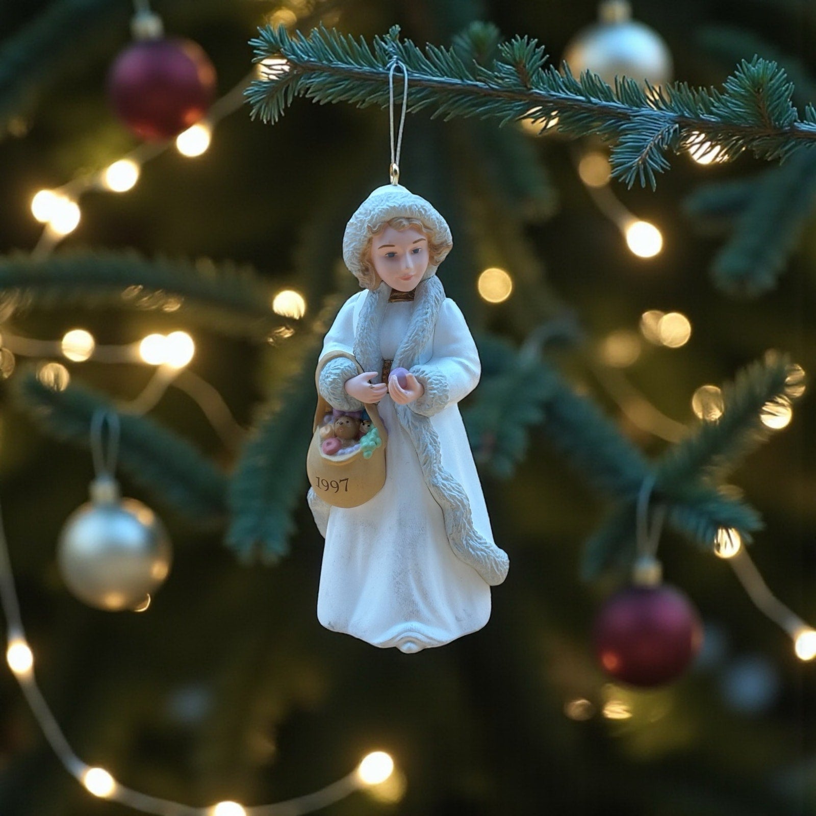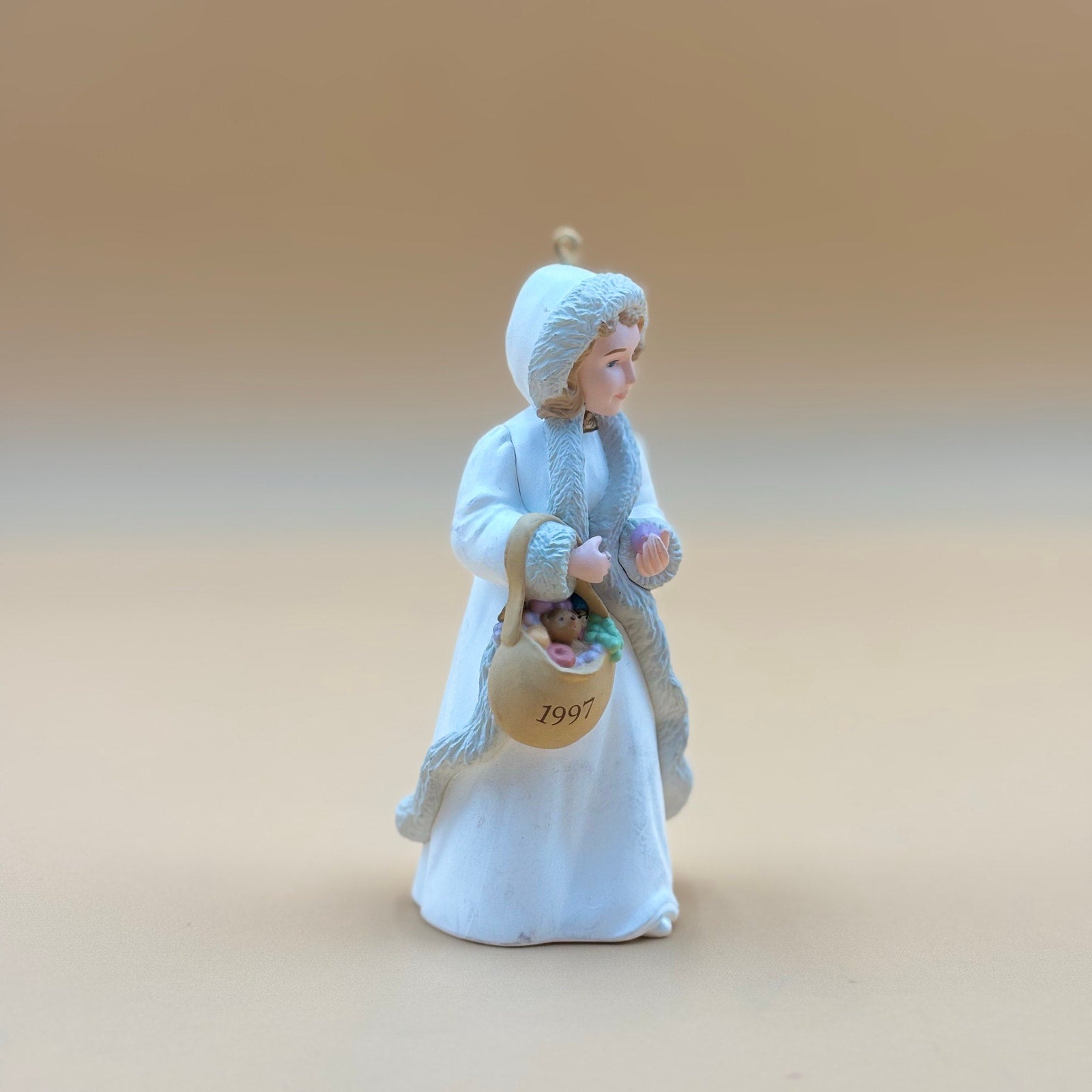 Beautiful 1997 Hallmark Keepsake ornament titled Kolyada, the 3rd release in the Christmas Visitors Series. Features a finely detailed figure dressed in white winter robes holding a basket of festive treats. Designed by Hallmark artist Julianne F. Ekholm and marked on the base. A lovely addition for Hallmark or Christmas collectors.
