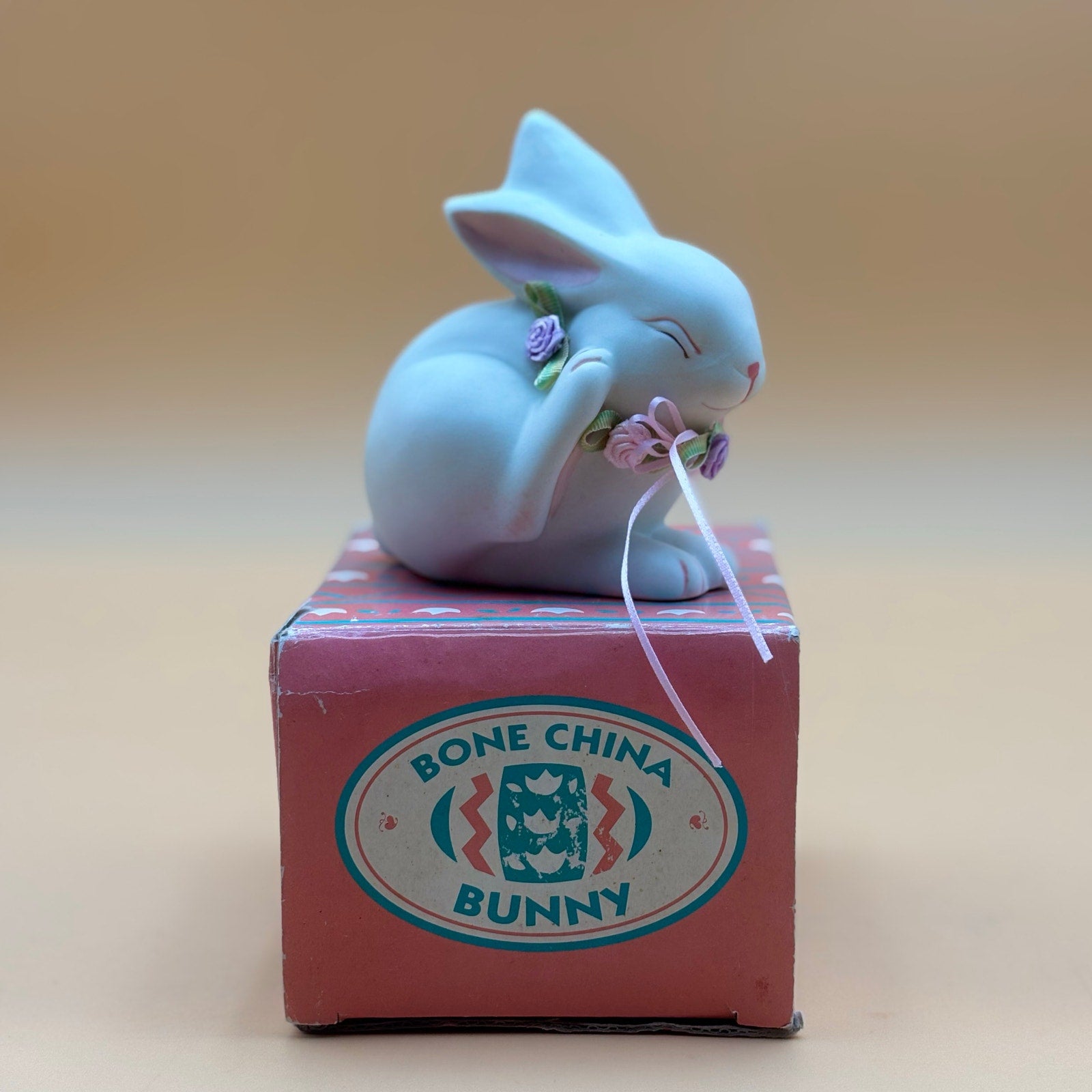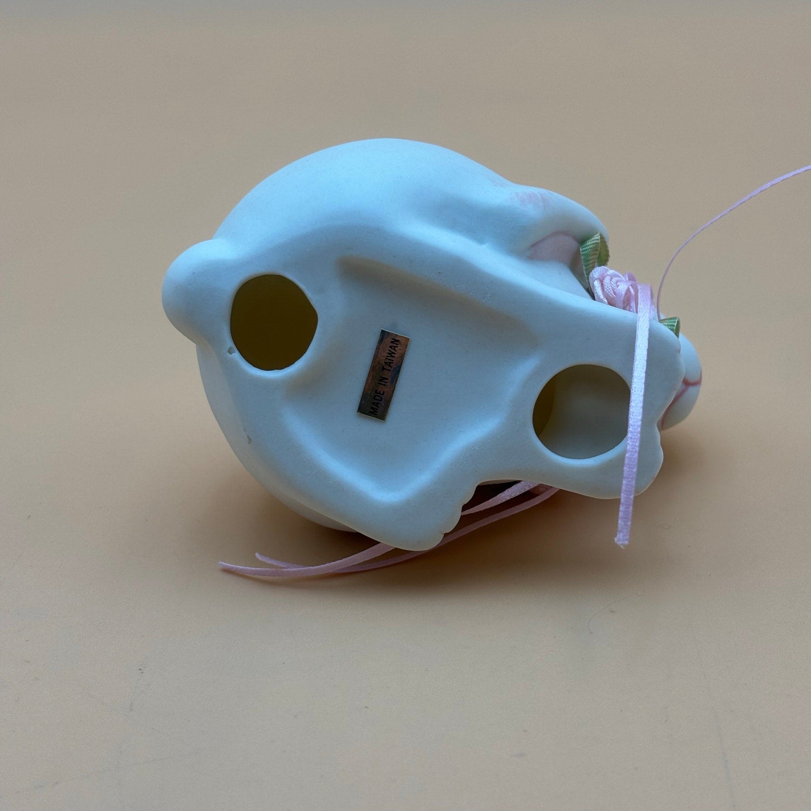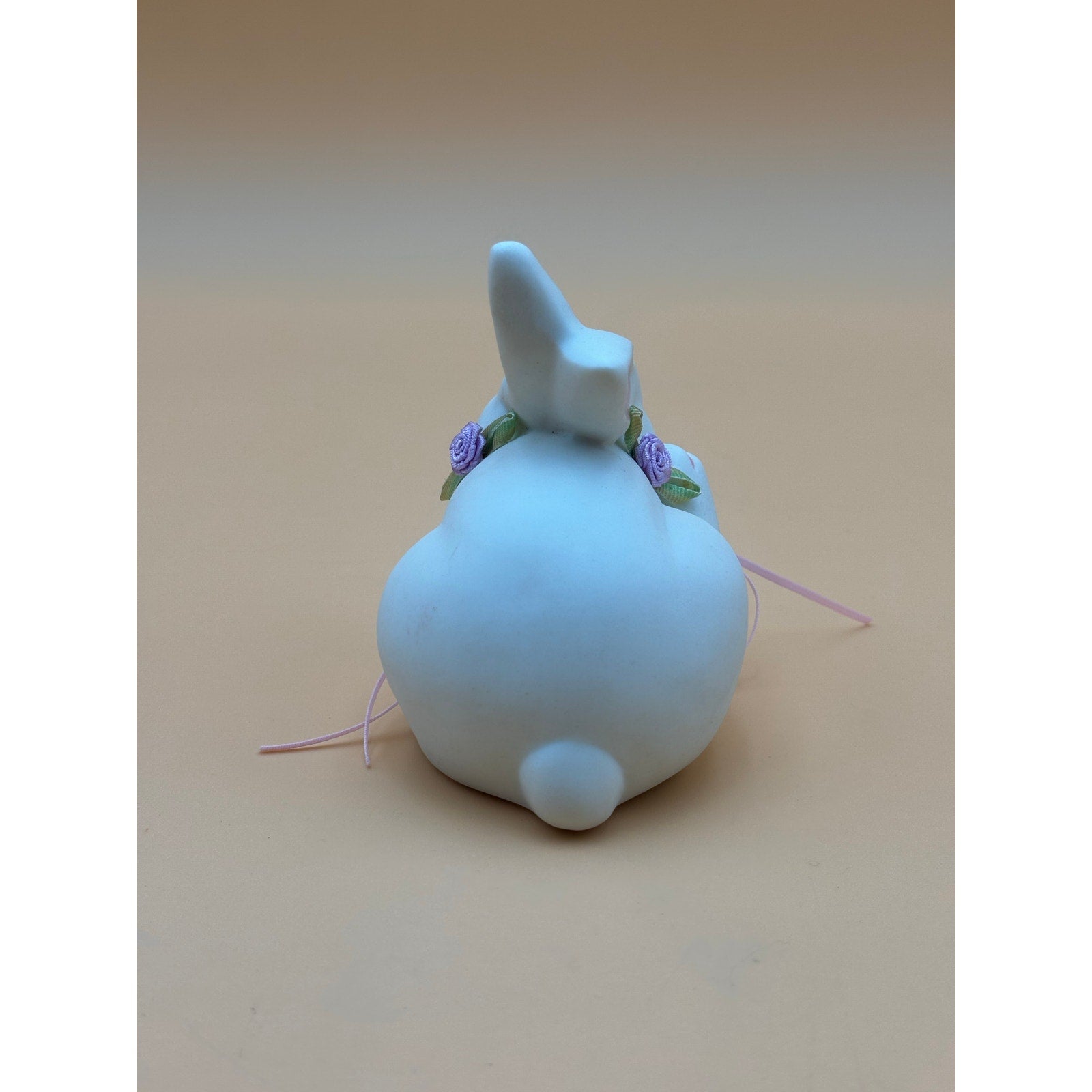 Adorable bone china bunny figurine with pastel ribbon flowers and its original box. Marked Made in Taiwan on the bottom. Features a matte finish and sweet seated pose with floral ribbon detail.