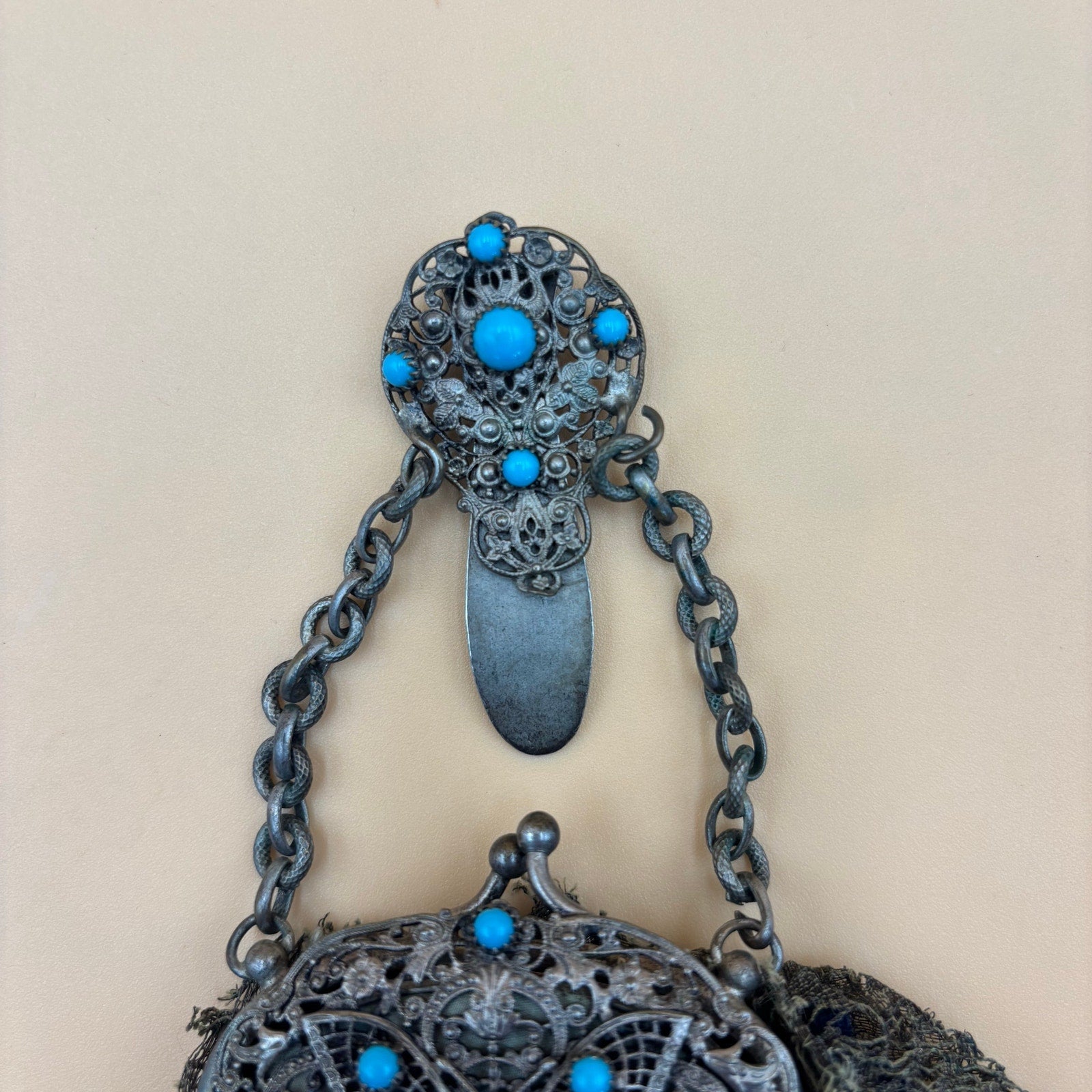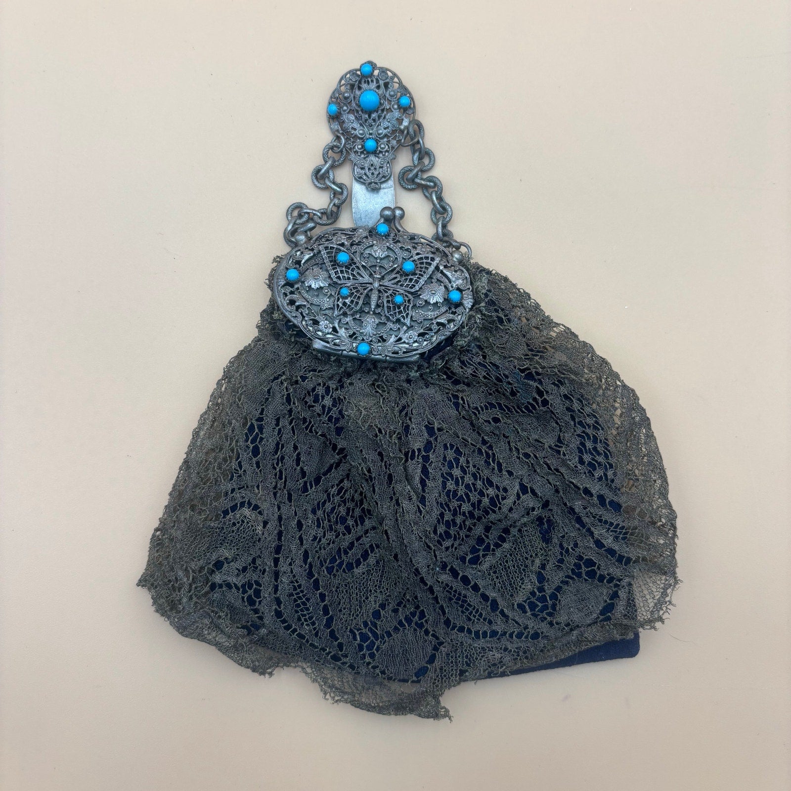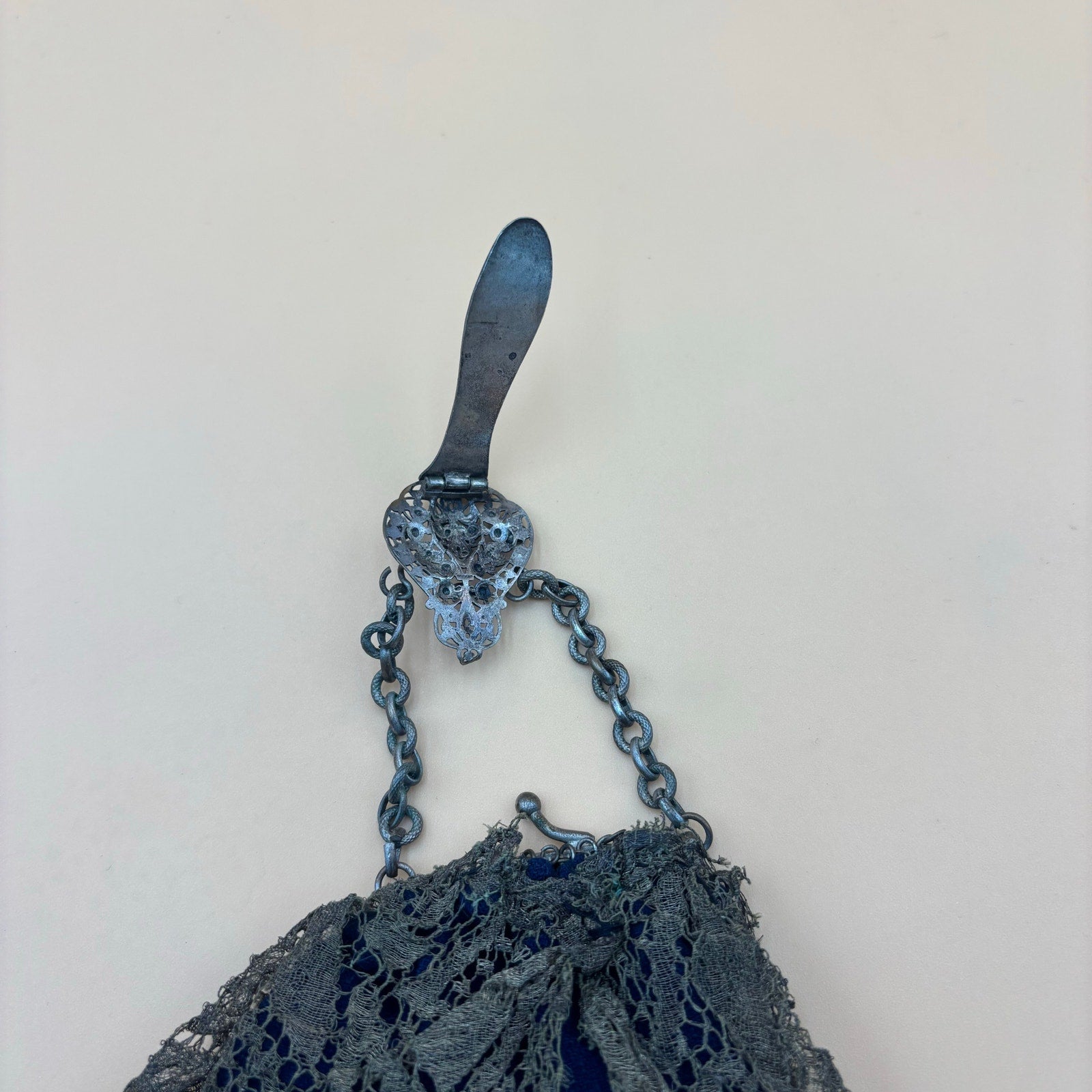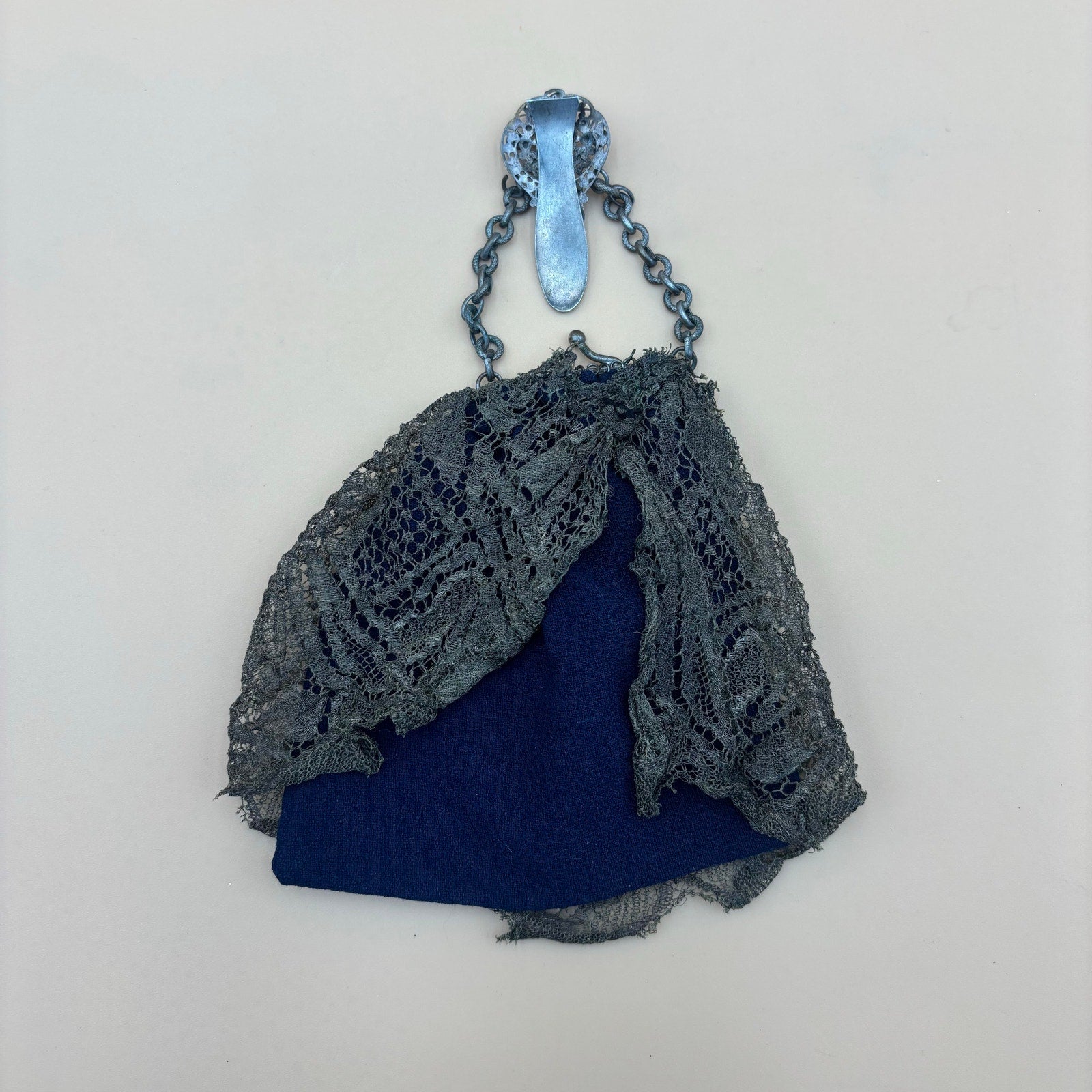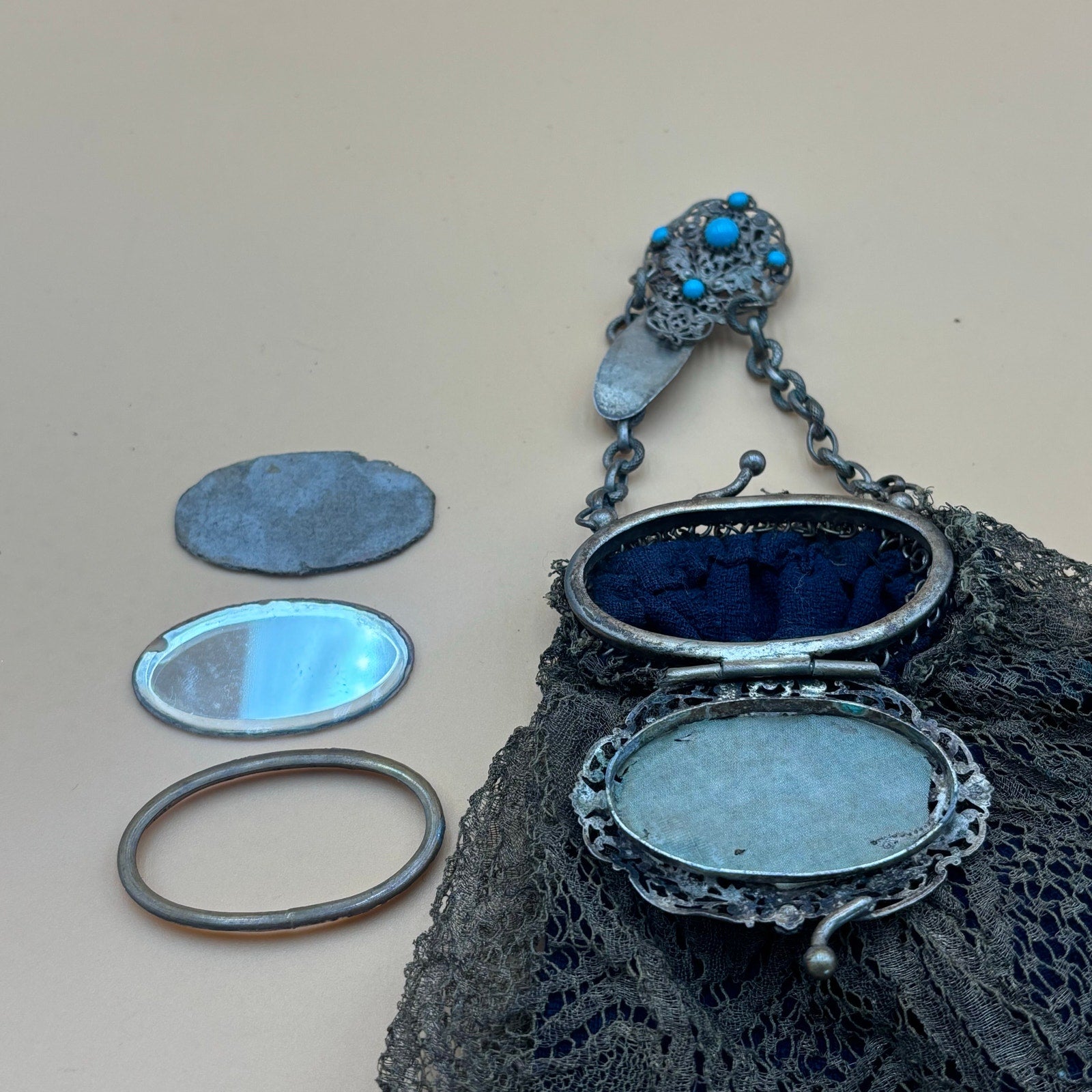 Antique clip-on purse featuring olive green lace over dark blue cloth with an attached mirror compartment. Includes original chain, decorative metal clip with blue cabochons, and internal mirror components as shown. Worn on a belt or stocking as a going-out accessory.