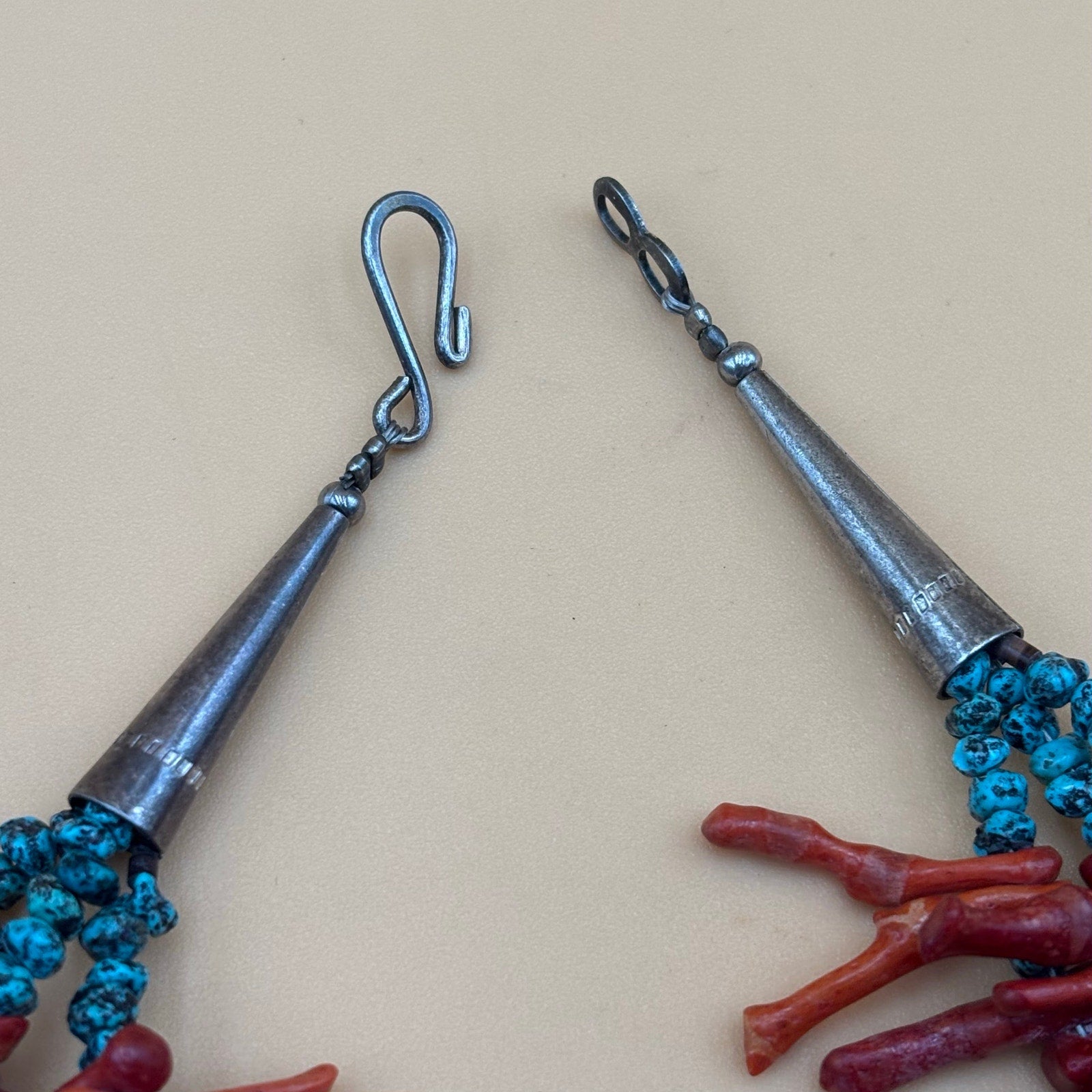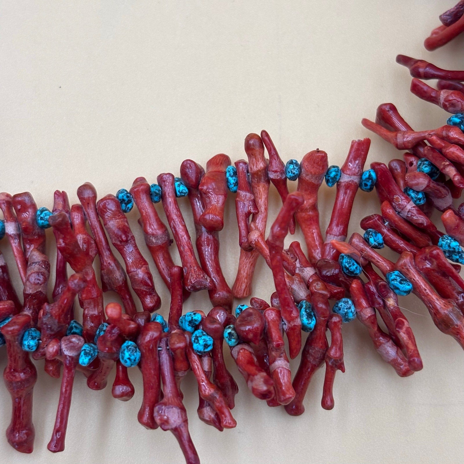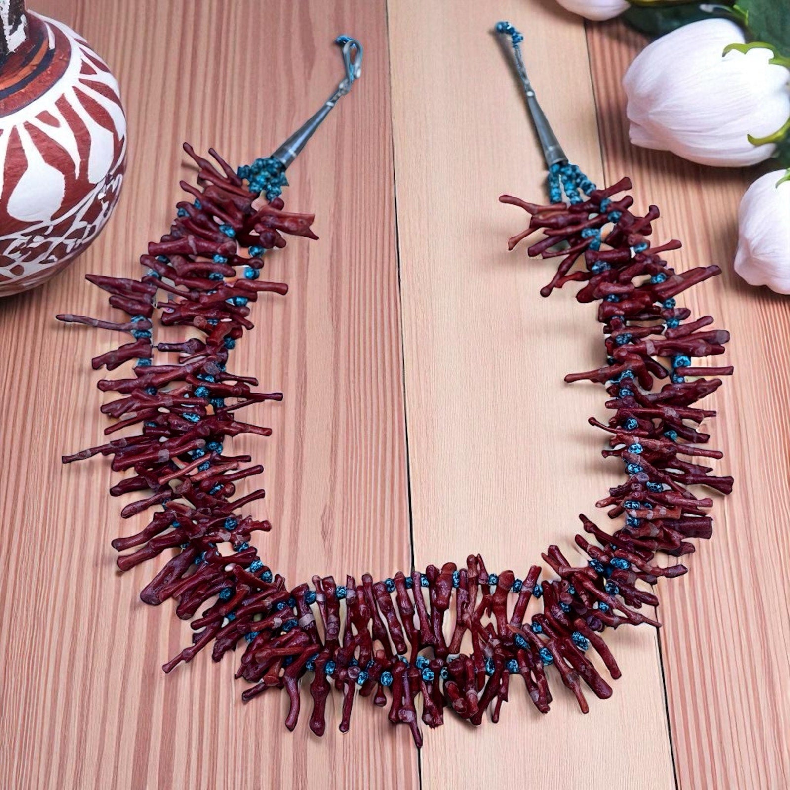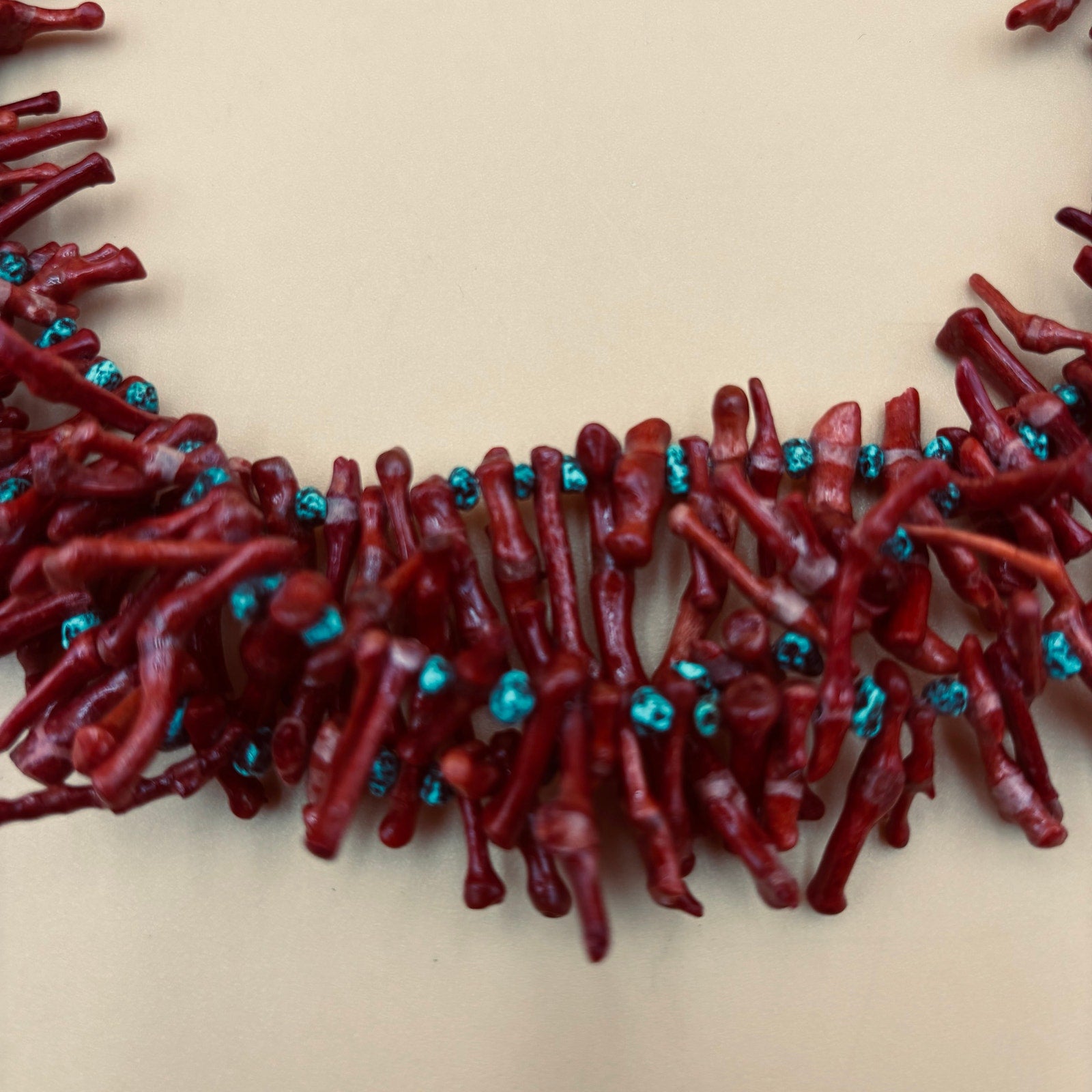 Striking three-strand necklace crafted with natural red coral branch beads and turquoise spacers. Finished with long tapered silver-tone cones and a secure S-hook clasp. A bold piece that makes a statement with its rich color and layered texture.
