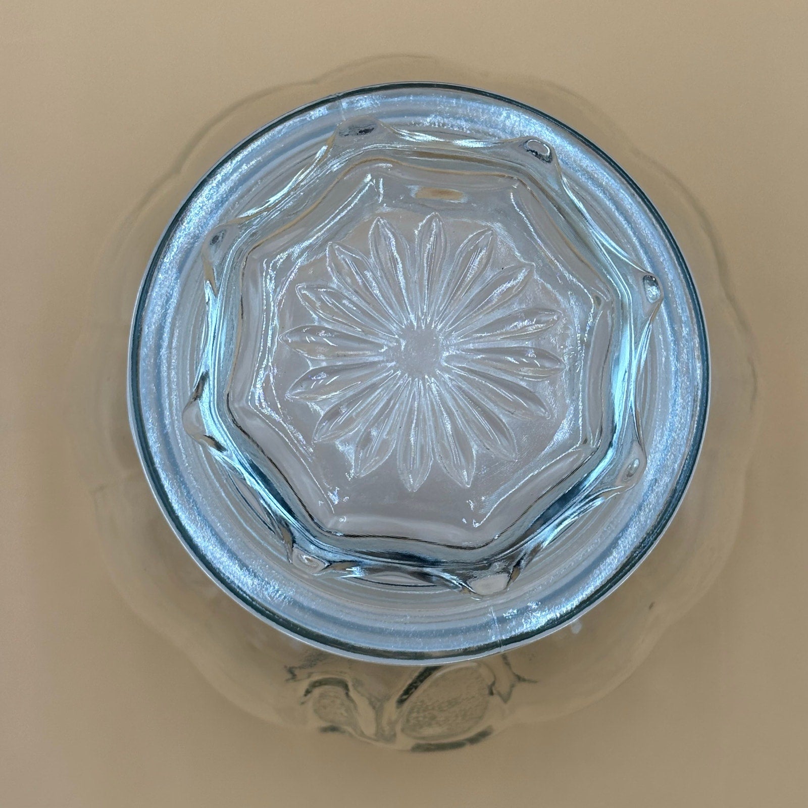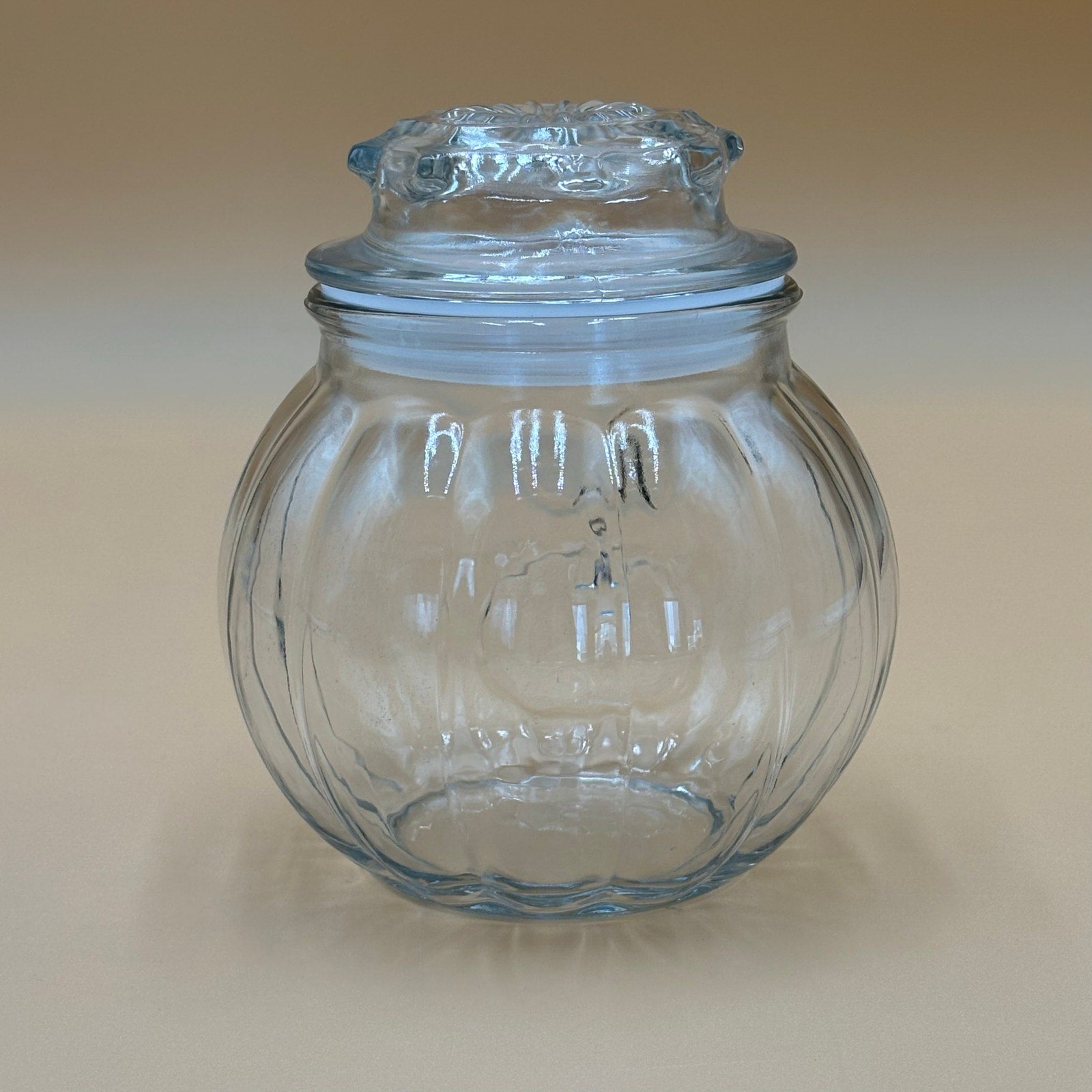 Clear ribbed glass jar with matching lid. The body is rounded with vertical ribbing, resembling a pumpkin shape. Lid features a molded floral or leaf-like detail. No maker’s mark or label is visible.