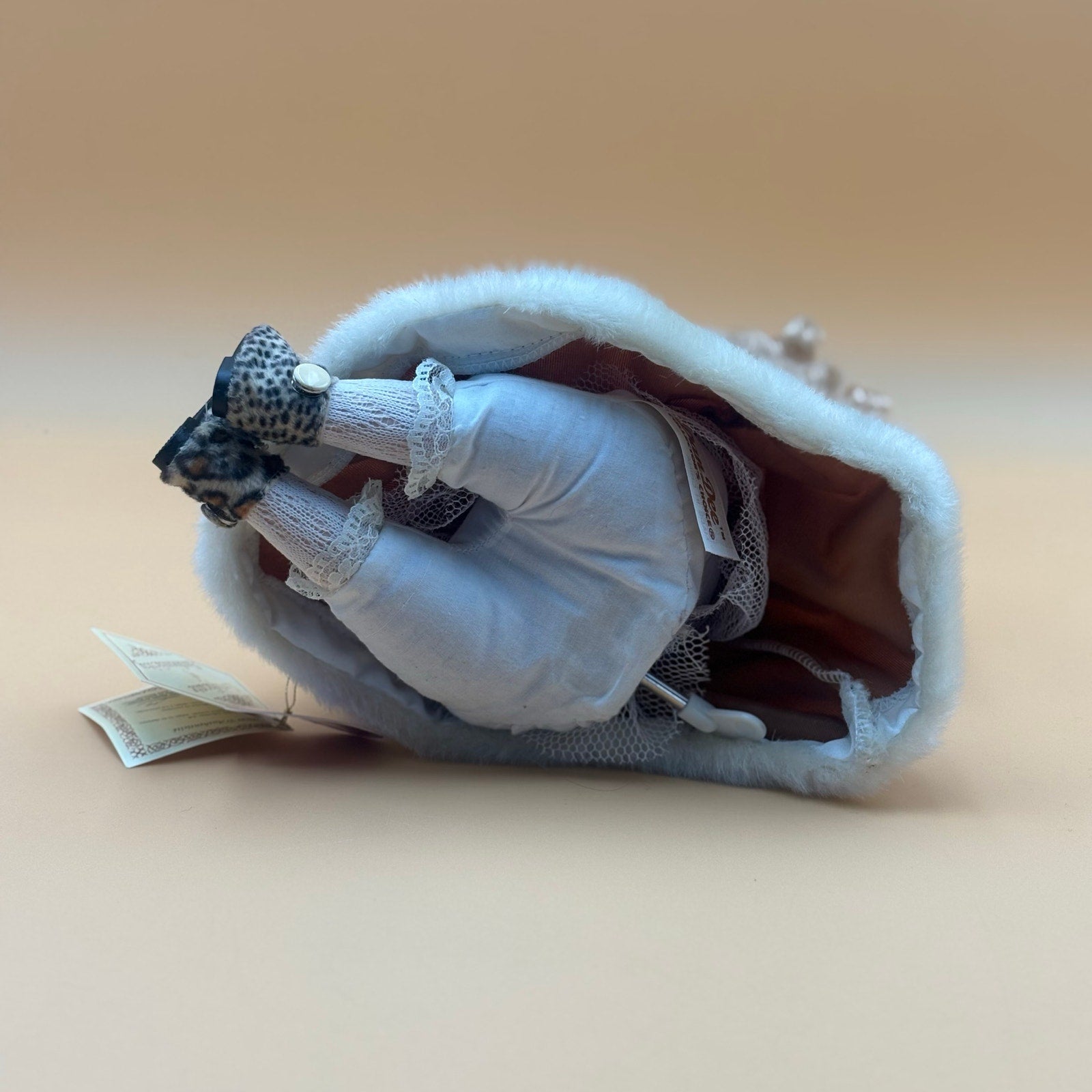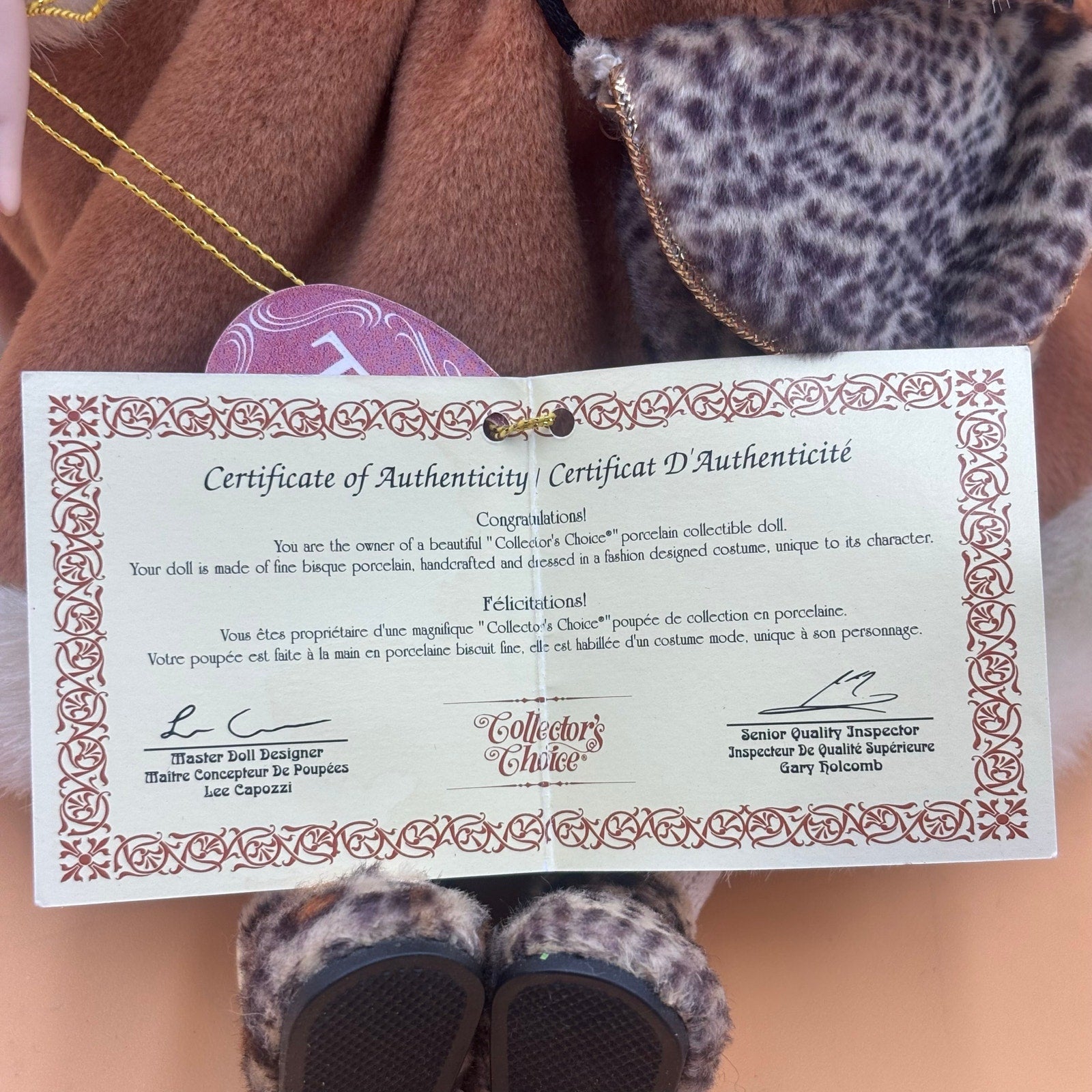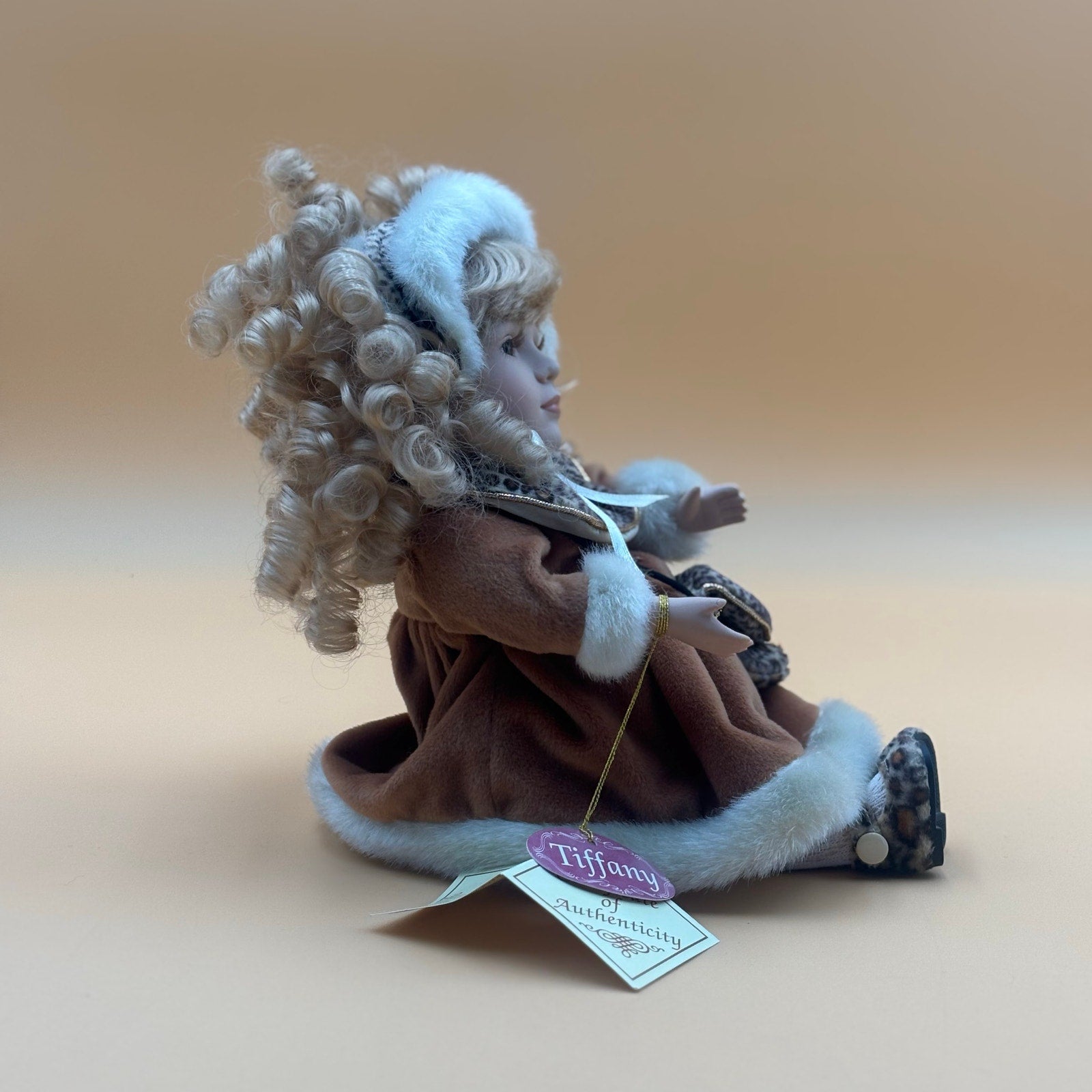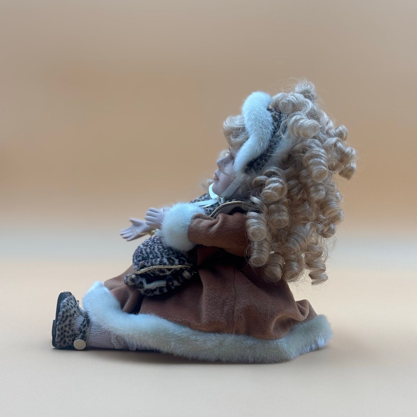 Charming animated porcelain doll from the Collector’s Choice series by Lee Capozzi, complete with Certificate of Authenticity. This fine bisque porcelain doll gently moves and plays music when activated. She features soft blonde curls, brown eyes, and a hand-painted face. Dressed in a rich caramel-brown winter coat trimmed in white faux fur, accented with leopard-print details and a matching purse. Perfect for holiday displays or collector shelves.