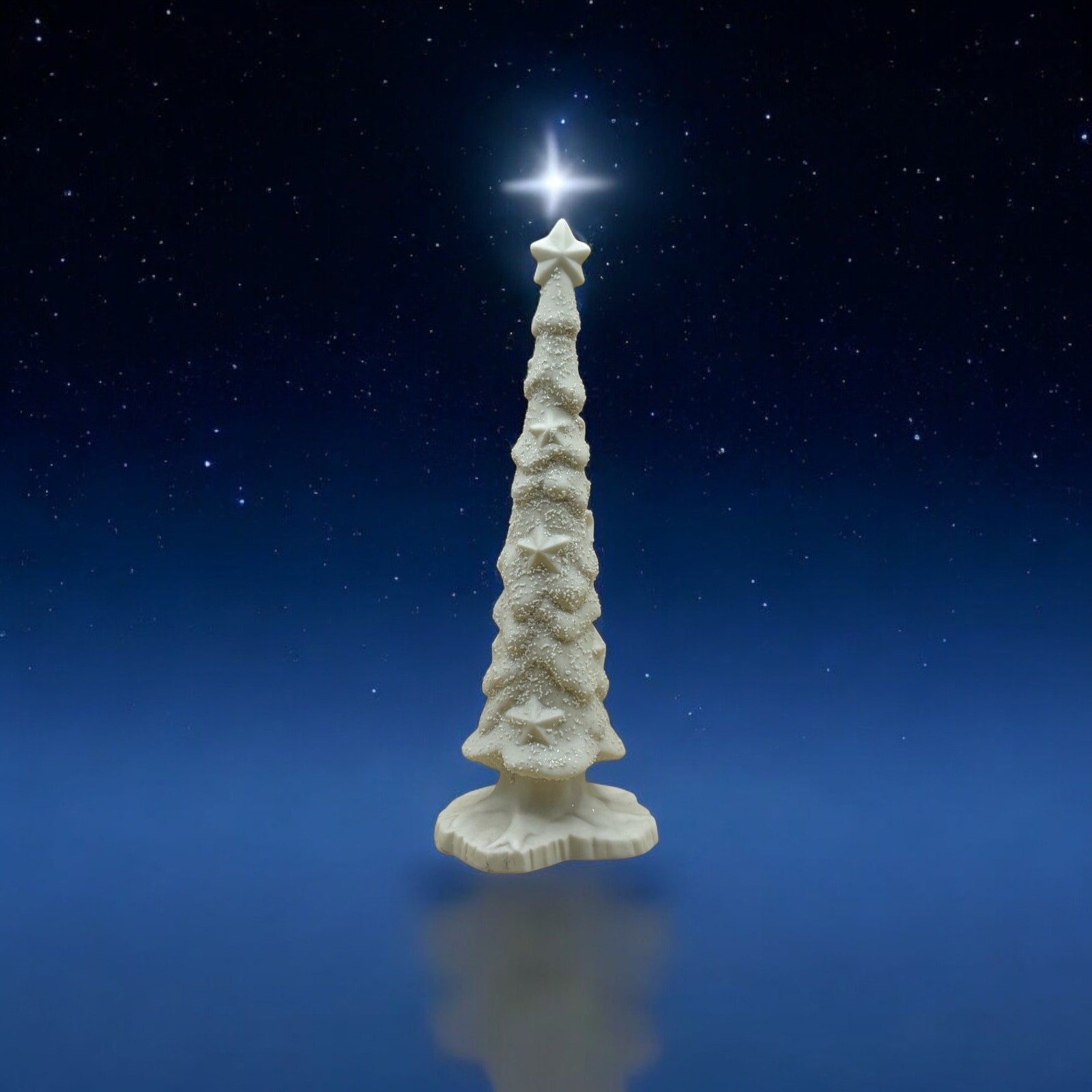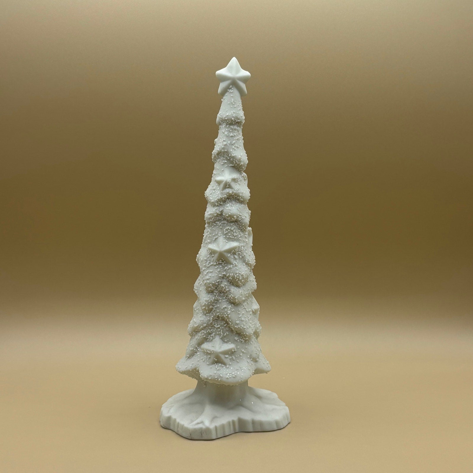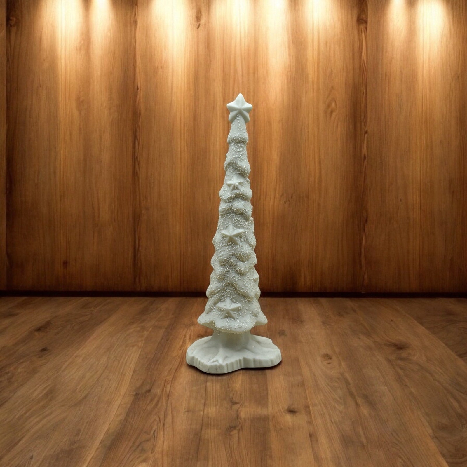 Elegant ceramic bisque Christmas tree with textured snow effect and star topper. Pure white finish with dimensional snowflake details throughout. Decorative scalloped base. Perfect for winter or holiday decor.