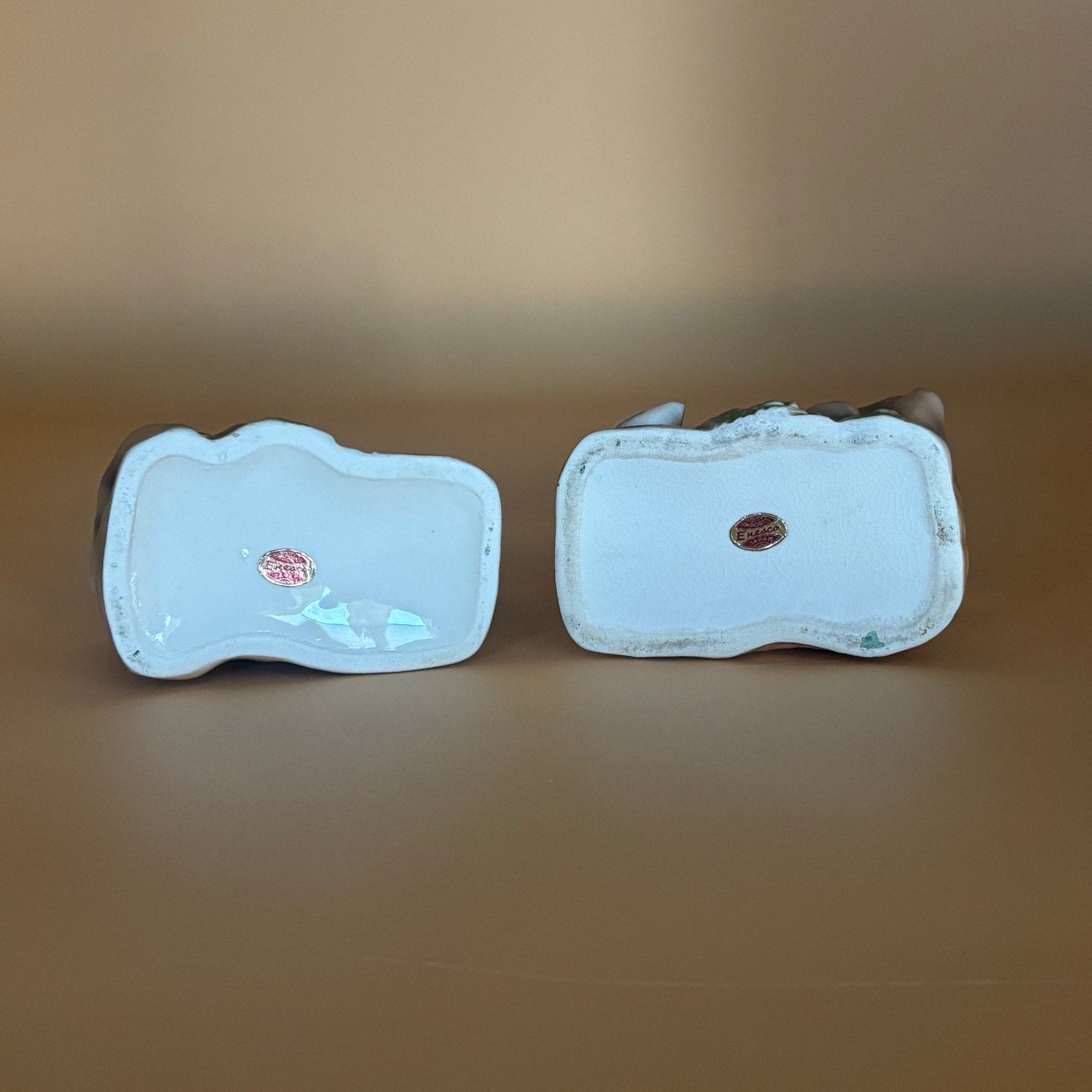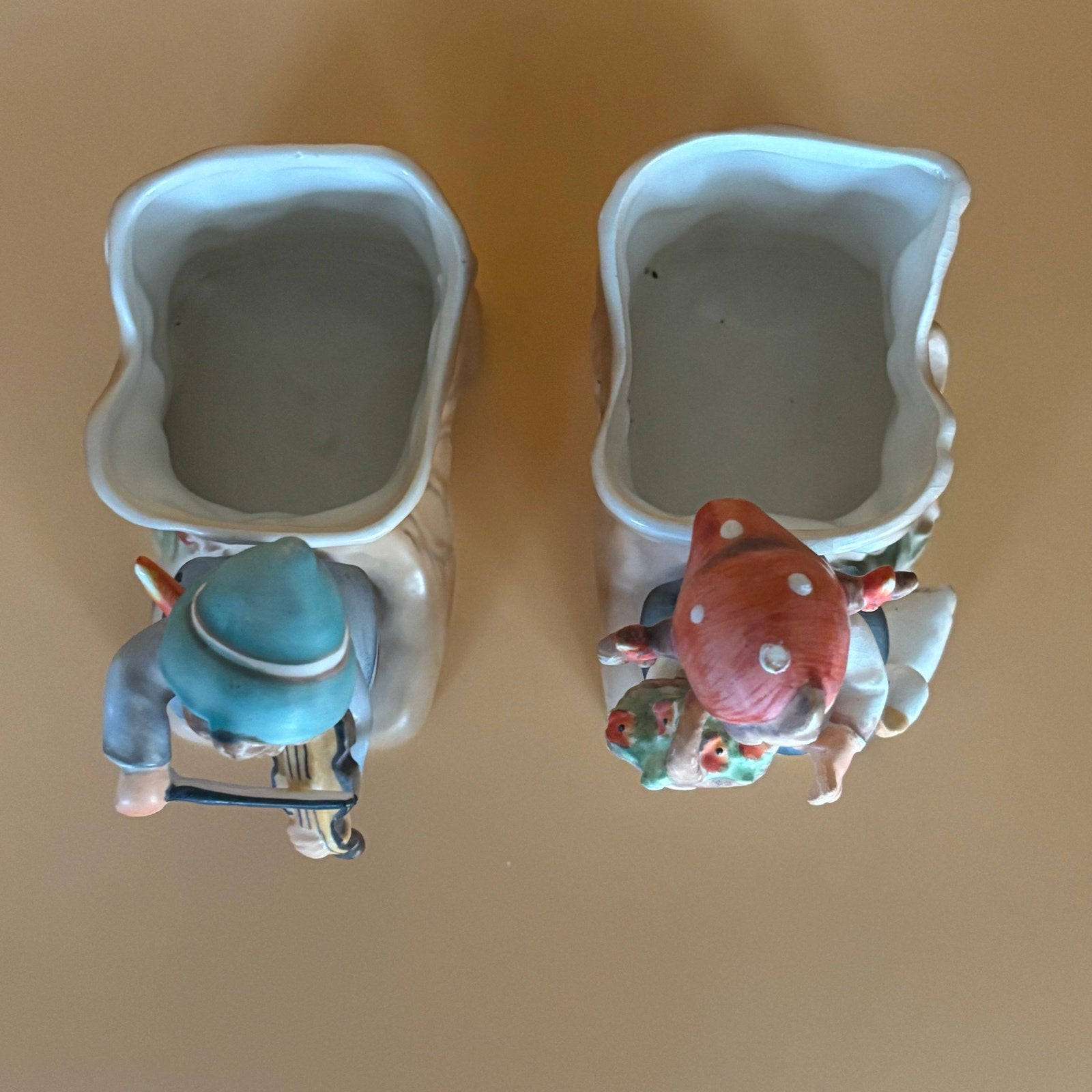 Charming vintage ceramic figurine planters marked Enesco. One features a girl with a basket and a goose, the other a boy playing a violin with a bird on his shoulder. Both are attached to tree stump-style planters with floral accents. Sold as a set.