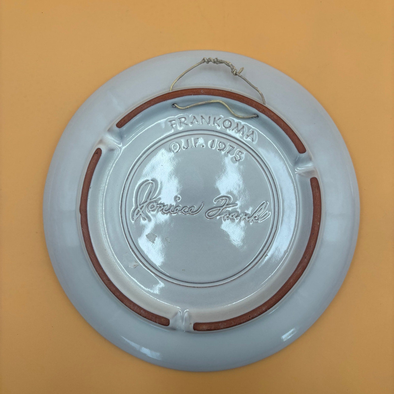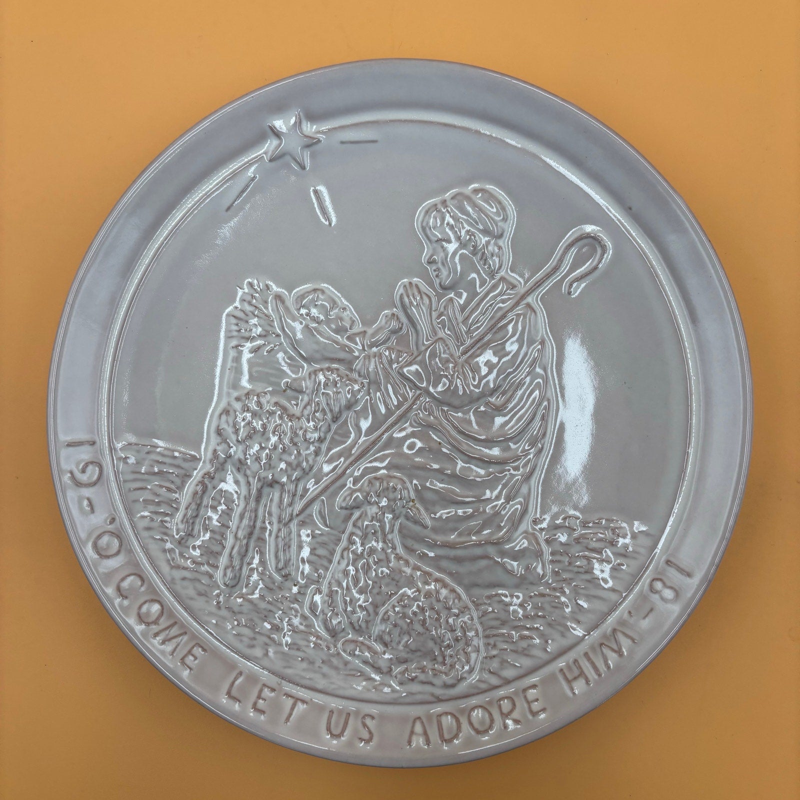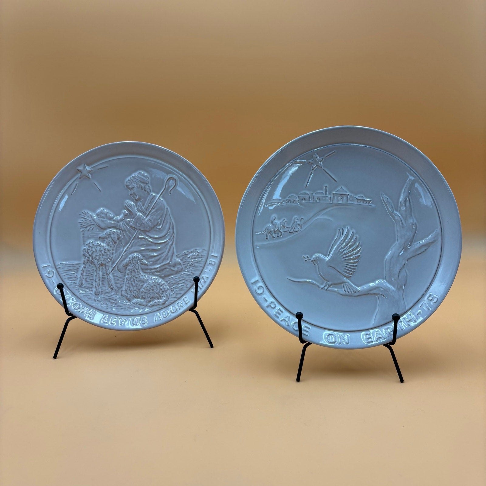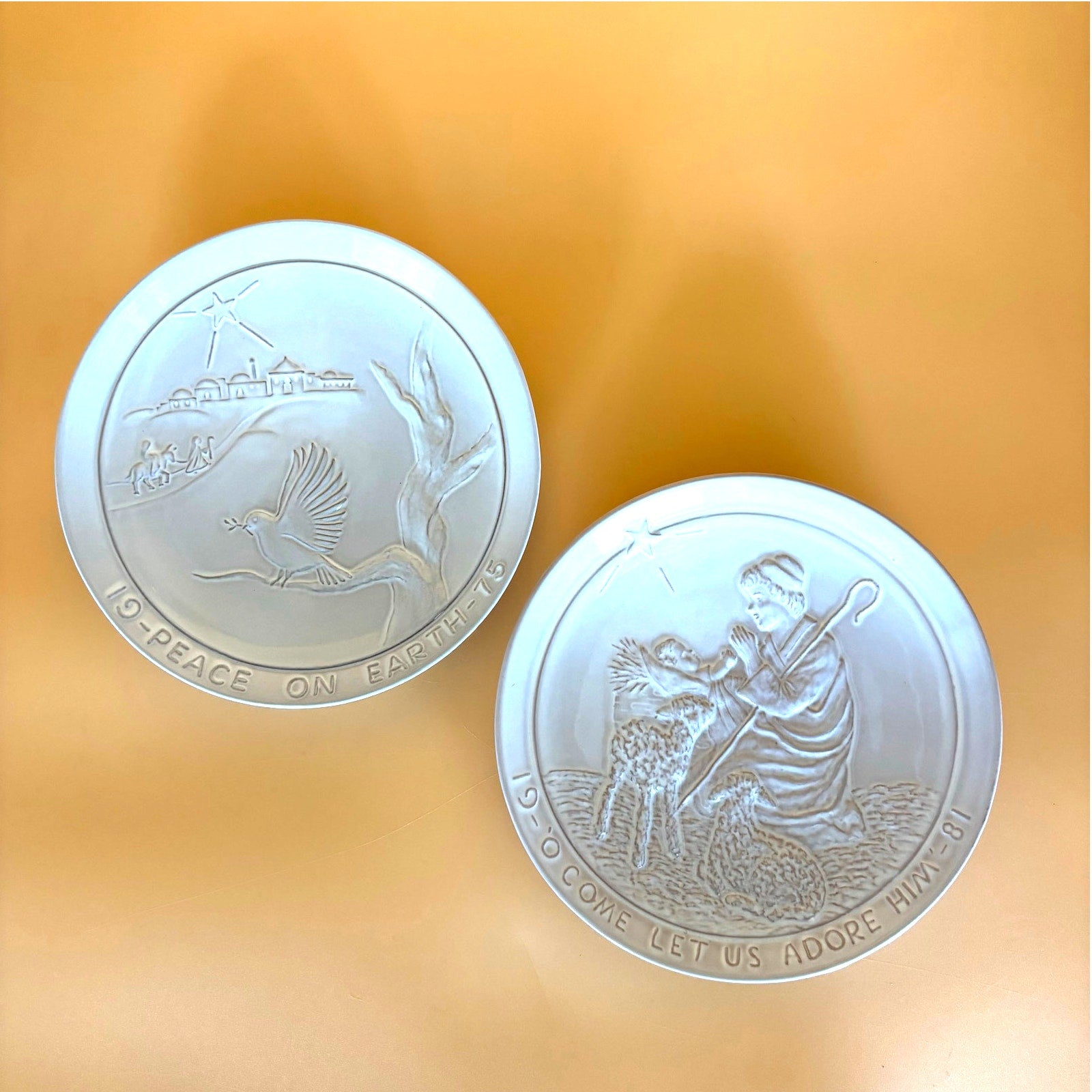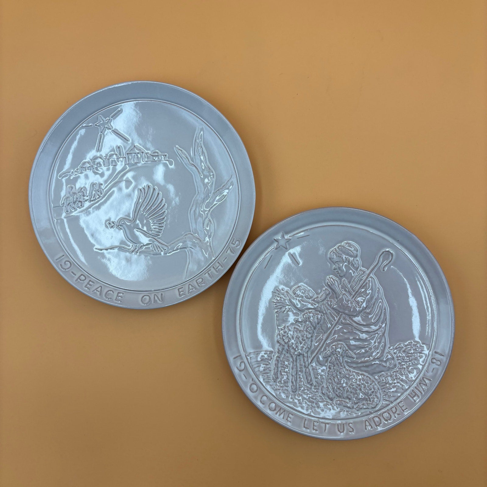 Set of 2 vintage Frankoma ceramic wall plates, signed by Jeriicee Frank. One plate reads “1975 Peace on Earth” and depicts a dove and nativity village. The other reads “1981 O Come Let Us Adore Him” and shows a shepherd with sheep. Both are glazed in soft white with embossed detail and come with attached hanging wires.