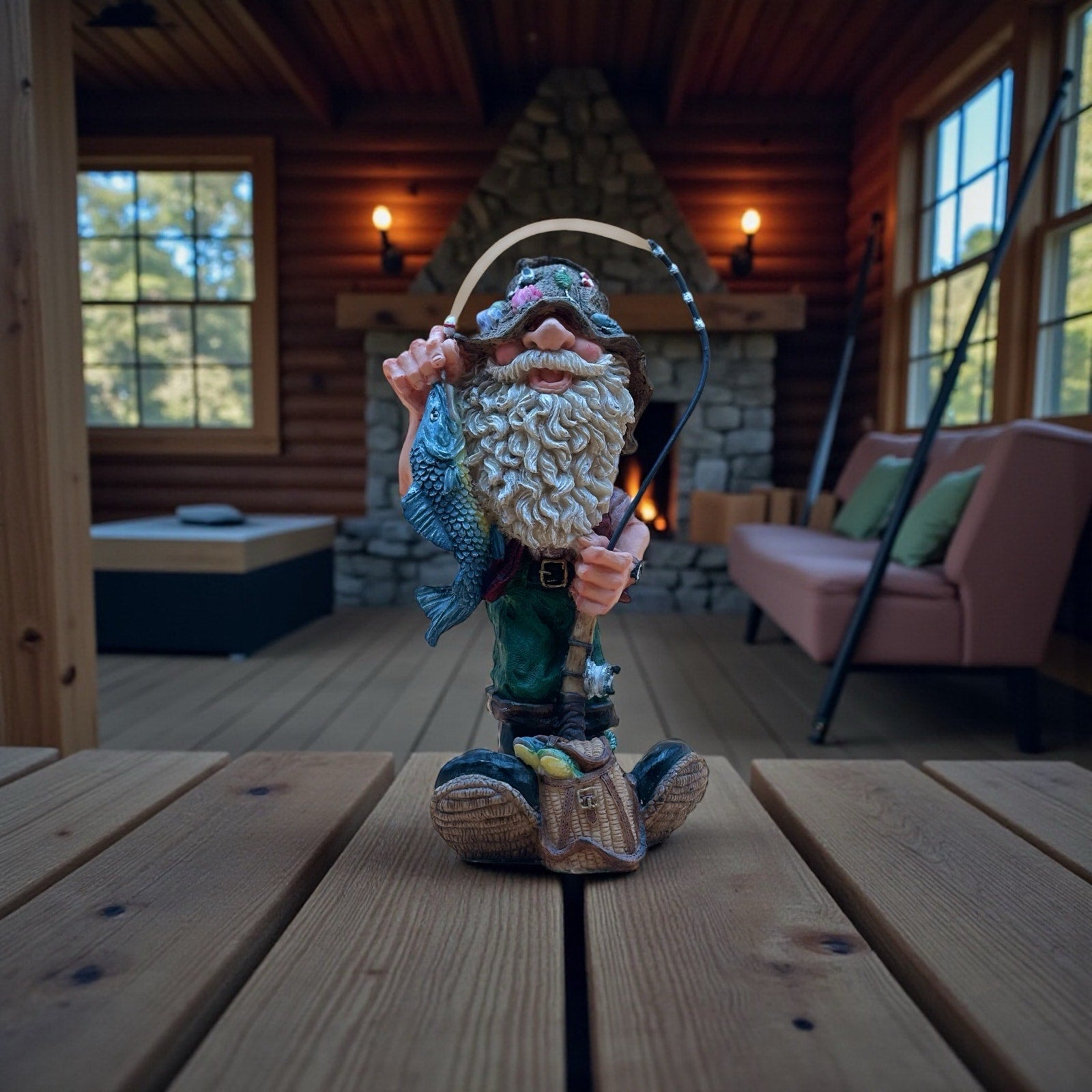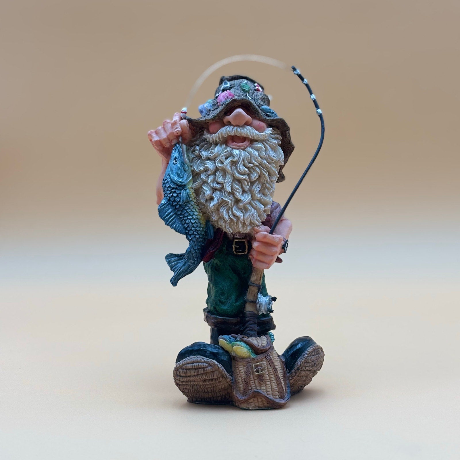 Whimsical resin fisherman figurine featuring a bearded hillbilly proudly holding his fish catch. Decorated with fishing lures on his hat, a fishing rod in hand, and detailed textures on his boots and gear. A fun collectible or gift for fishing lovers and cabin décor.