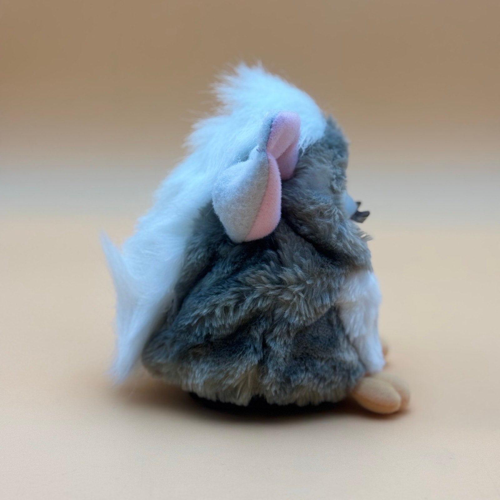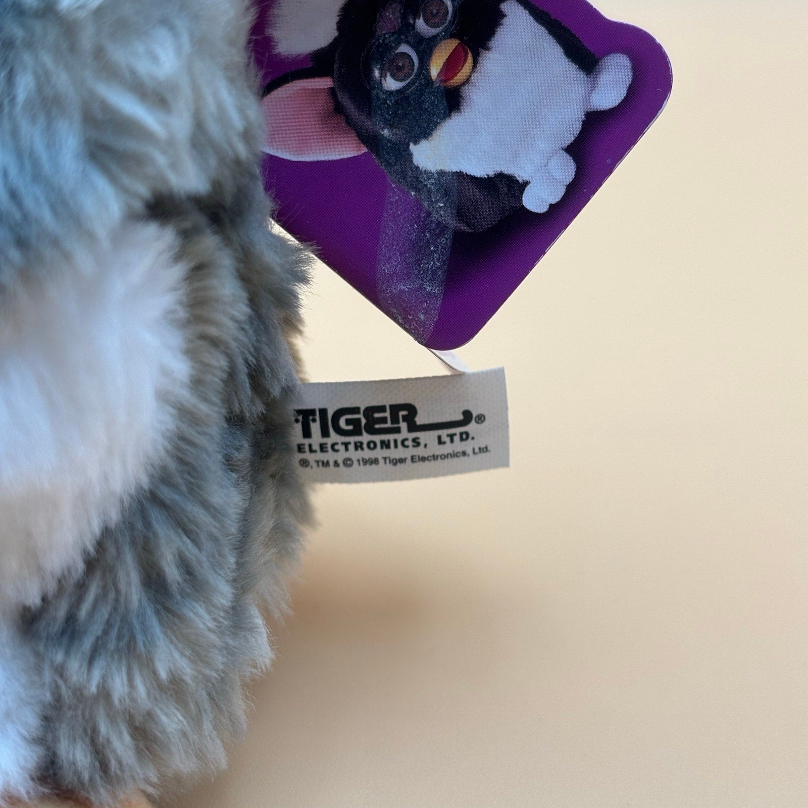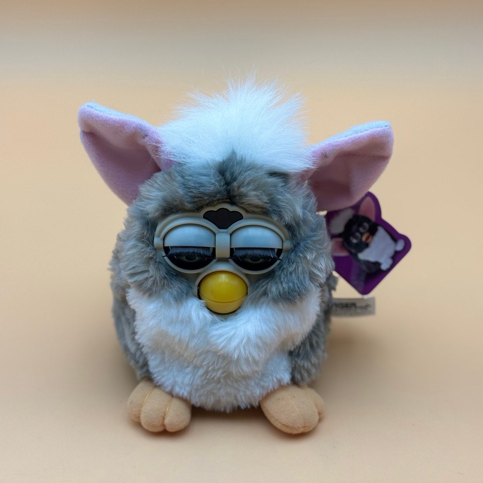 Adorable 1998 Tiger Electronics Furby in gray and white. Original tag attached. Comes with its original box, which shows visible wear and could use additional cleaning. Furby powers on and works properly (batteries not included). A fun nostalgic collectible from the first Furby release.