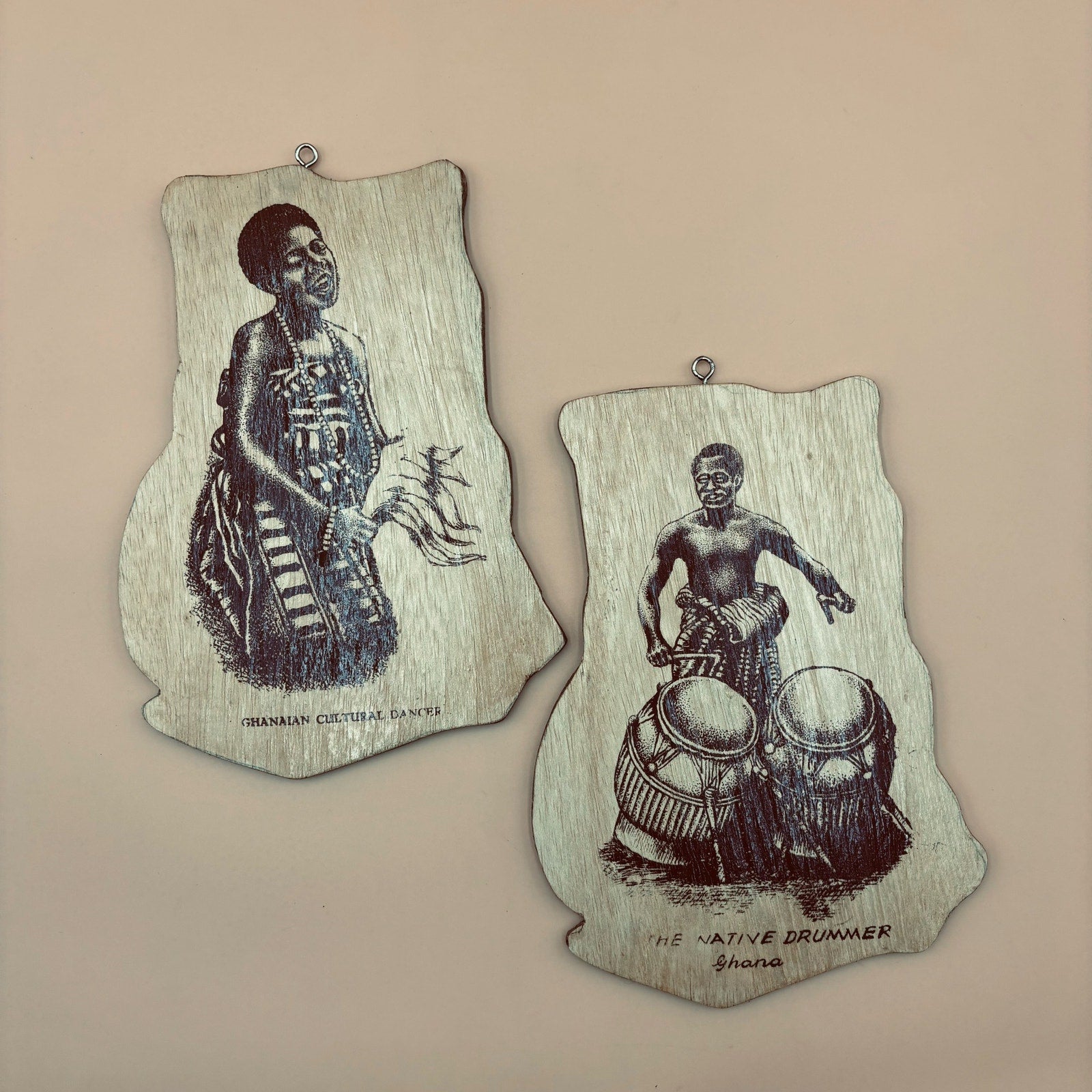 Set of two plywood wall plaques featuring Ghanaian cultural art β one of a native drummer and the other of a traditional dancer. Each piece is signed and depicts fine linework with authentic regional detail. Lightweight with attached hangers on the back, ready for wall display.