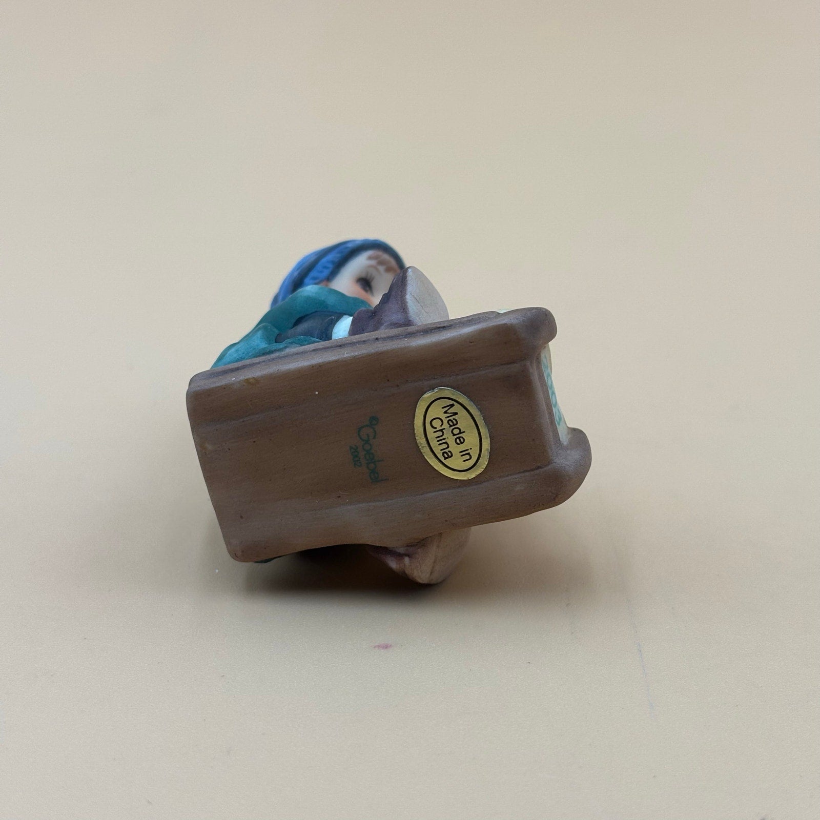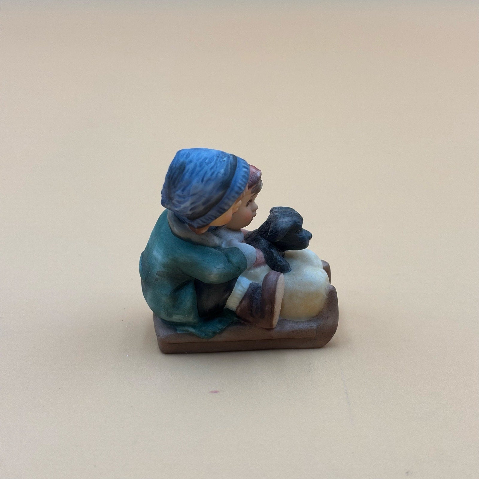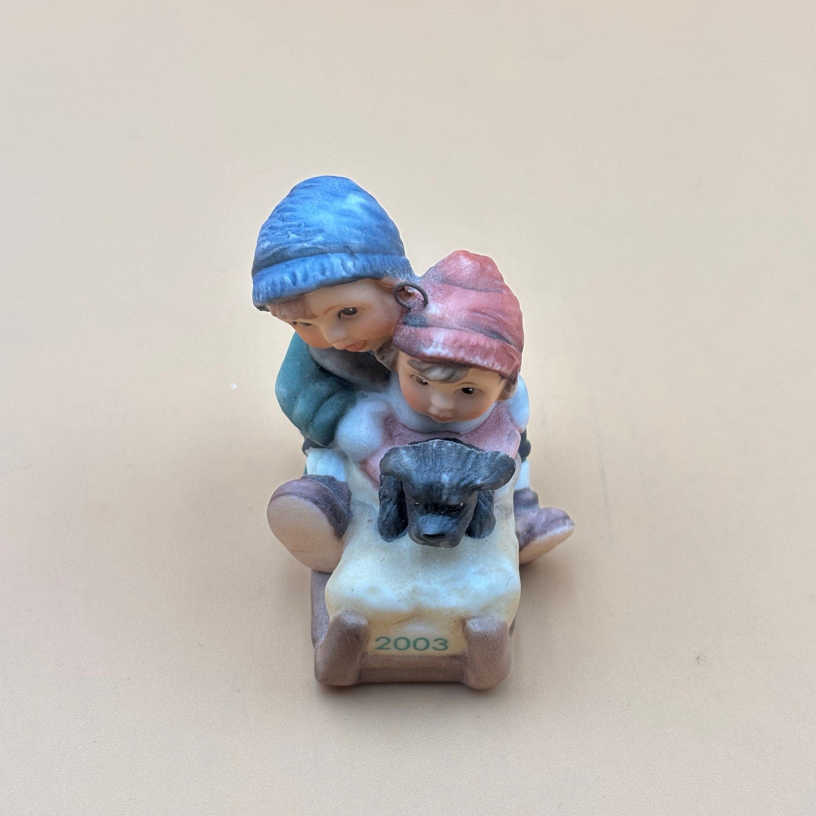Adorable Goebel 2003 ornament featuring a boy and girl bundled in winter hats, sitting together on a sled with a small black puppy. Made of resin with fine hand-painted details and a small loop for hanging. Perfect for collectors or as a nostalgic addition to your holiday decor.