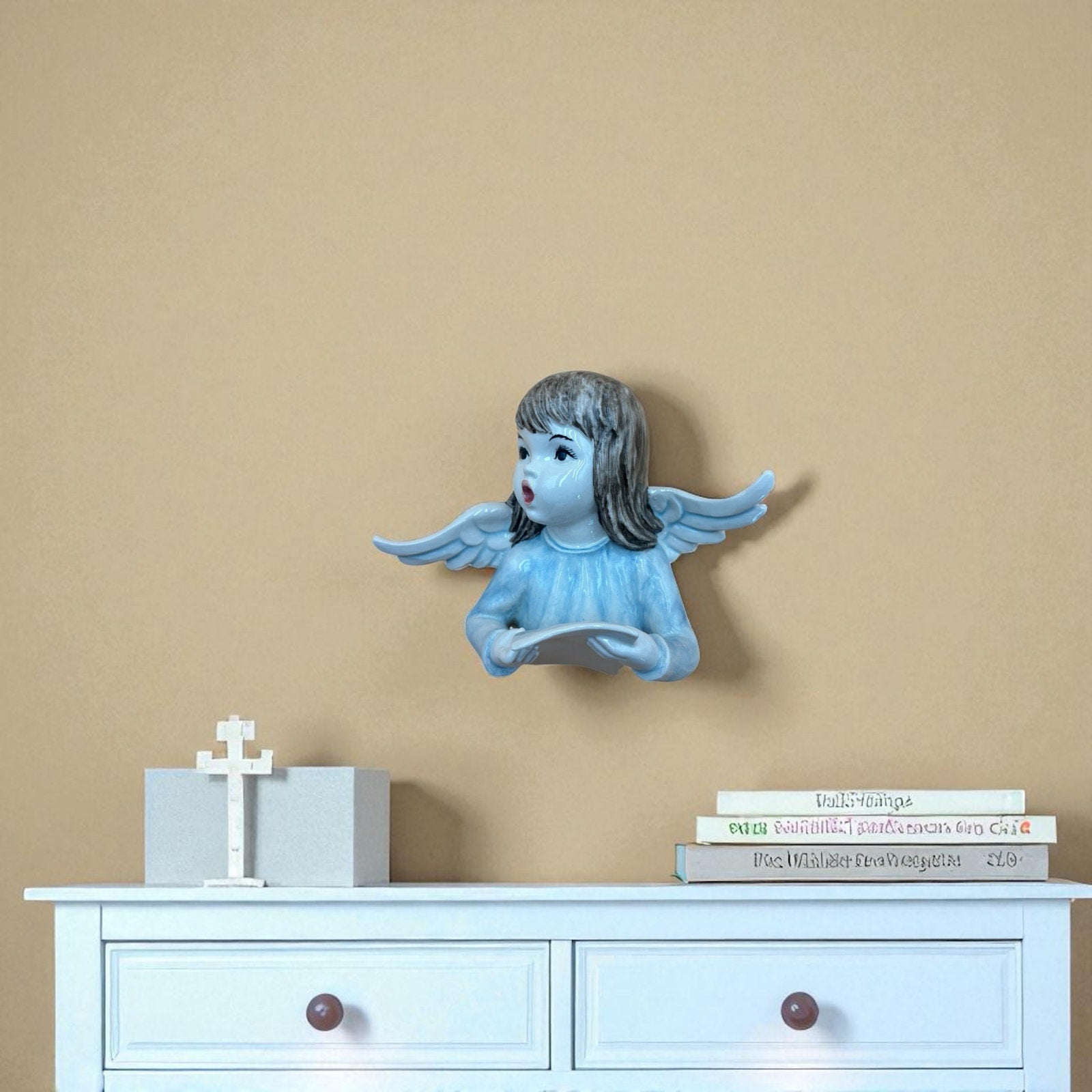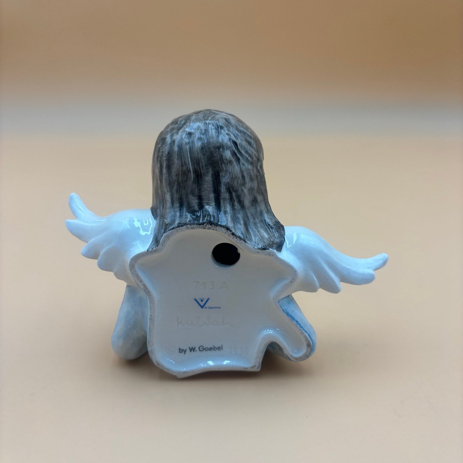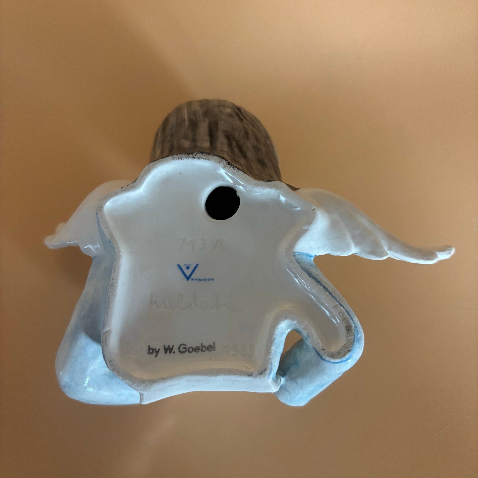 Vintage Goebel ceramic wall plaque, model 713A, signed Huldah and dated 1959. Made in West Germany by W. Goebel. Features a young angel with brown hair, blue robe, and outstretched wings holding a book. Blue “V” Goebel mark stamped on base.