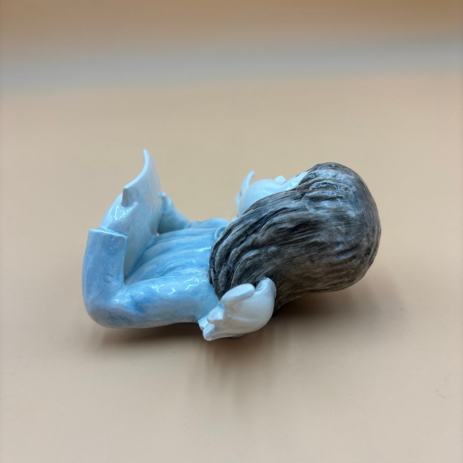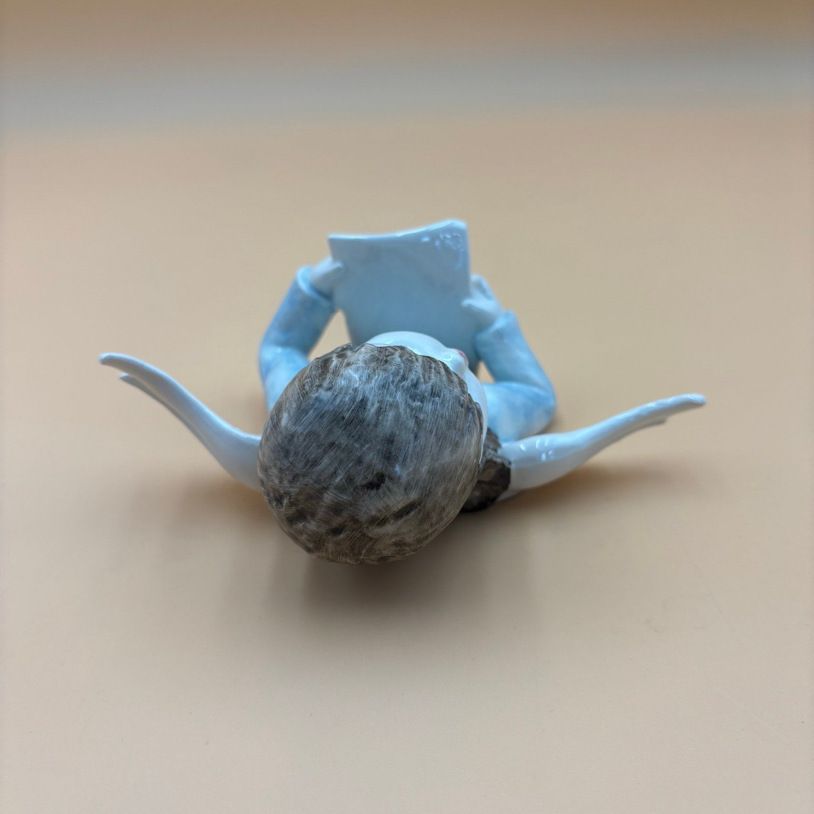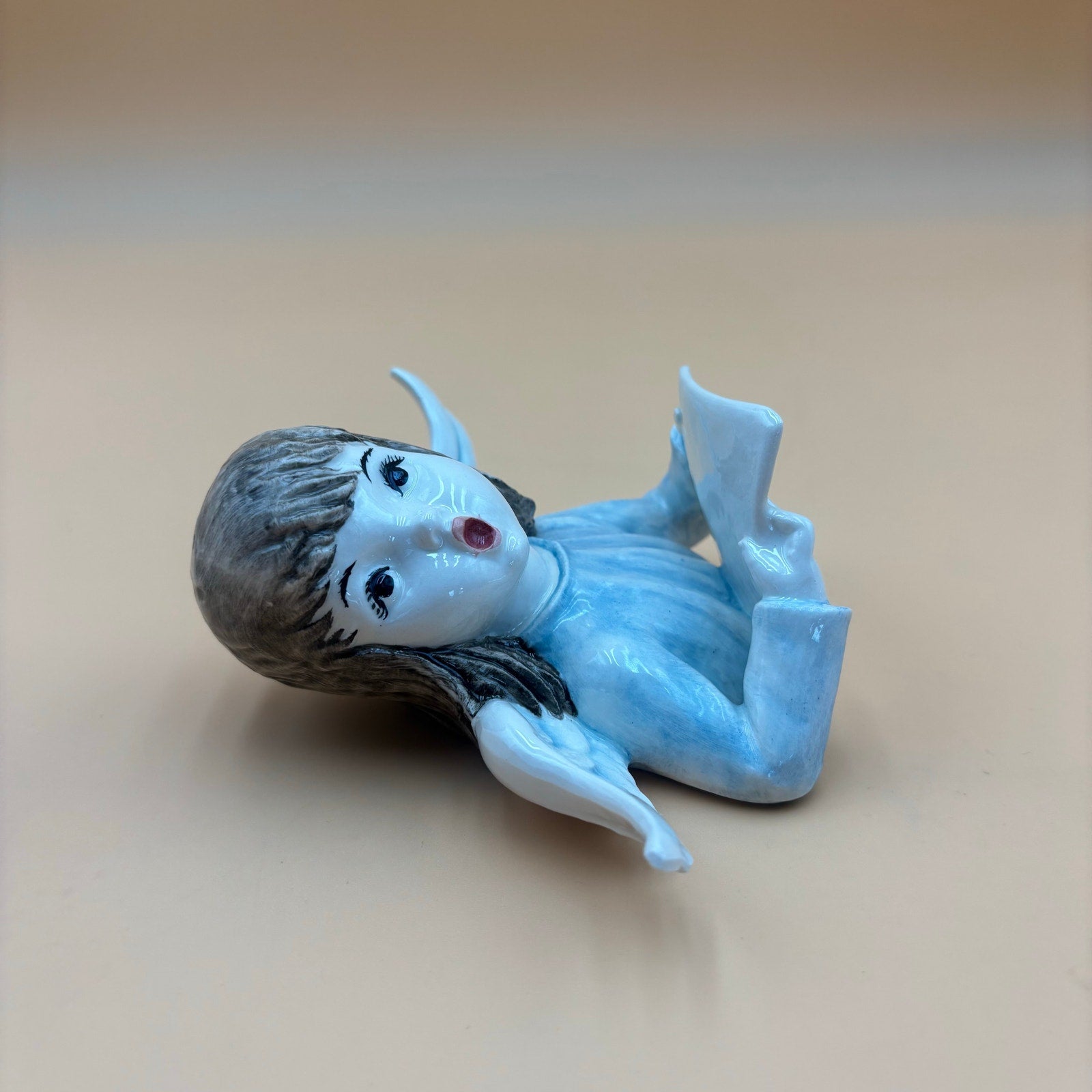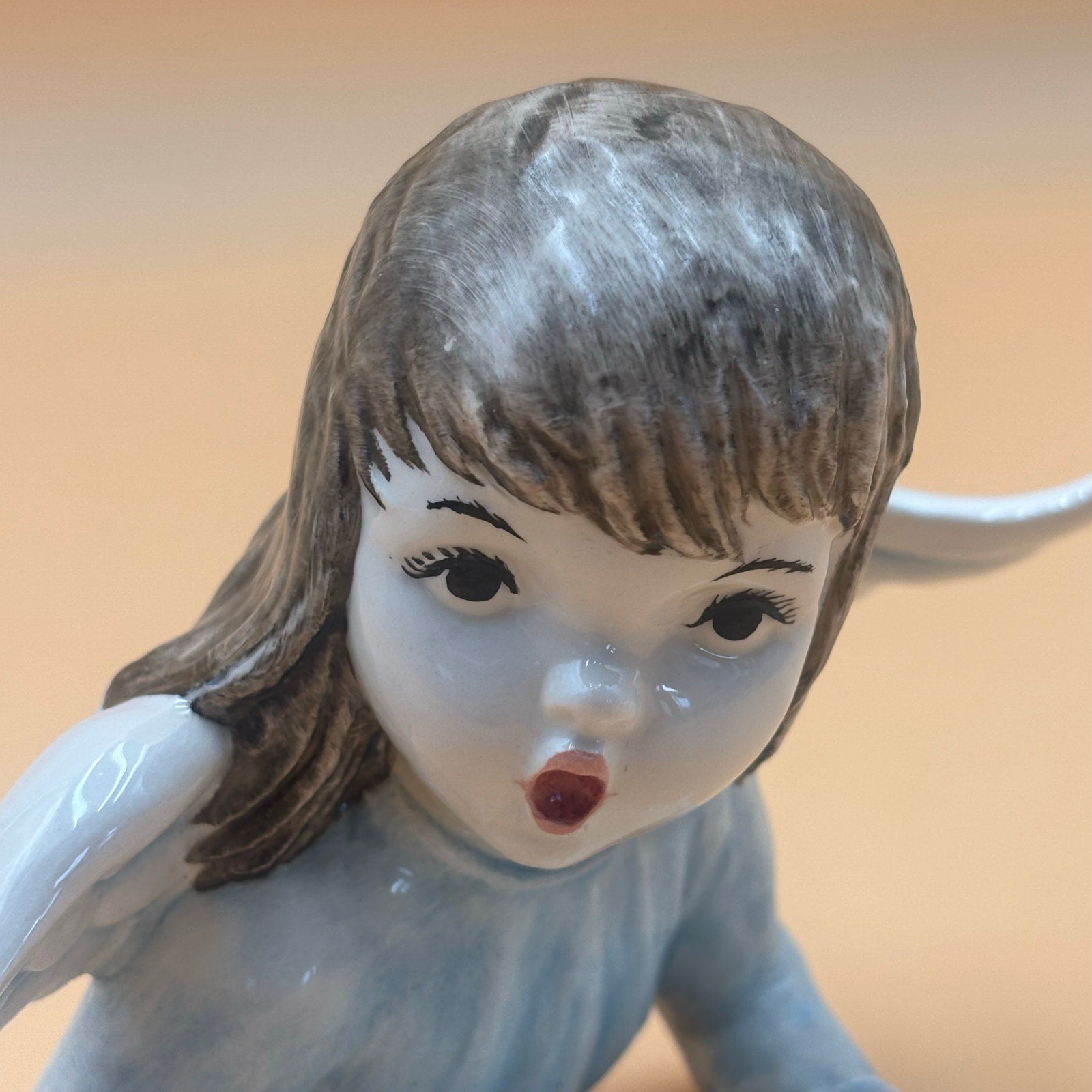 Vintage Goebel ceramic wall plaque, model 713A, signed Huldah and dated 1959. Made in West Germany by W. Goebel. Features a young angel with brown hair, blue robe, and outstretched wings holding a book. Blue “V” Goebel mark stamped on base.