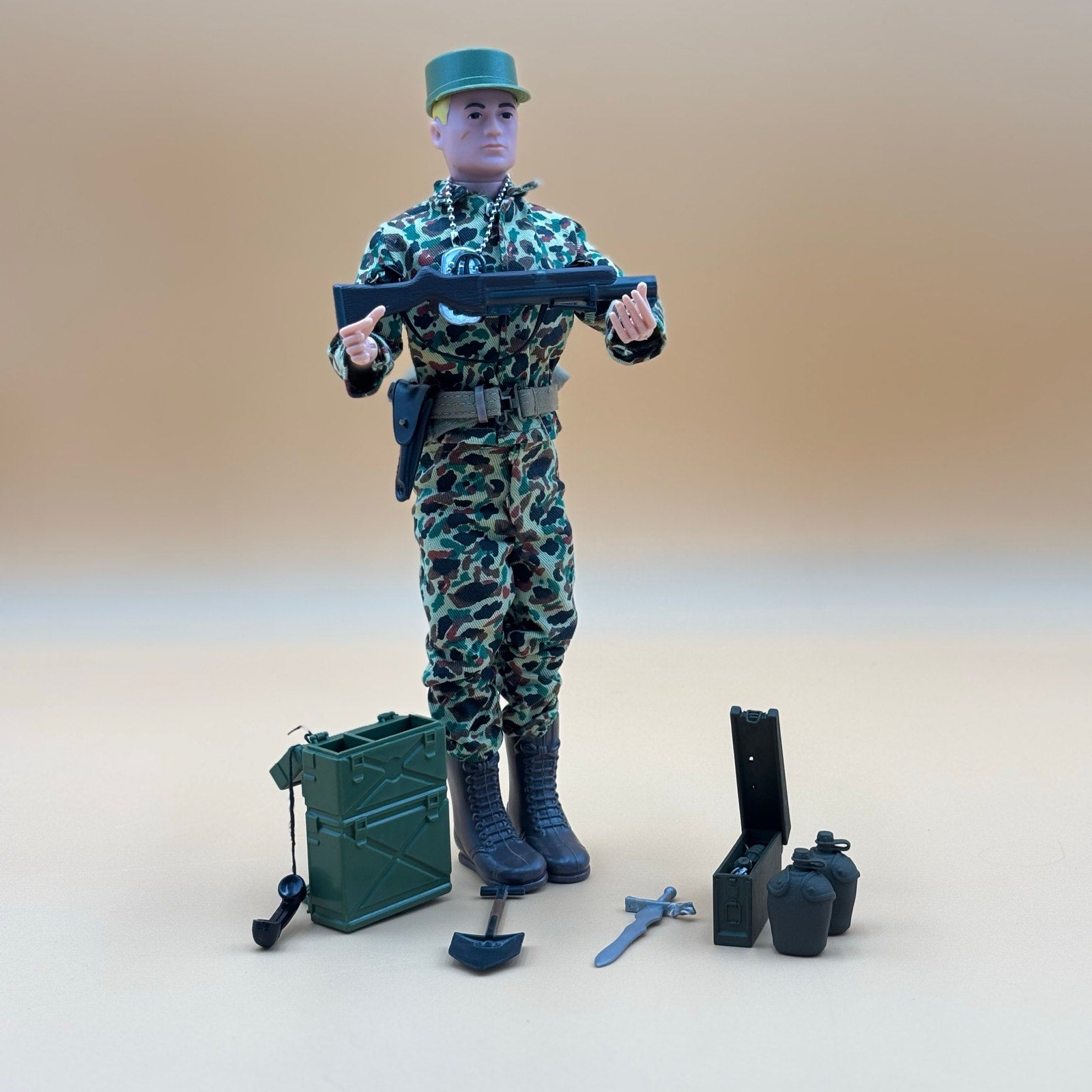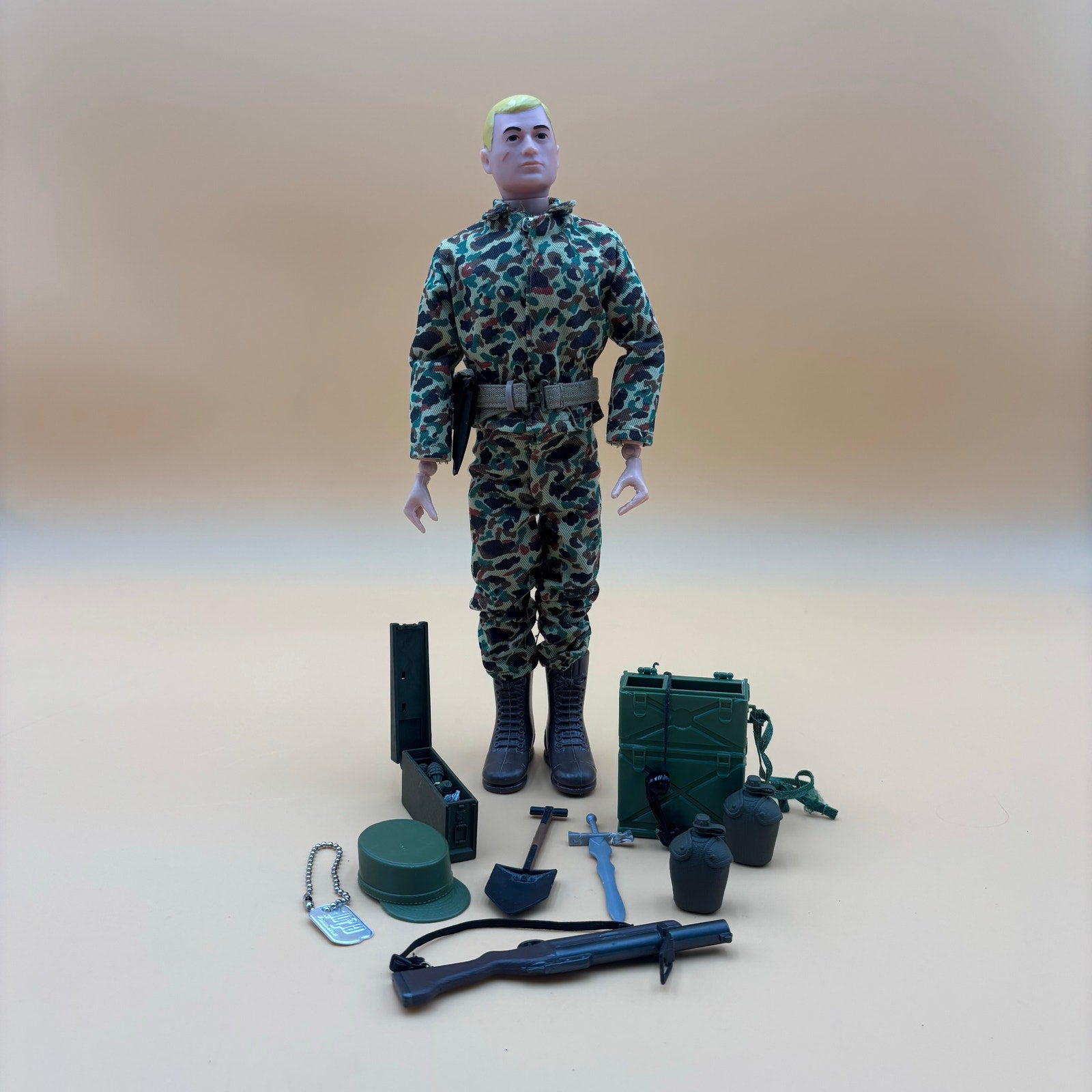 • Dressed in a woodland camouflage uniform with belt and dog tags.