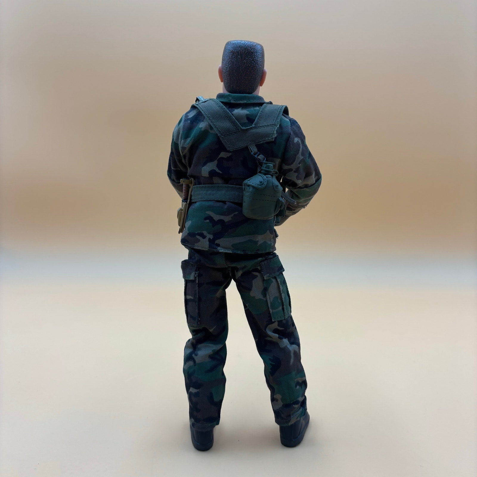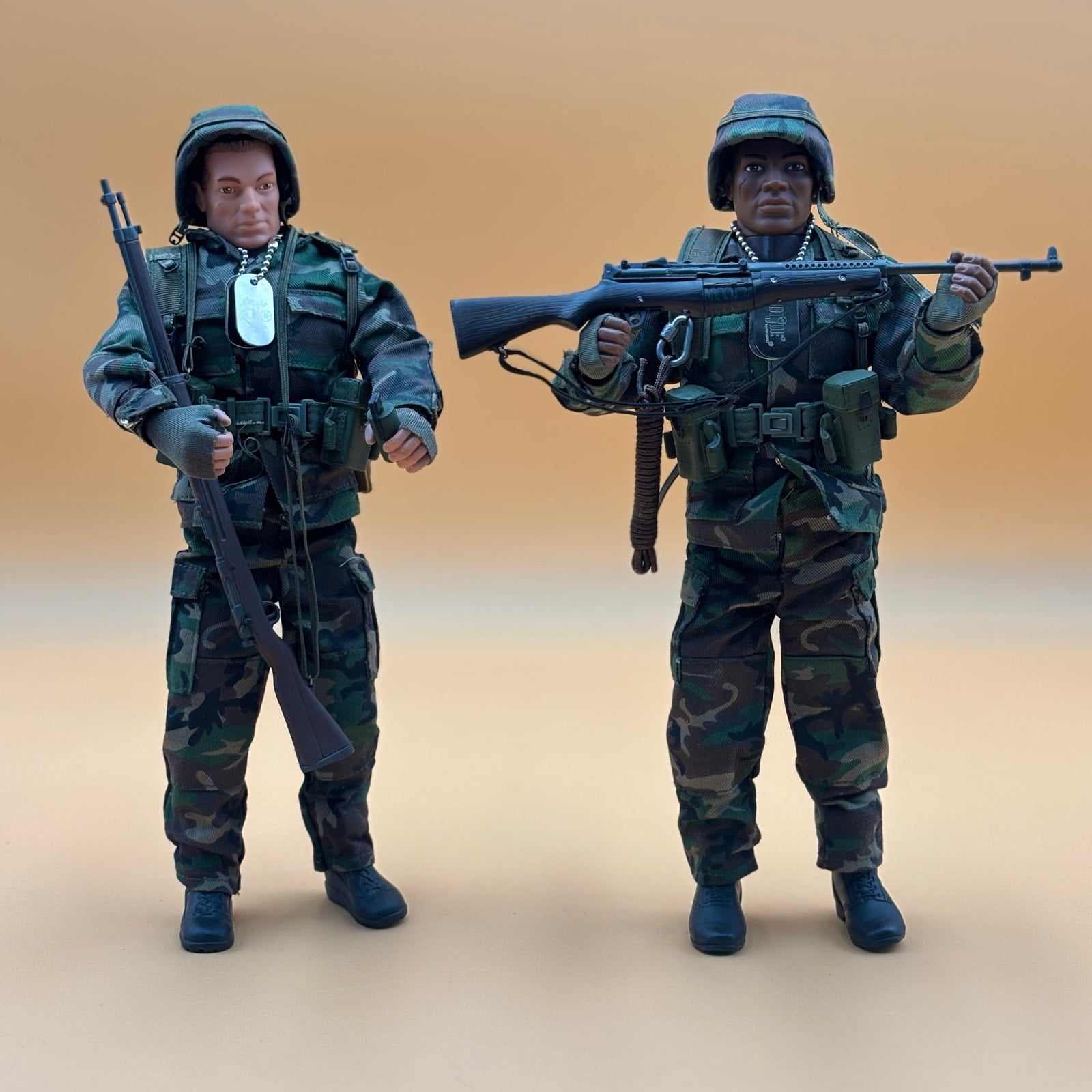 Pair of Hasbro G.I. Joe Classic Collection (1996) 12-inch articulated action figures in woodland camouflage uniforms. Each figure comes with its own gun and additional gear: