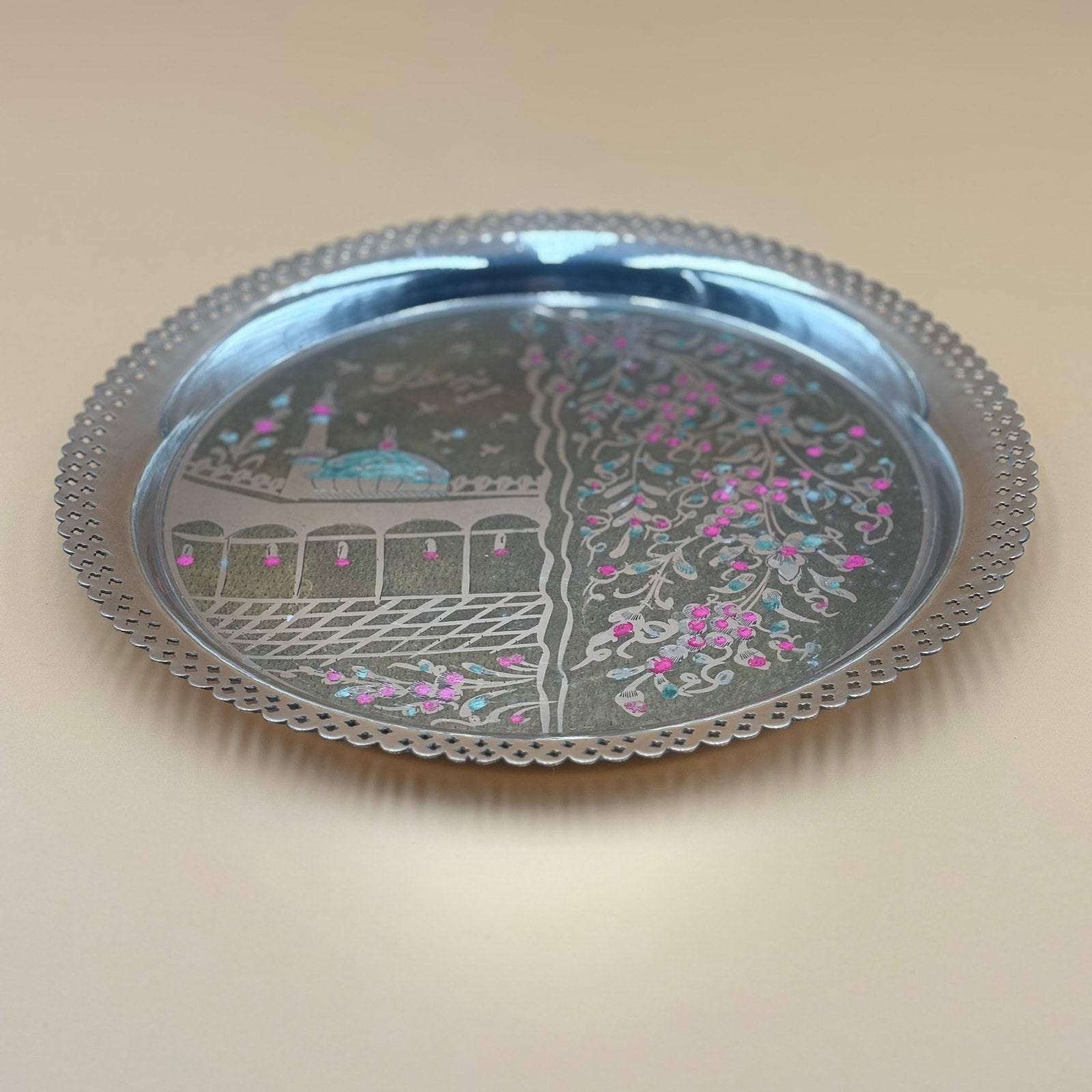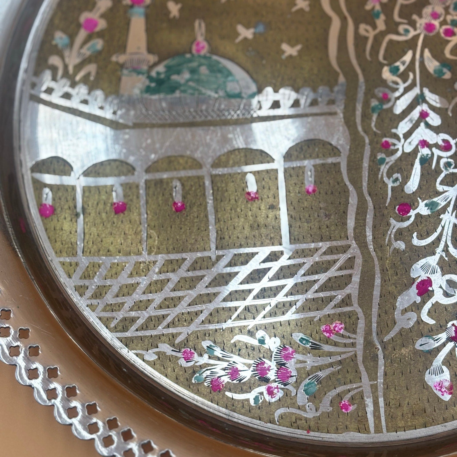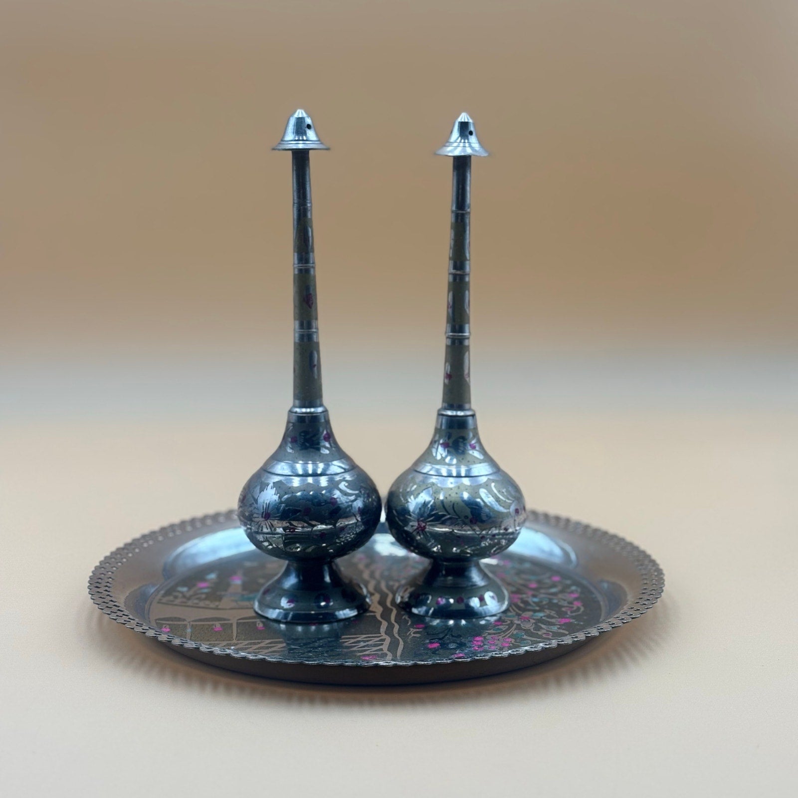 Intricately hand-painted India three-piece holy water set featuring two tall containers and a matching tray. The round tray has ornate painted detail with floral and architectural motifs. Each vessel varies slightly in tone and pattern, giving the set a unique handcrafted look.