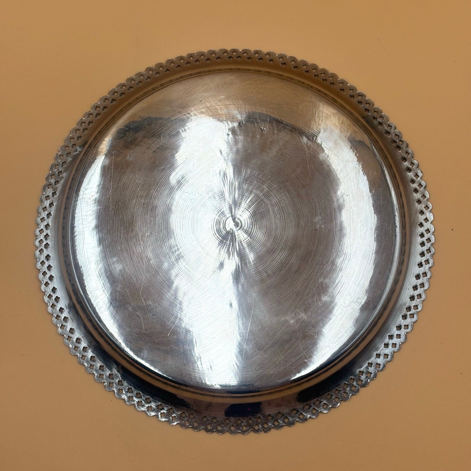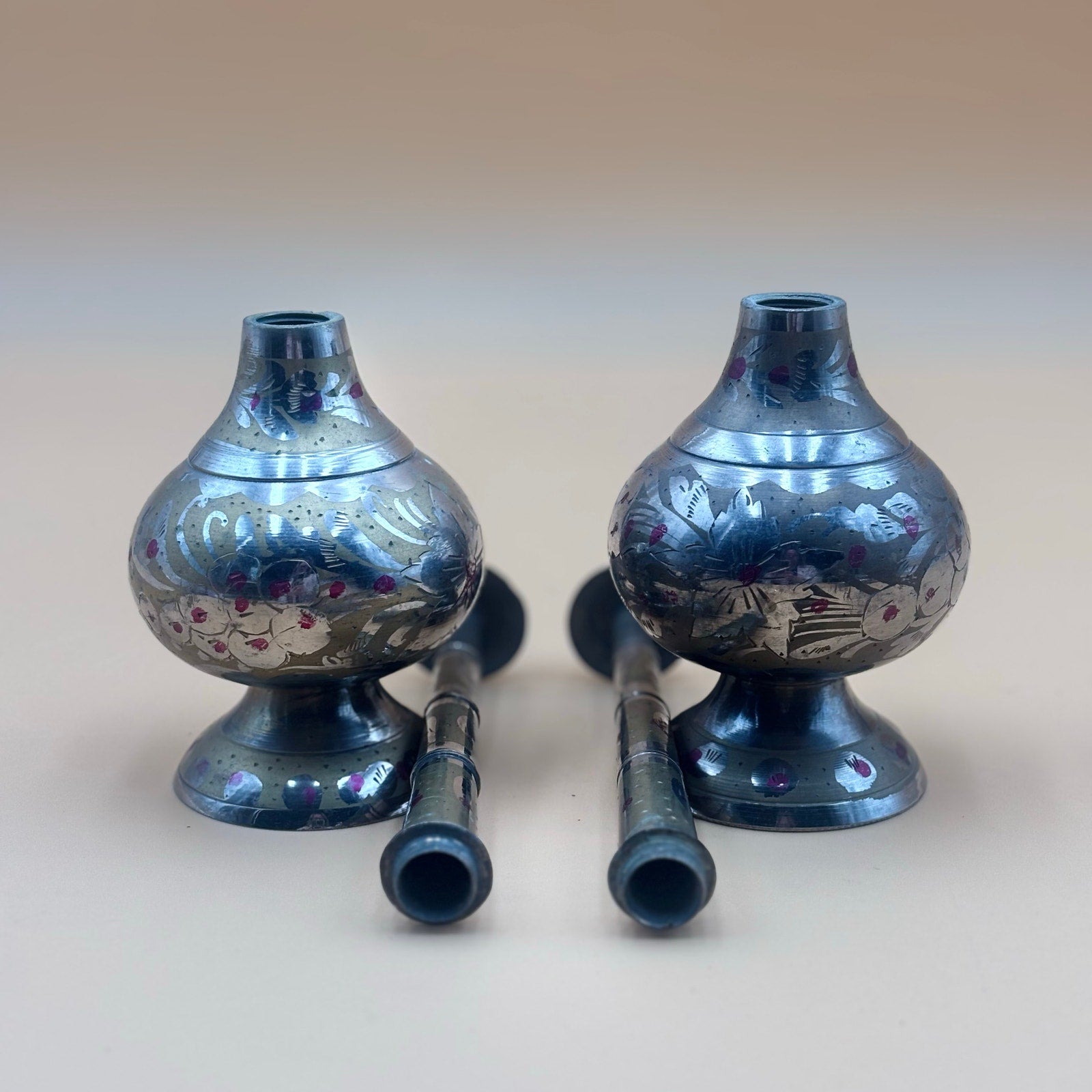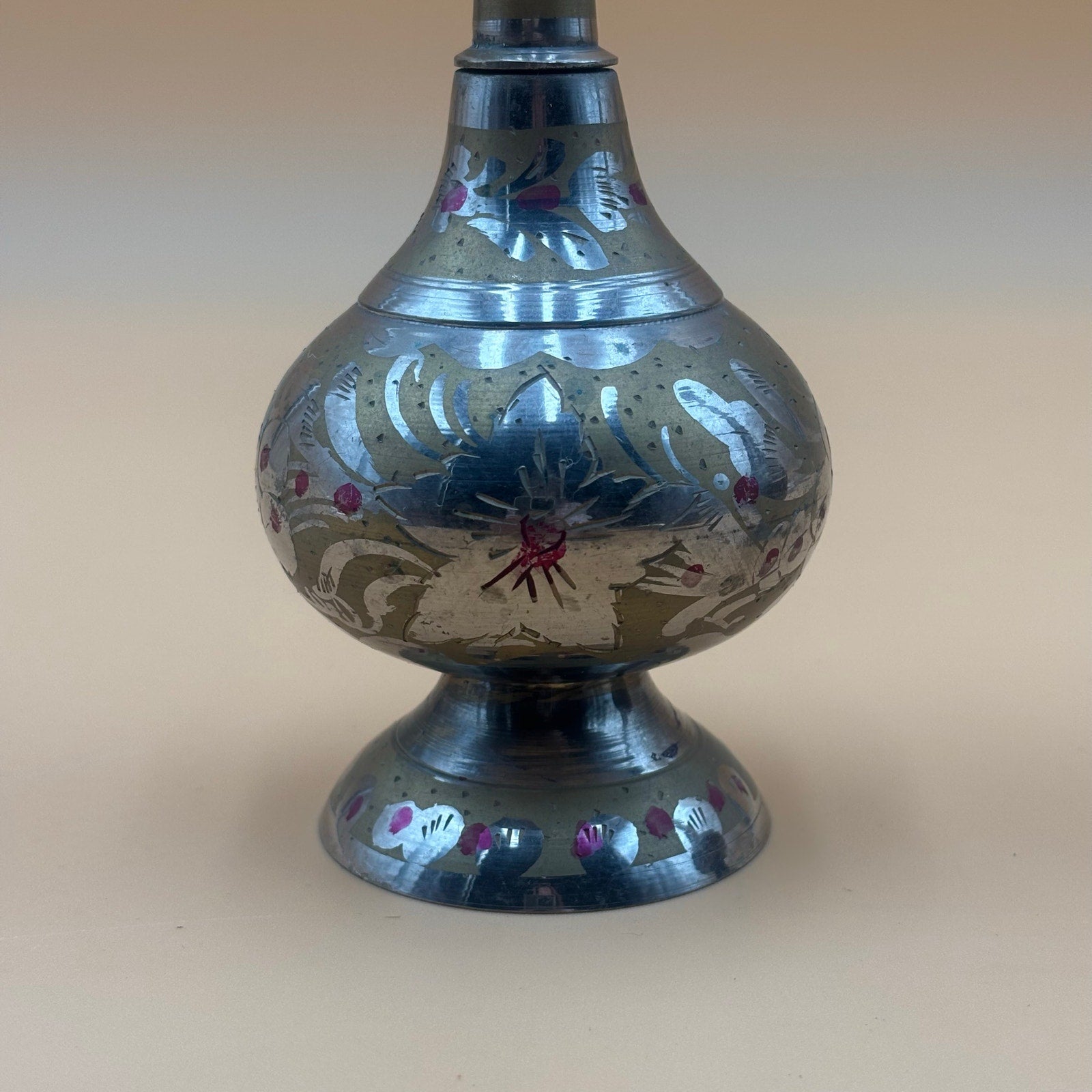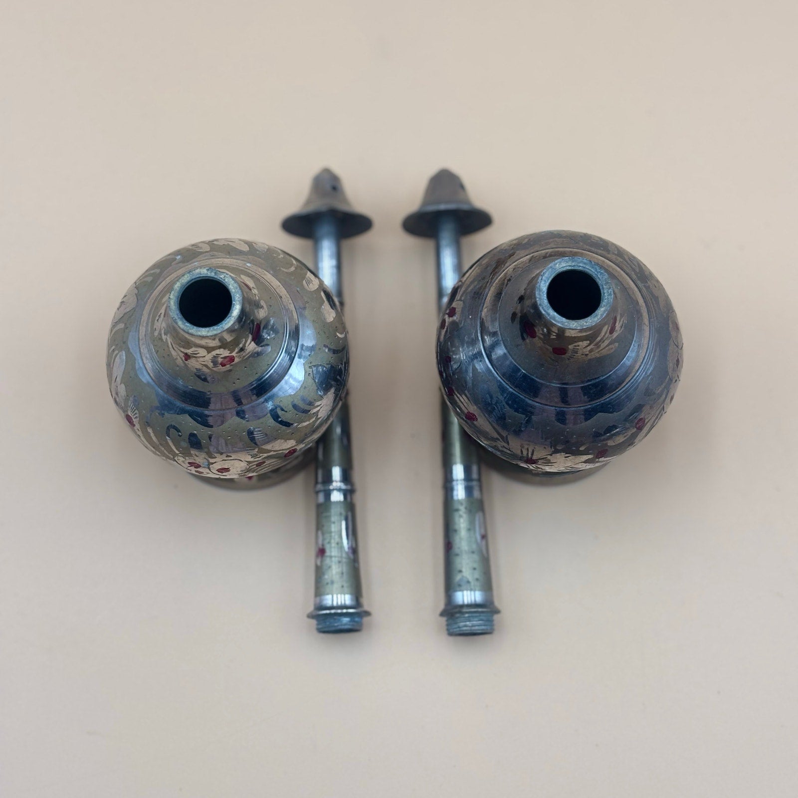 Intricately hand-painted India three-piece holy water set featuring two tall containers and a matching tray. The round tray has ornate painted detail with floral and architectural motifs. Each vessel varies slightly in tone and pattern, giving the set a unique handcrafted look.