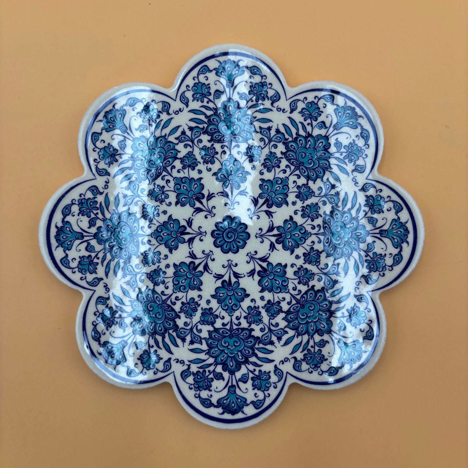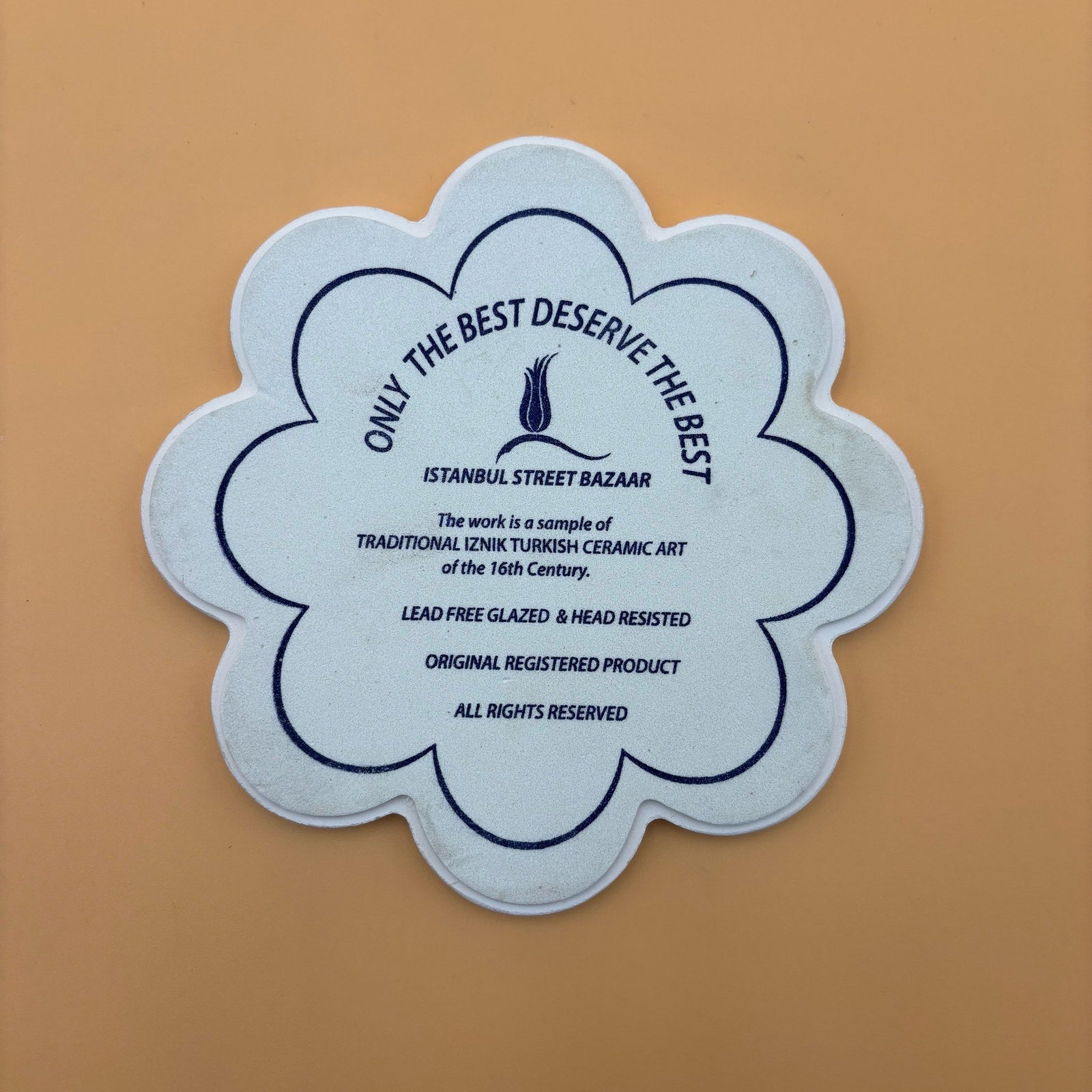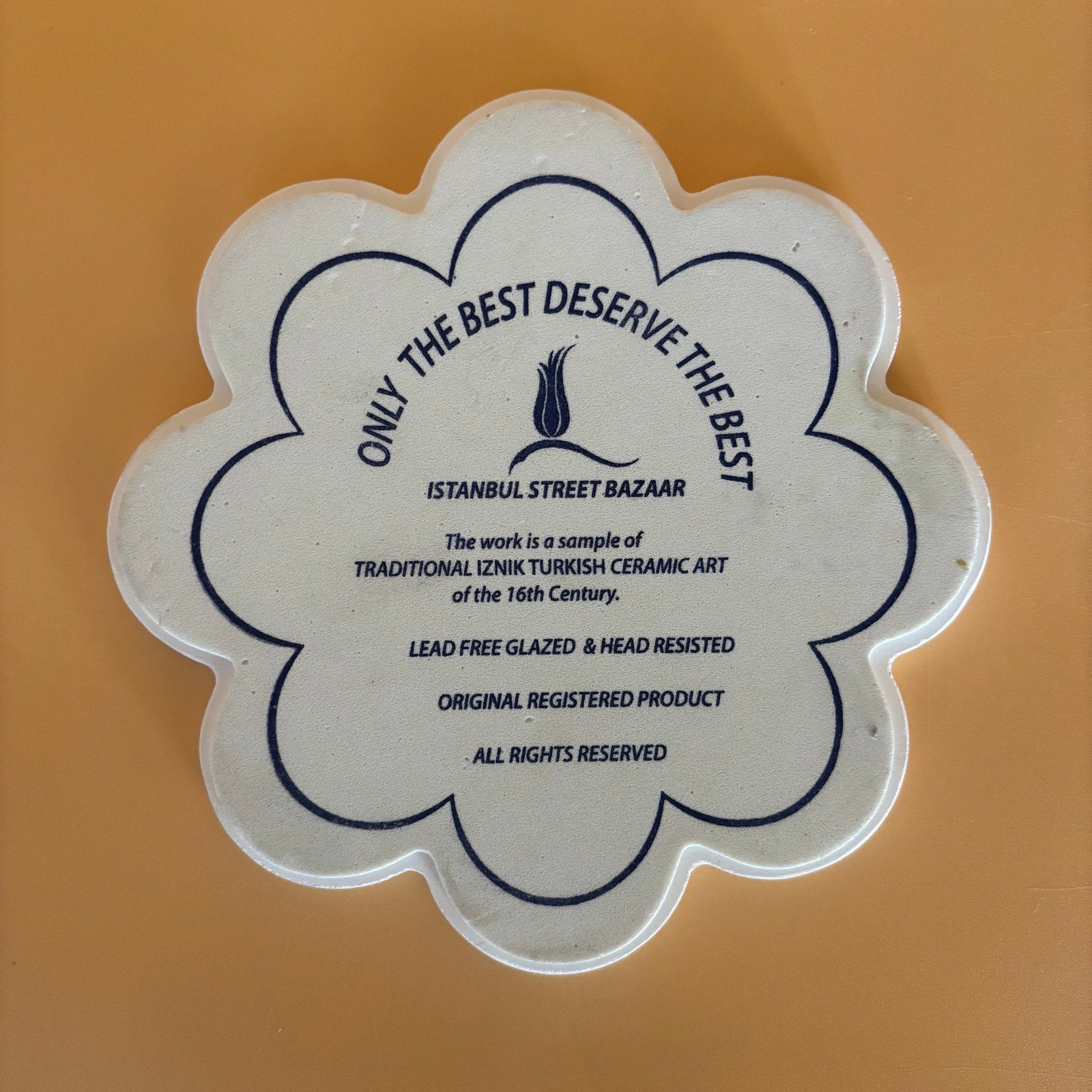Ceramic trivet from Istanbul Street Bazaar featuring a blue floral motif inspired by traditional Iznik Turkish ceramic art of the 16th century. Scalloped flower shape with detailed floral pattern and “ONLY THE BEST DESERVE THE BEST” stamp on the back. Lead-free glazed and heat-resistant. Made in Turkey. Suitable for use as a hot pad or decorative tile.