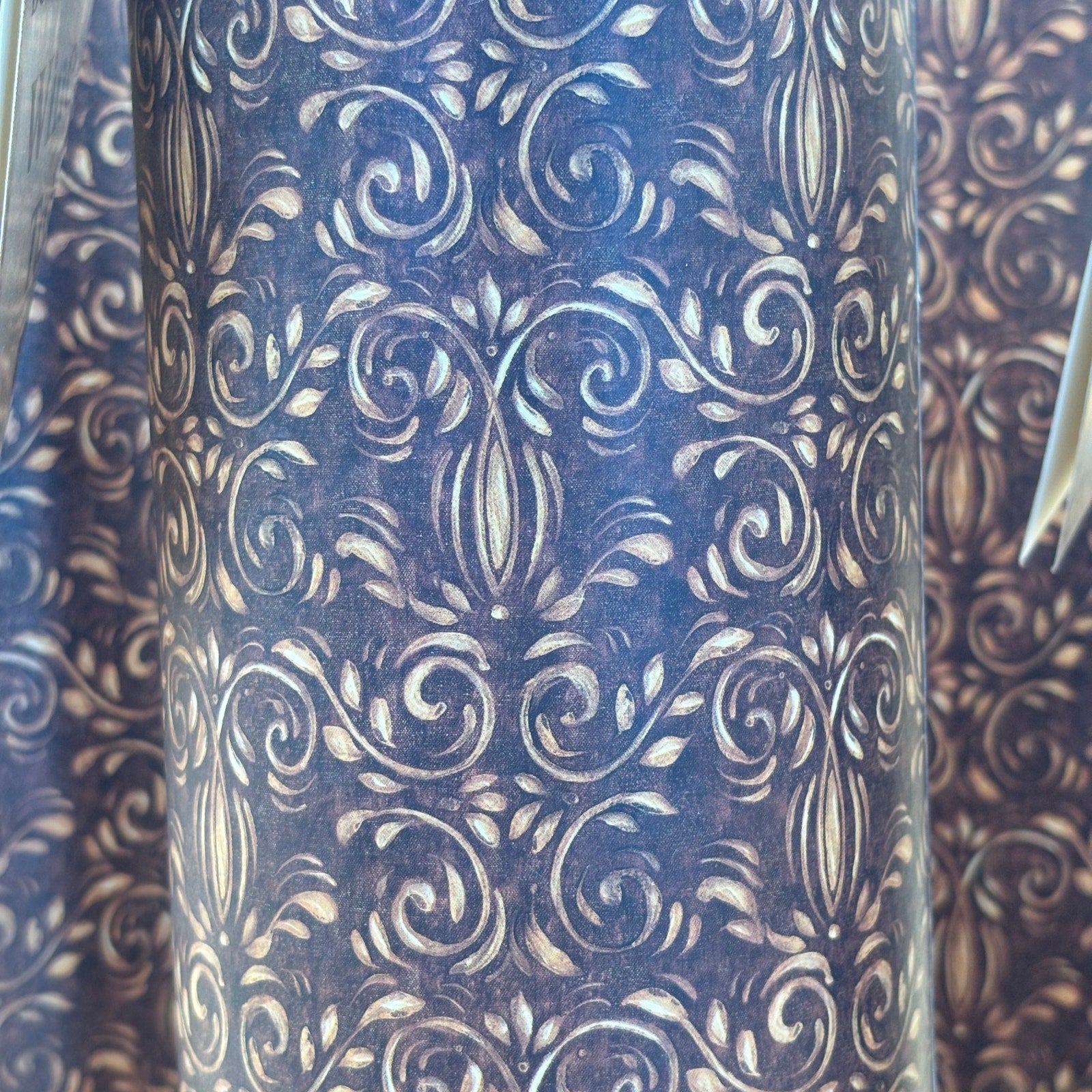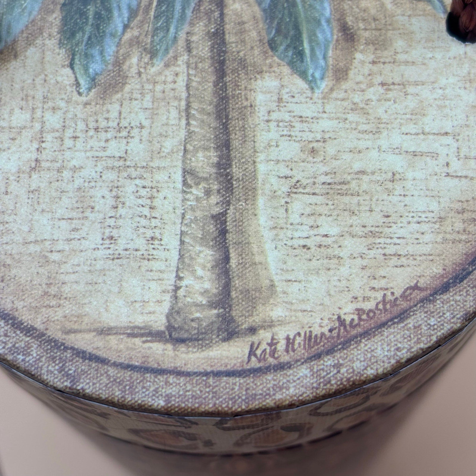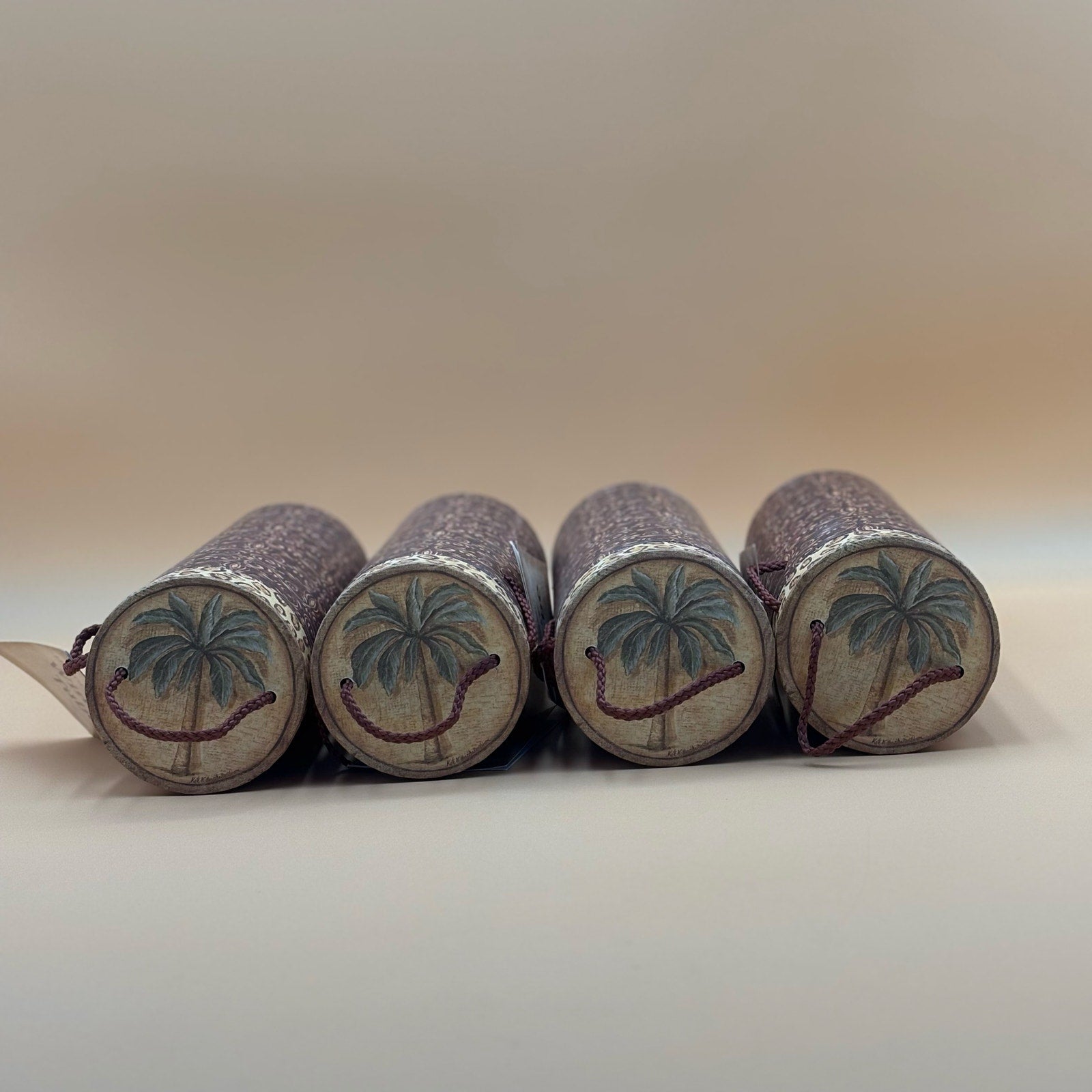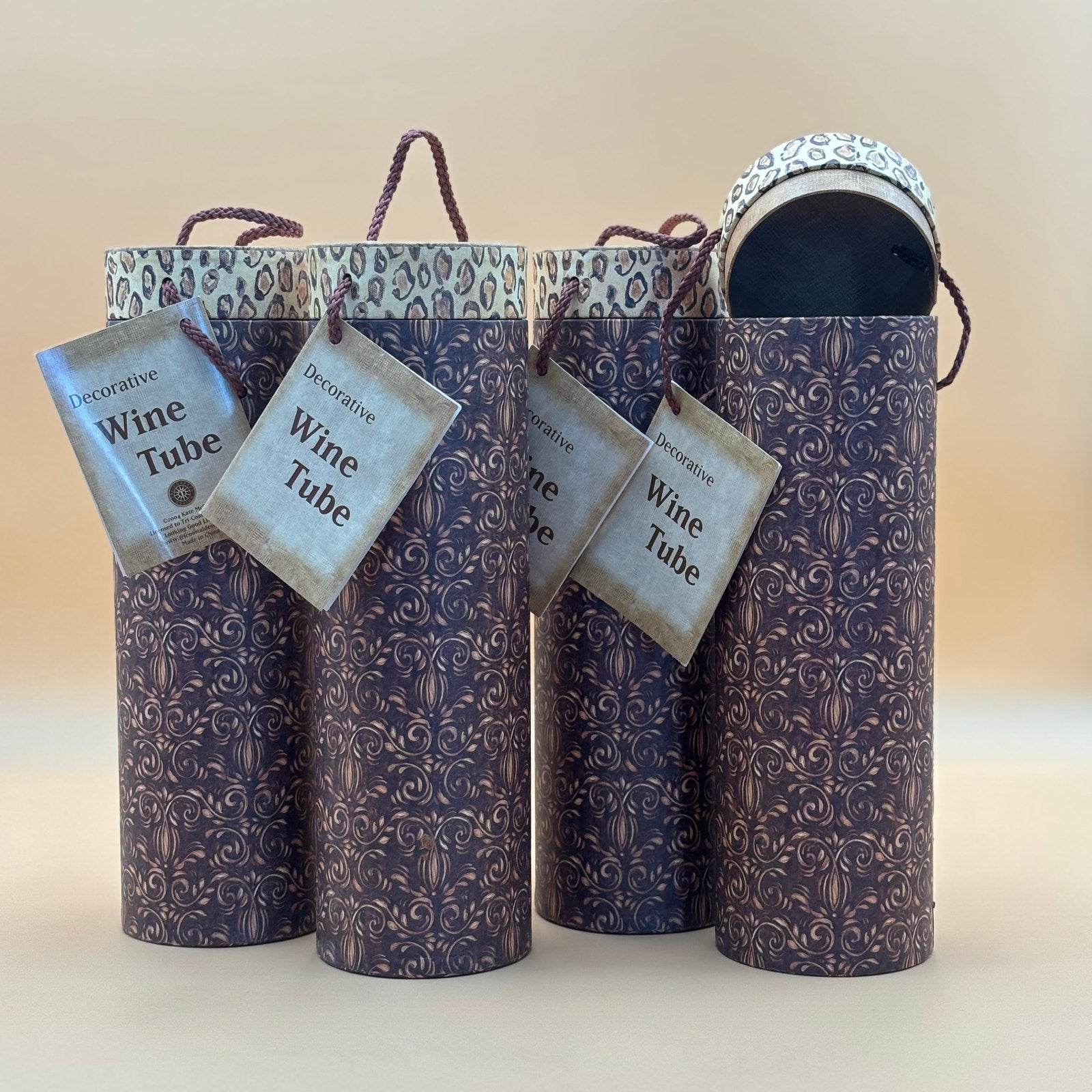 Set of four decorative wine tubes featuring licensed artwork by Kate McRostie for Tri-Coastal Design (©2004). Each features a printed scrollwork pattern with leopard trim and a palm-tree lid design, reproduced from McRostie’s original artwork and signed in print. Made from sturdy cardboard with braided cord handles, these elegant tubes are a reusable, upscale way to gift wine or champagne—perfect for wedding parties, bridal showers, or hostess gifts.