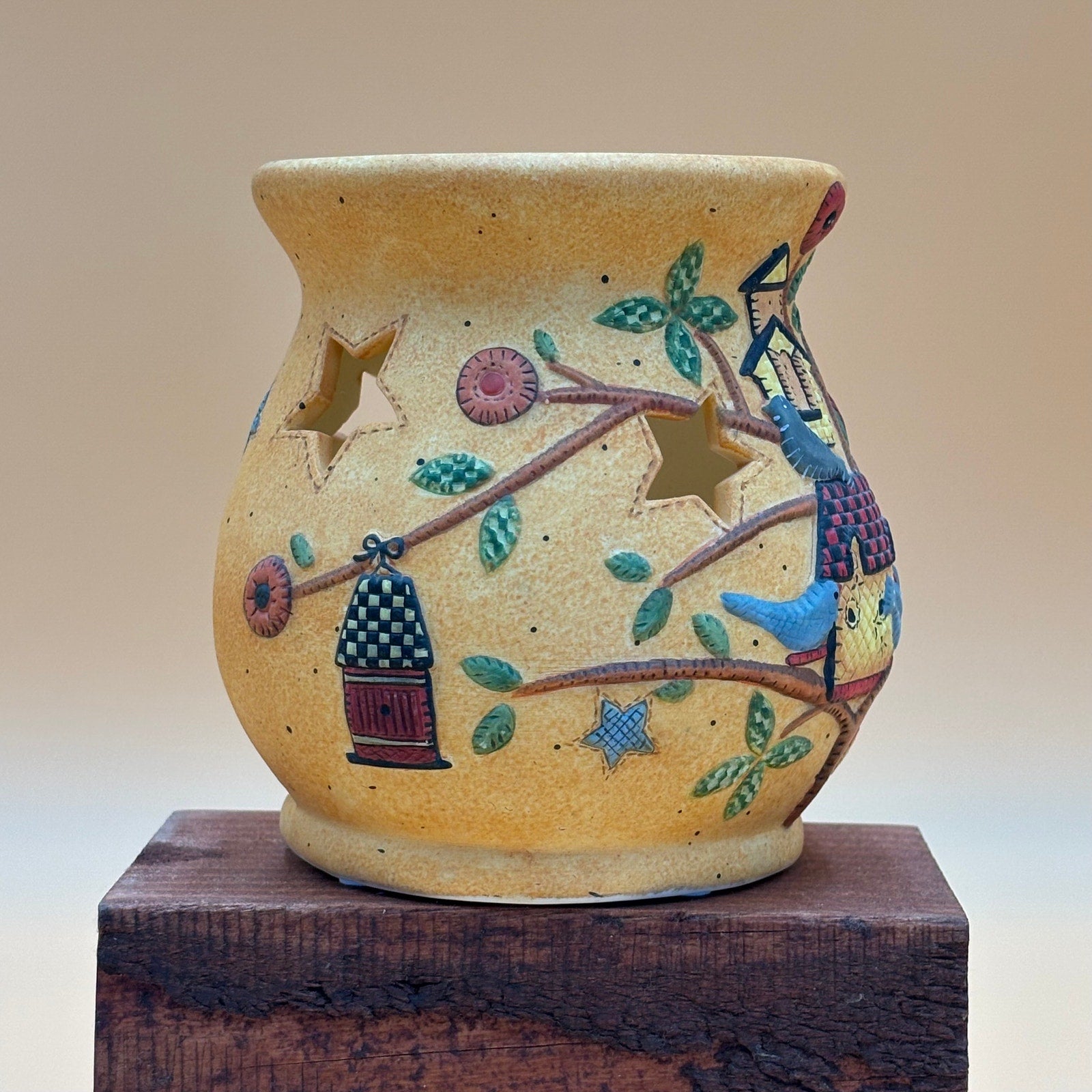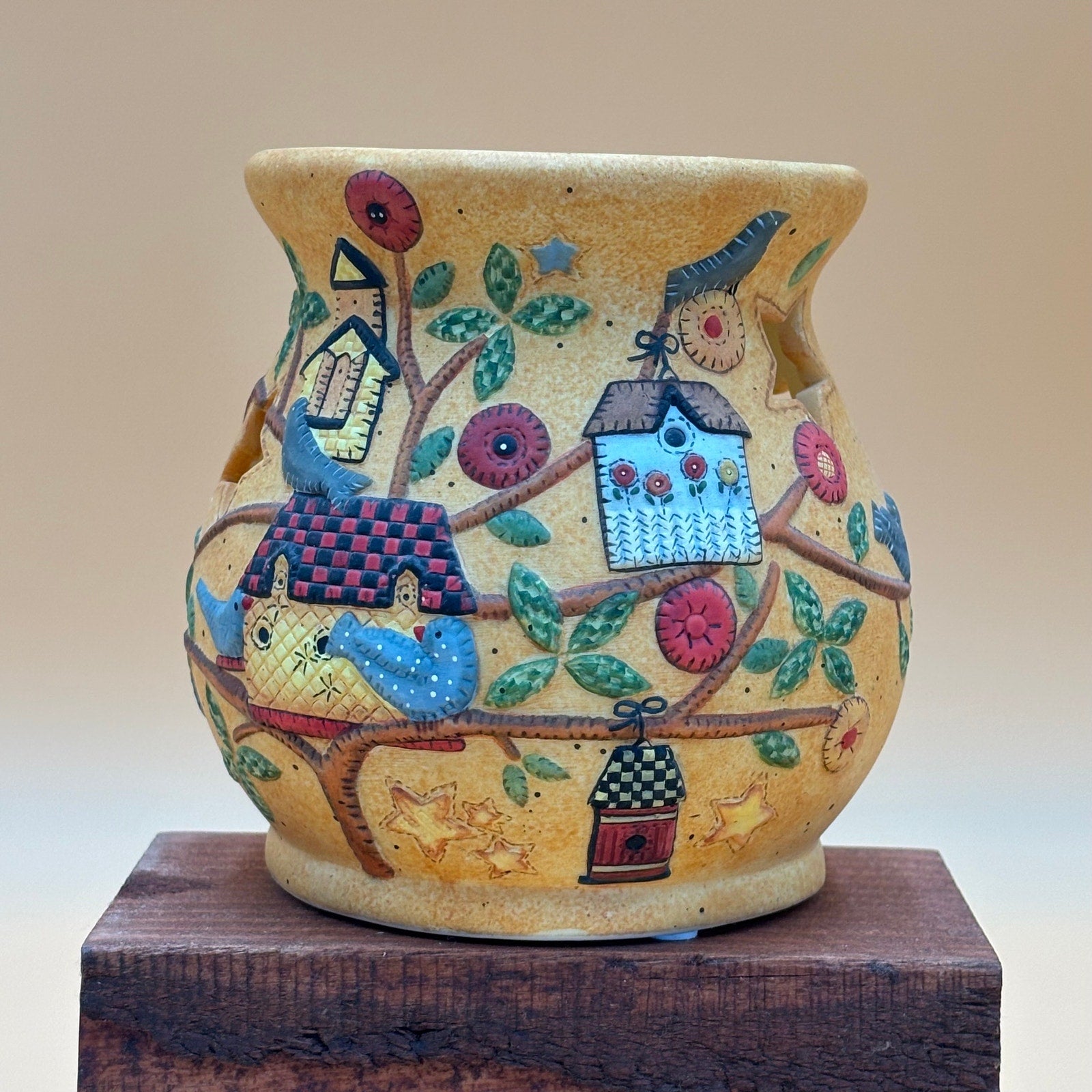 Charming Lang "Life Is A Song" wax warmer in cheerful golden yellow. Features whimsical folk art design with colorful birdhouses, birds, stars, flowers, and country cabins in a 3D relief style. Part of the bottom has rubbed off. Votive Candle NOT included.