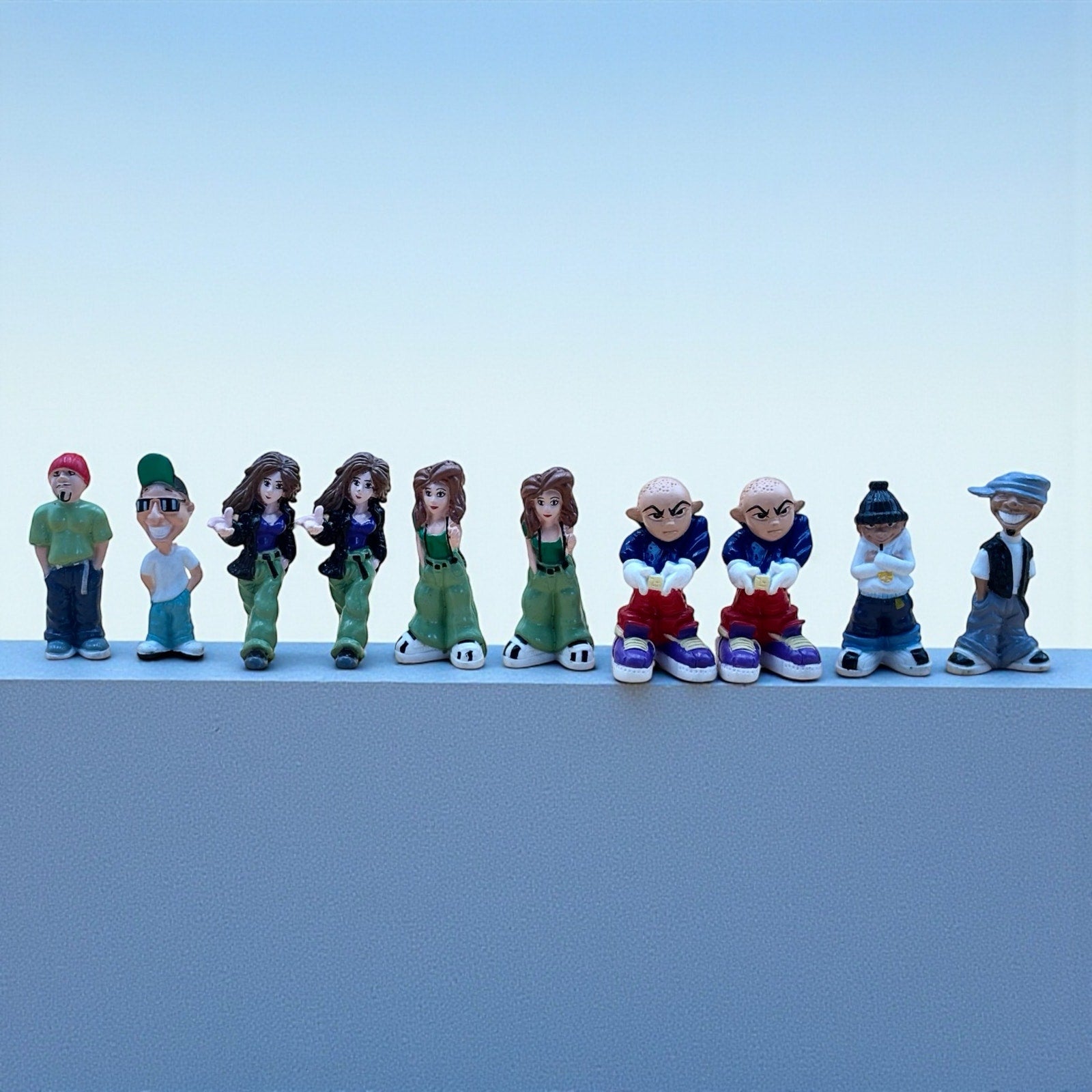 Set of 10 original Homies collectible figurines by artist David Gonzales. Includes seven different characters — Spooky, Big Loco, Smiley, Pelon, La Gata, Giggles, and Droopy — with three duplicates. Classic late-1990s street-style mini figures with colorful outfits and expressive detail.