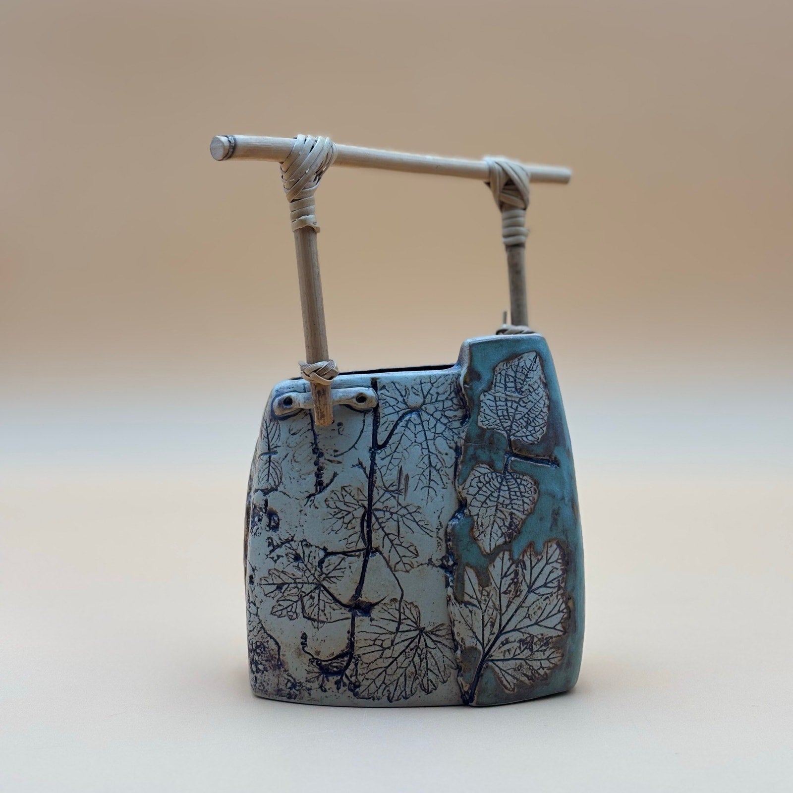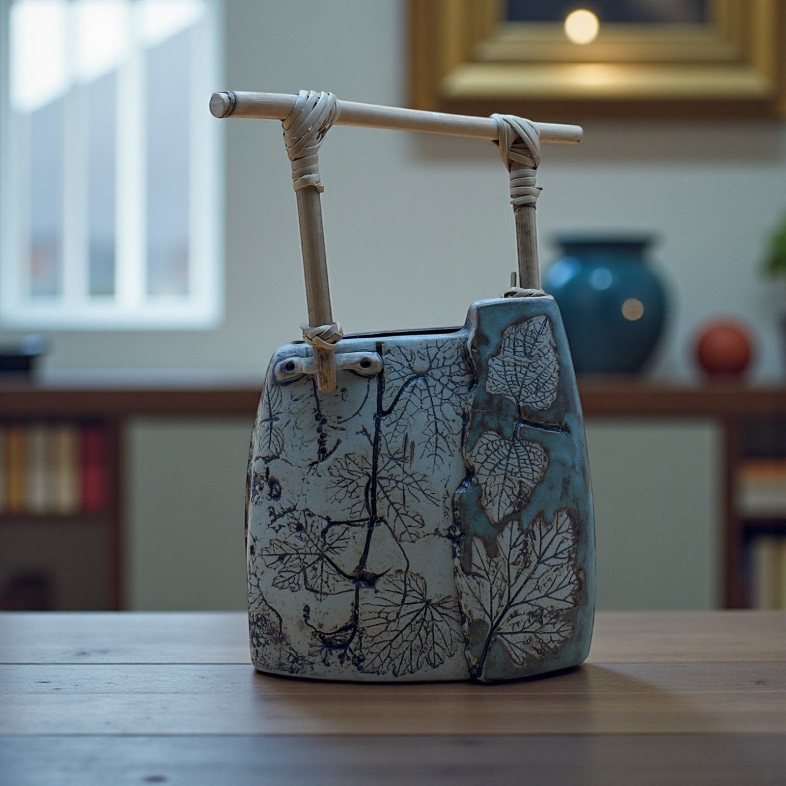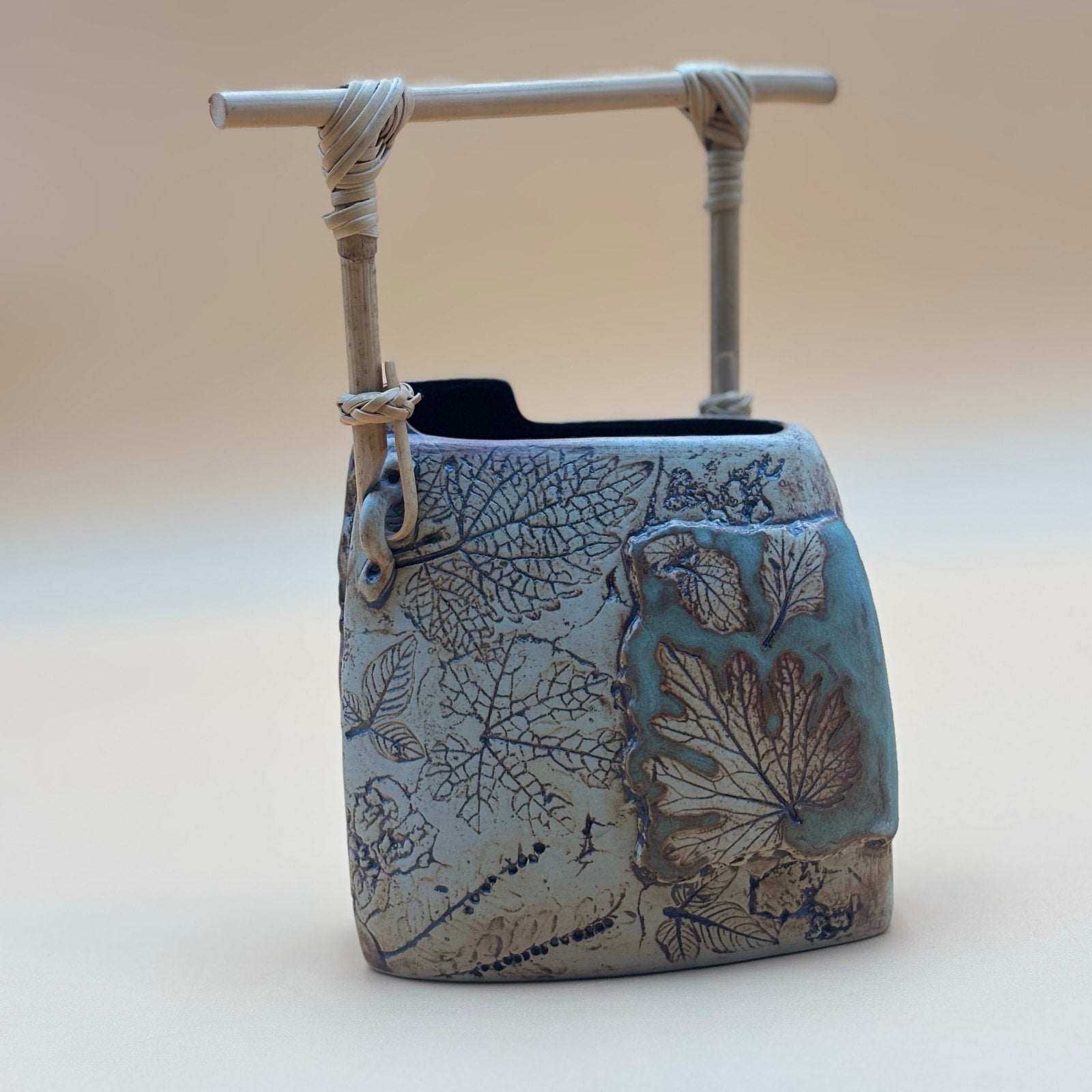 Beautiful handcrafted Tenmoku Pottery vase made in Malaysia, featuring a bamboo handle and embossed leaf motif. The unique rectangular body shows detailed leaf impressions and natural glaze tones in blue and beige. Marked Malaysia Handicraft and Tenmoku Pottery on the base.