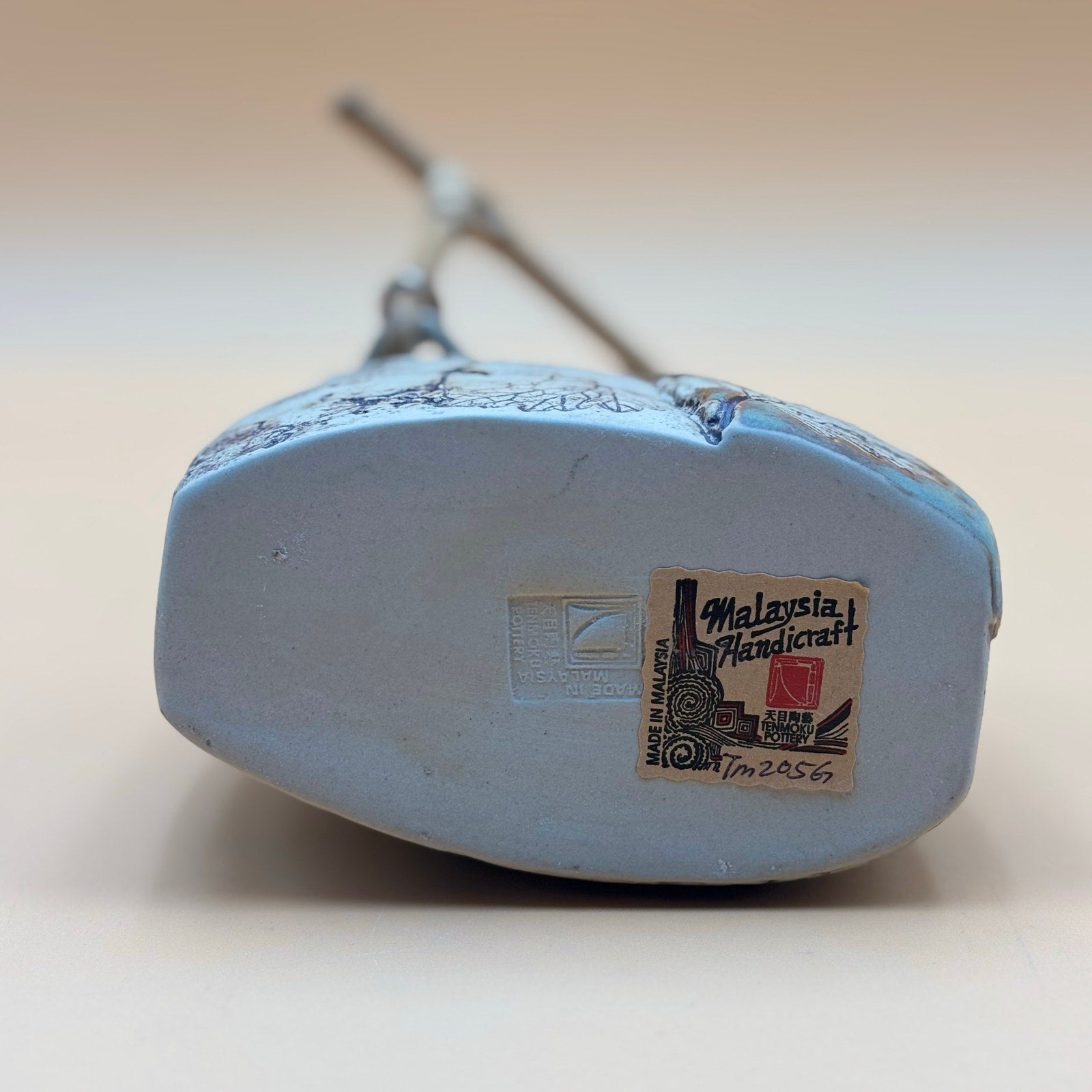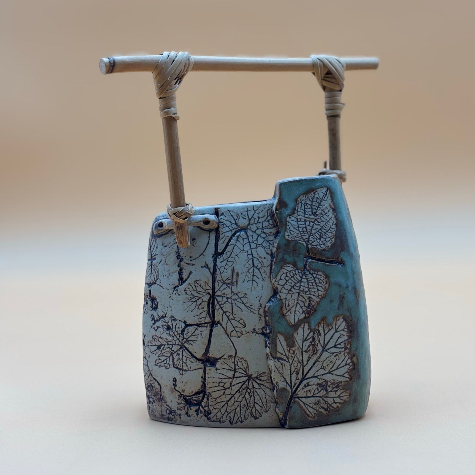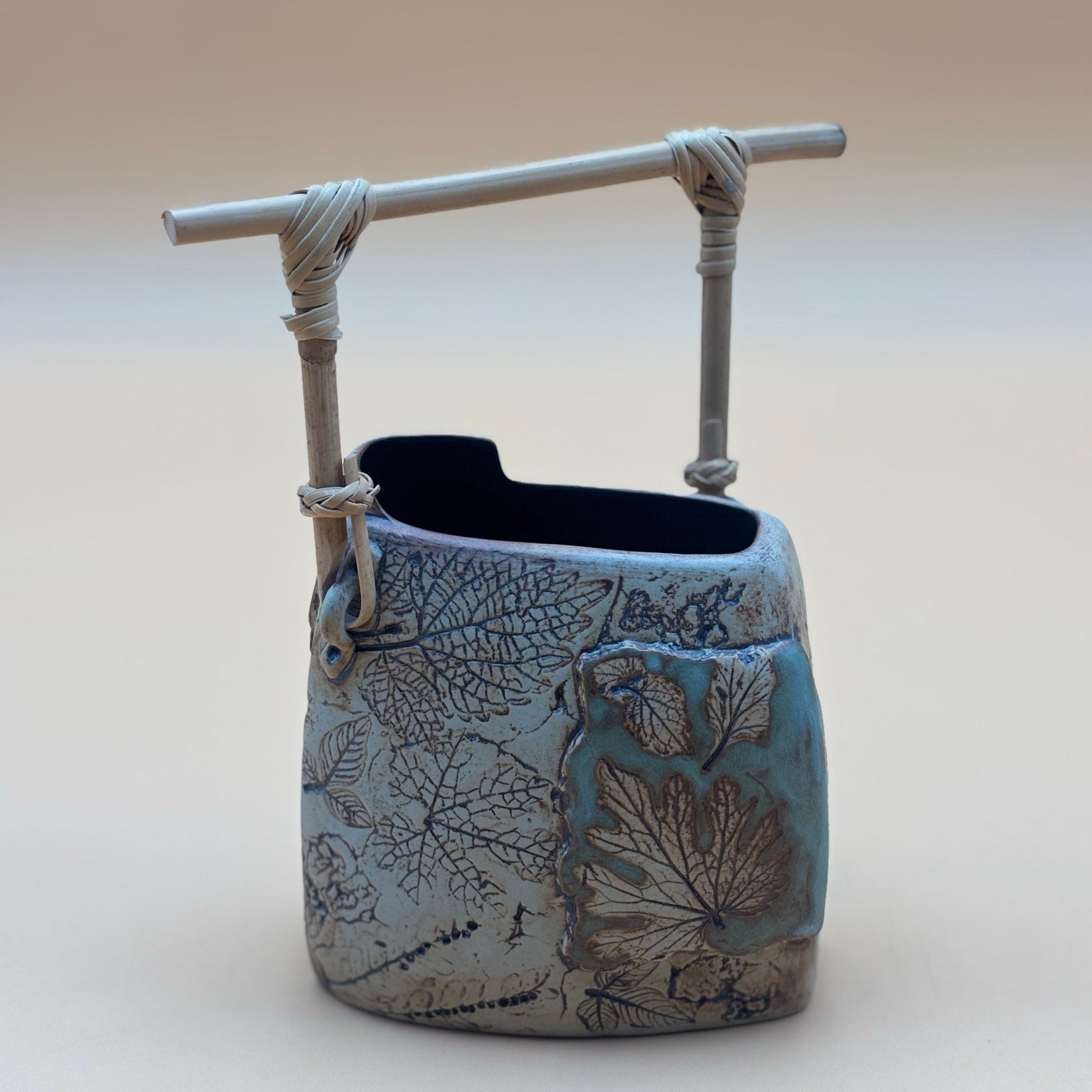 Beautiful handcrafted Tenmoku Pottery vase made in Malaysia, featuring a bamboo handle and embossed leaf motif. The unique rectangular body shows detailed leaf impressions and natural glaze tones in blue and beige. Marked Malaysia Handicraft and Tenmoku Pottery on the base.