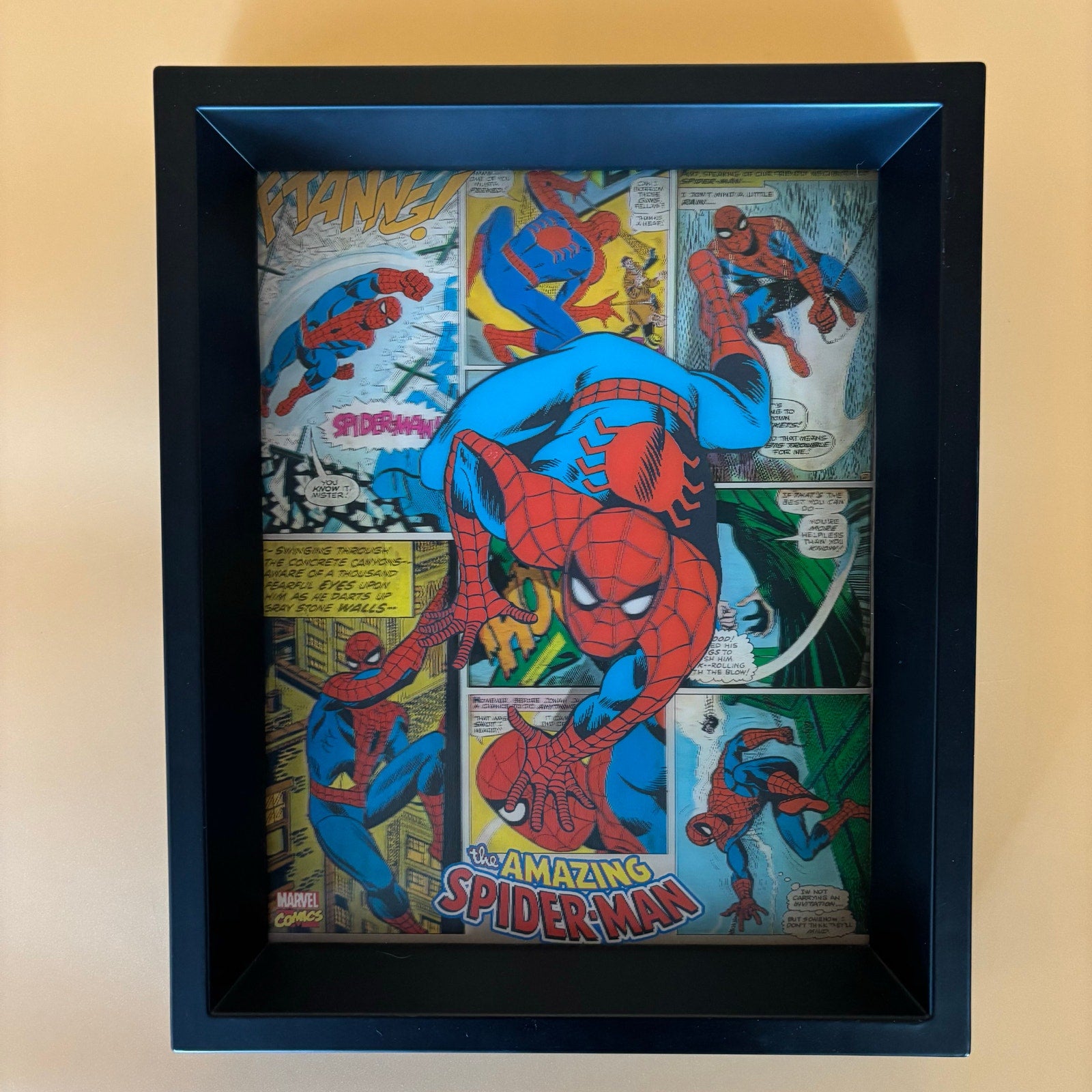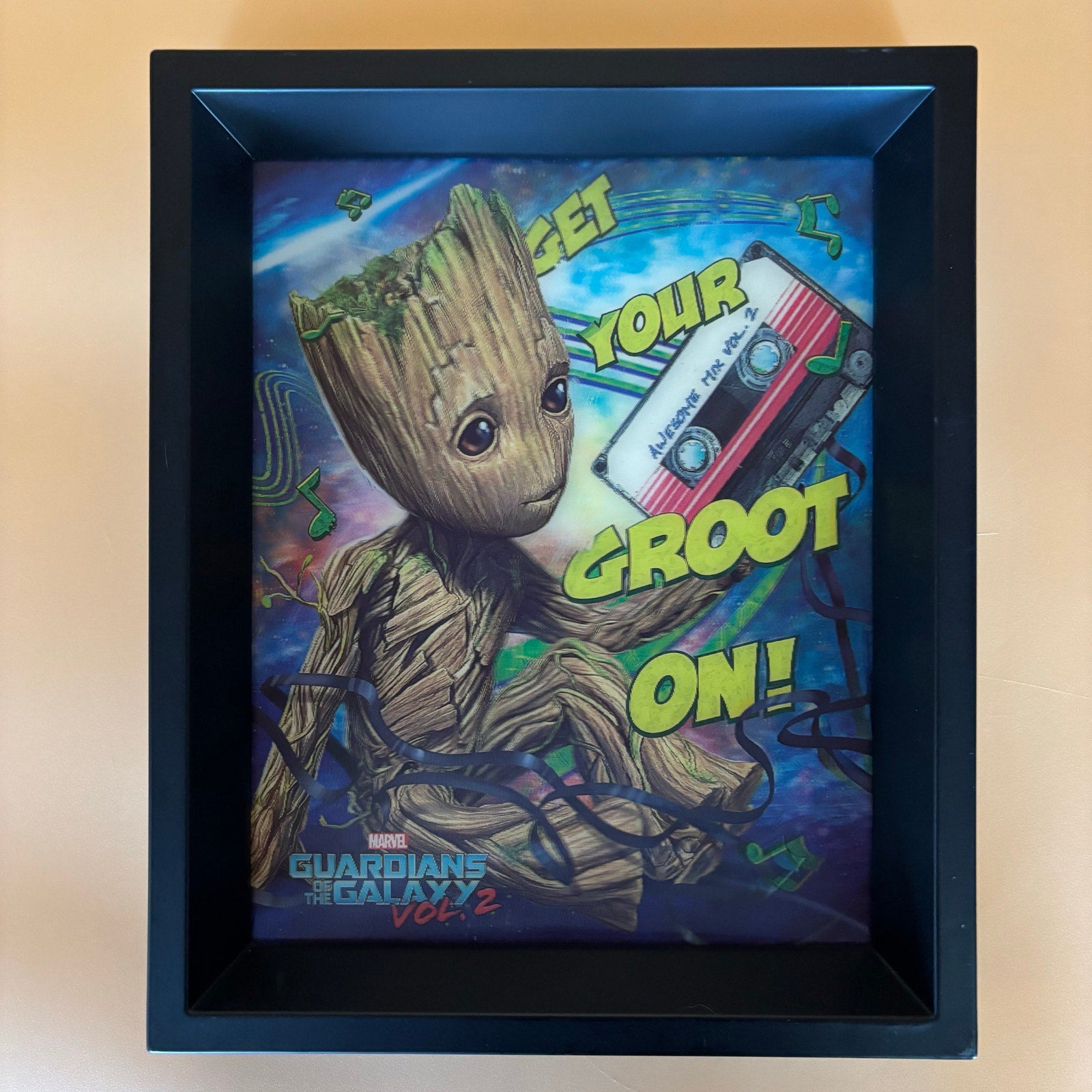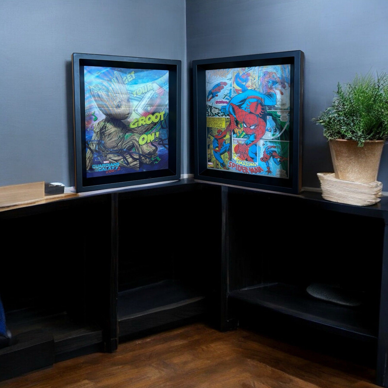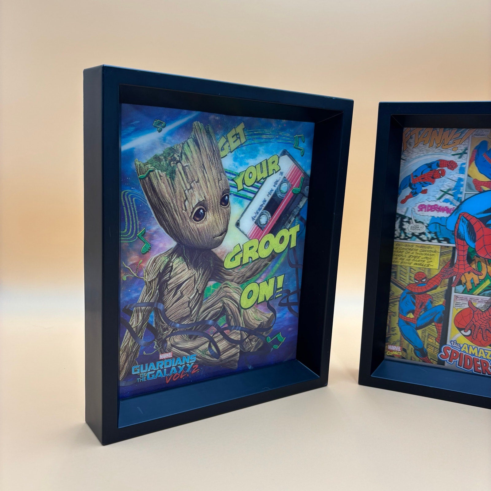 Officially licensed Marvel 3-D lenticular shadow-box prints. One features Baby Groot dancing with a mixtape and the phrase “Get Your Groot On!” (Guardians of the Galaxy Vol. 2). The other showcases The Amazing Spider-Man swinging across classic comic panels. Lenticular layers create a holographic depth effect that shifts as you move. Deep black frames; ready to hang.