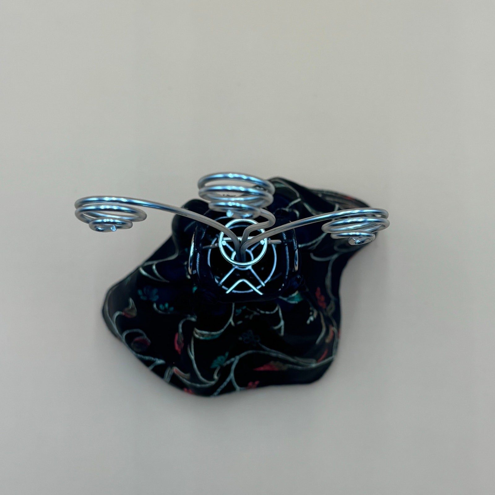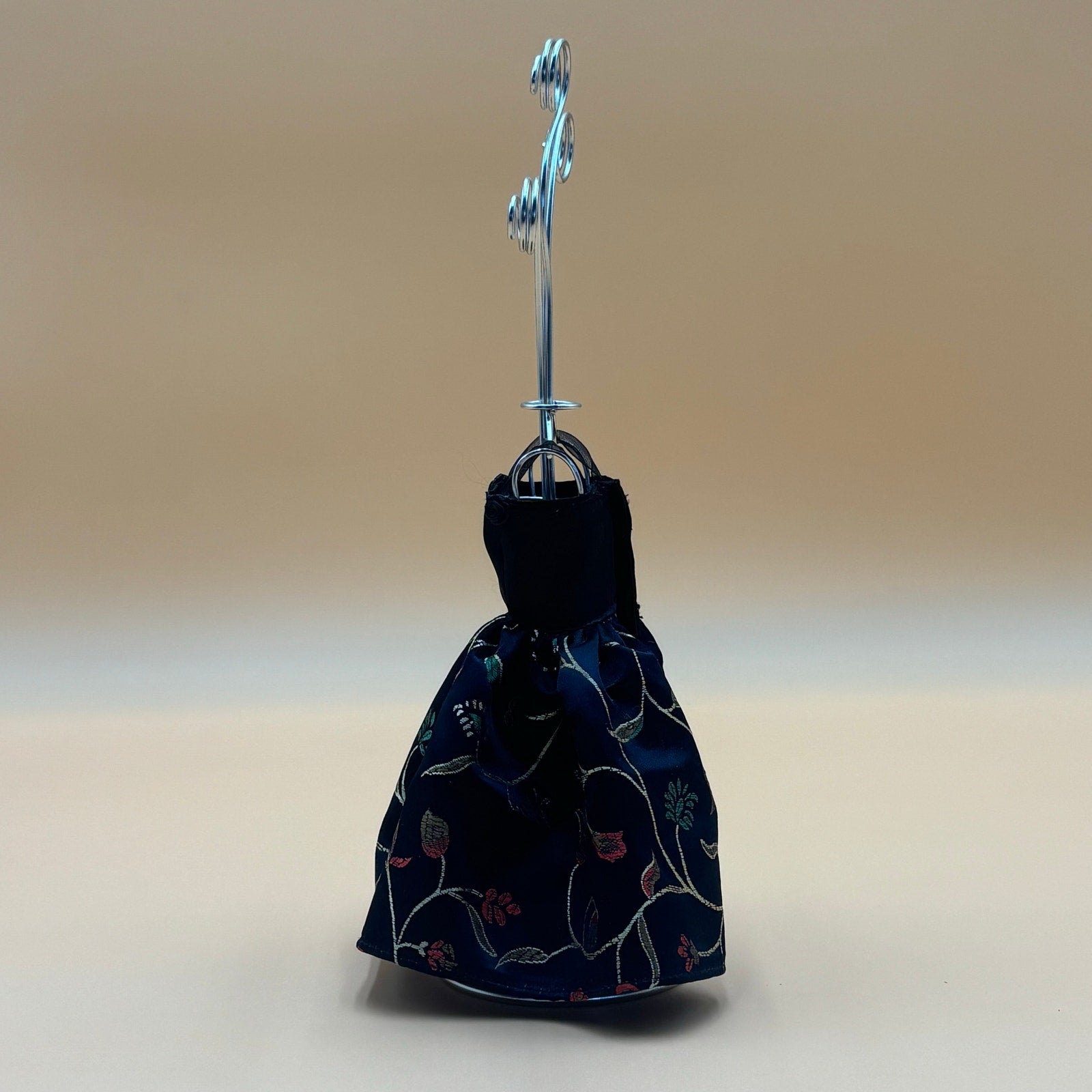 Charming miniature dress form photo or business card holder featuring black satin fabric with elegant embroidered floral design in gold, green, and red accents. Black velvet bodice with silver wire spiral decorative elements at top. Perfect for displaying photos, business cards, or as a unique decorative accent piece.