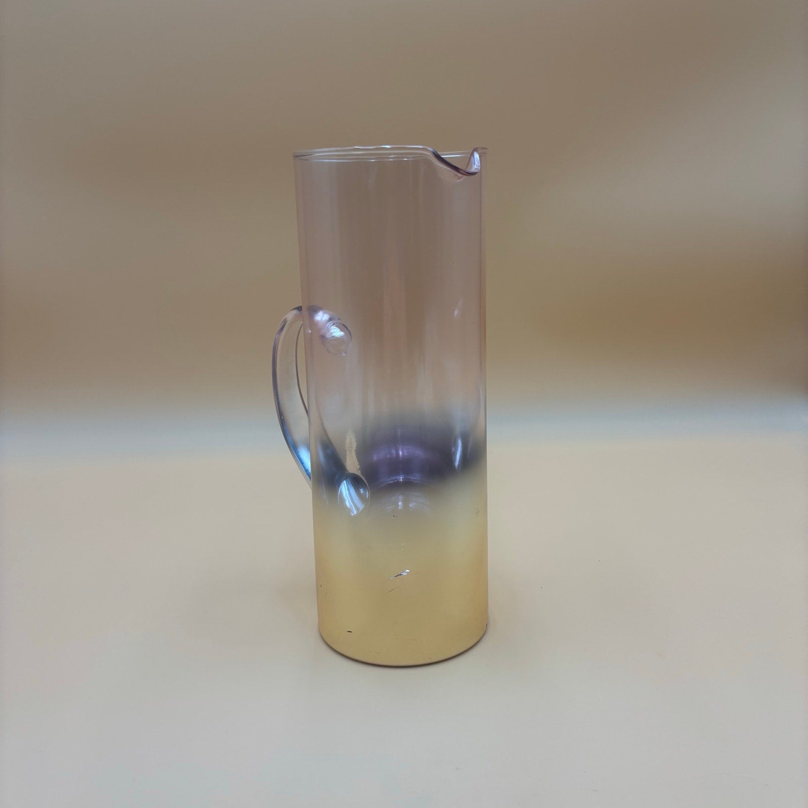 Tall, cylindrical glass pitcher with a dreamy ombre fade from soft amethyst at the rim to golden amber at the base. Curved handle echoes the color shift. Partial bottom sticker reads “Debi Lily Design – Golden Rose Collection” (sold in floral departments). Stunning for craft cocktails or repurposed as a vase—its iridescent tones beautifully frame fresh or dried flowers.