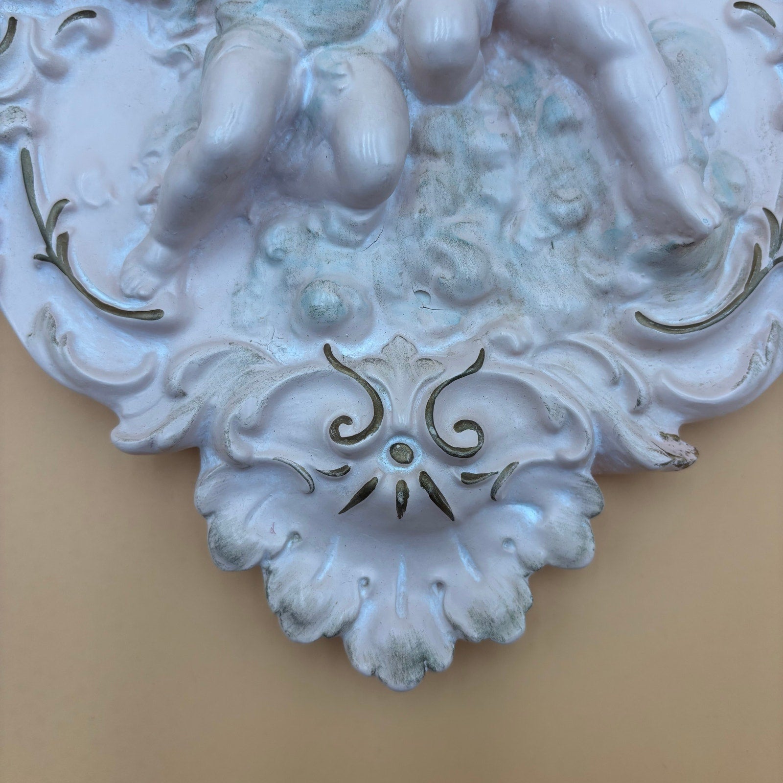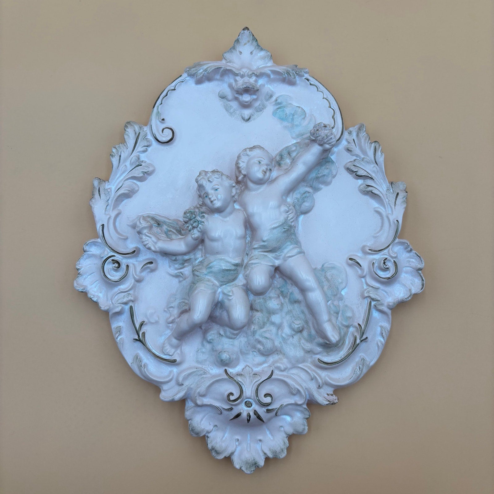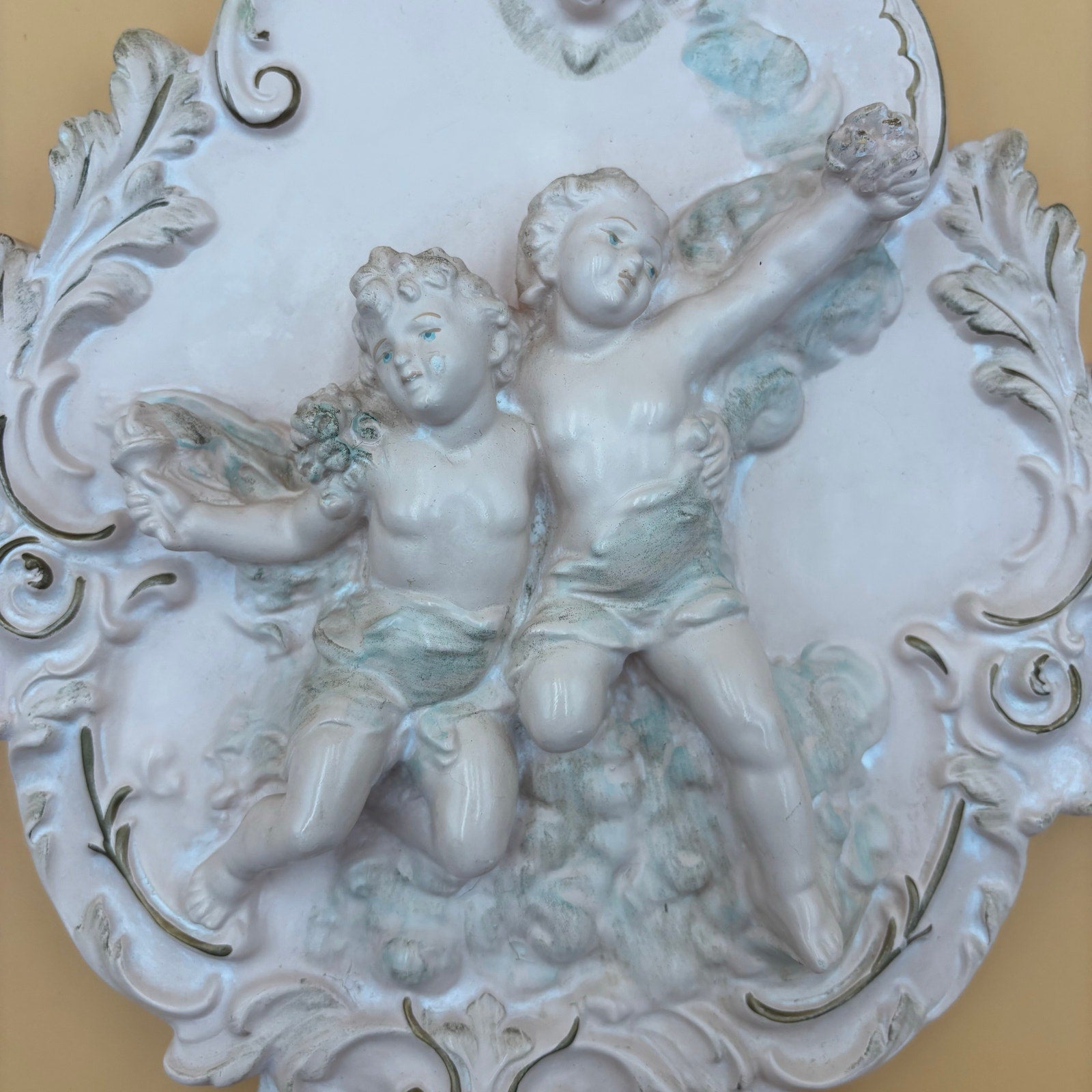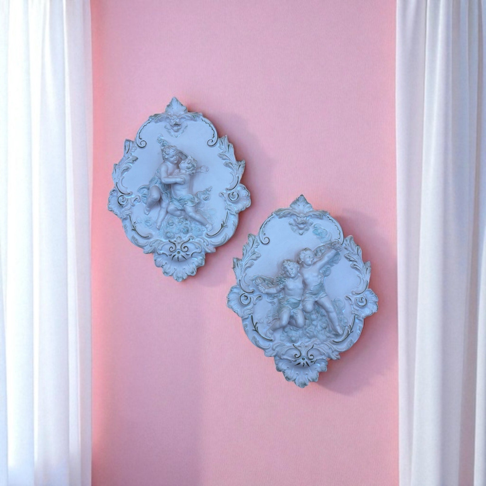 Pair of Alexander Backer Cherub Wall Plaques – Gilded Scrolls & Pastel Detail