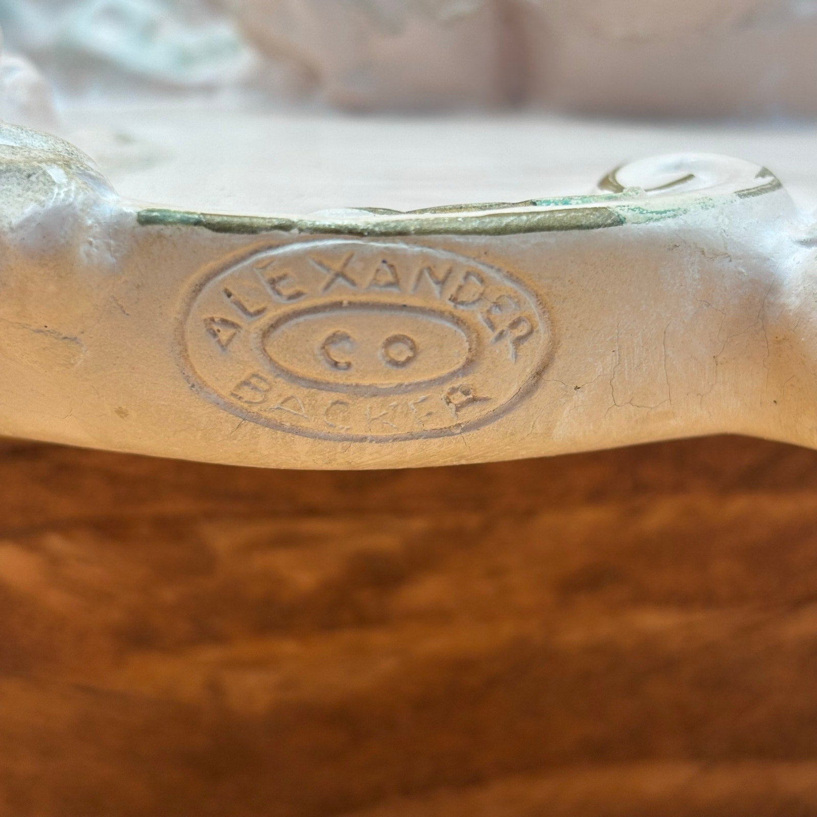Elegant pair of mid-century molded wall plaques by Alexander Backer Co., New York. These beautifully sculpted pieces feature raised cherubs framed in soft pastel pink and blue floral accents with ornate gold-trimmed scrollwork. Each plaque includes a carved lion mask at the crest and displays classic Rococo-inspired detail. A striking and rare matching set — ideal for vintage gallery walls or romantic-style decor.