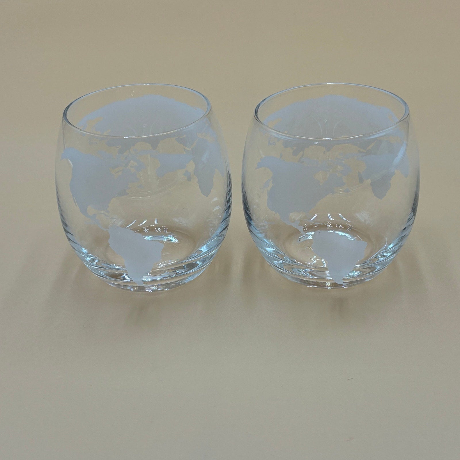 Set of 2 unique globe glasses featuring an etched frosted world map design. Clear rounded tumblers with a smooth finish. Unmarked. Ideal for whiskey, cocktails, or decorative display. Holds approximately 10 oz.