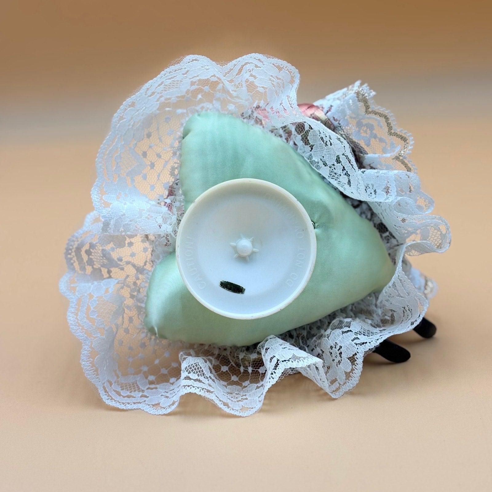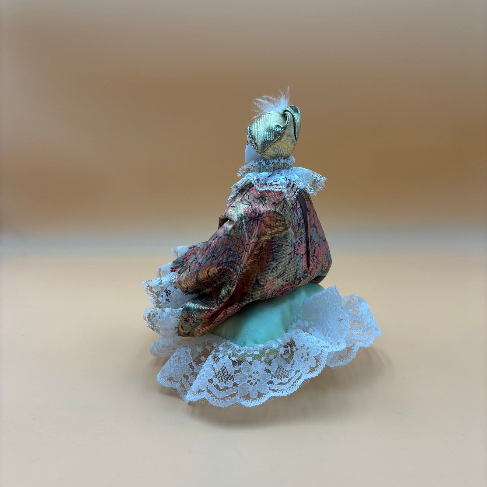 Porcelain musical clown doll with painted face, gold headpiece, and feather accent. Gold, pink, and teal floral brocade dress with lace trim. Black painted shoes. Mint green satin pillow base with lace trim and twist-turn musical mechanism. Made in Taiwan. Small manufacturing flaw on chin.