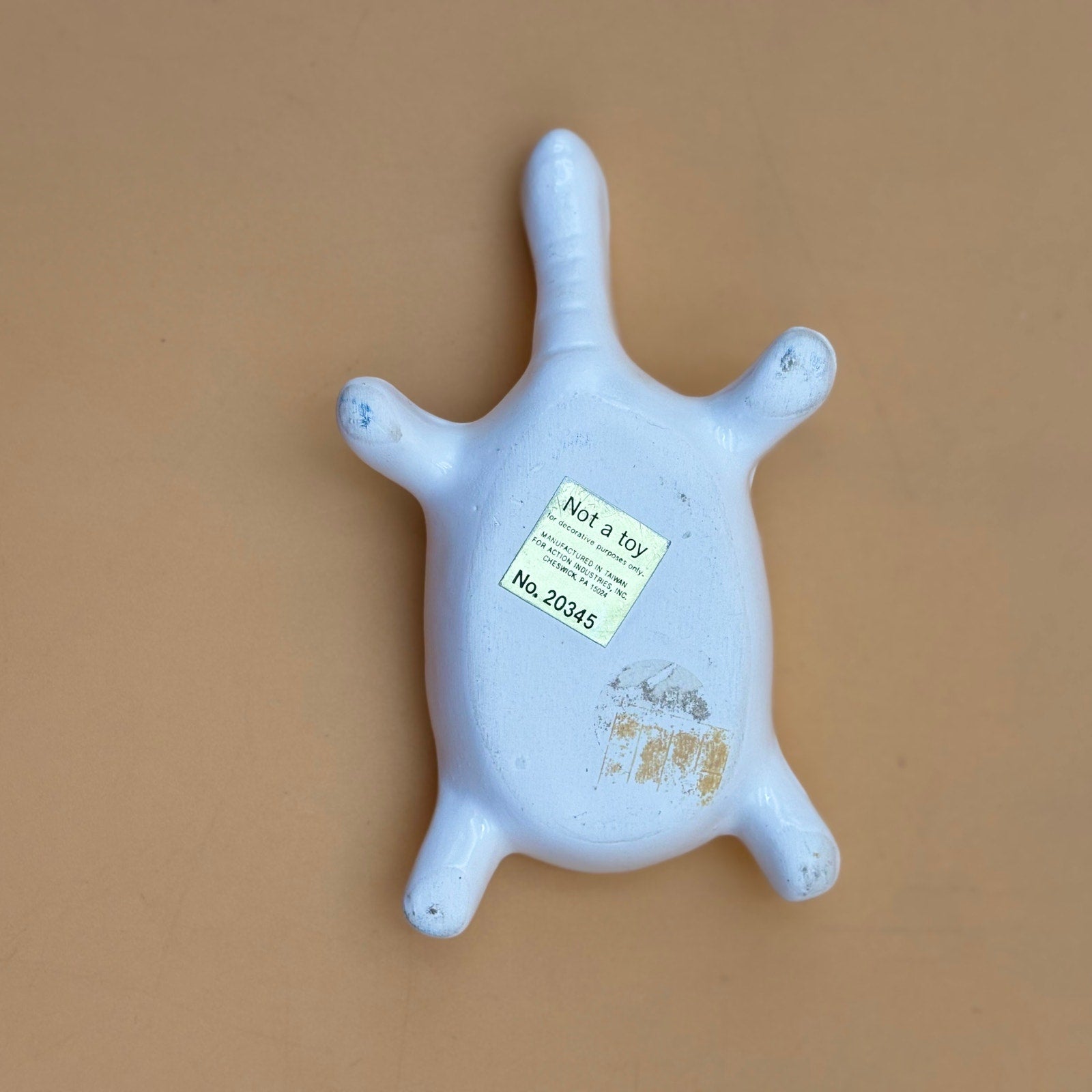 Charming porcelain turtle trinket box featuring a hand-painted purple floral design with green leaves on a glossy white finish. The shell lifts off to reveal a small compartment for rings or keepsakes. Manufactured in Taiwan for Action Industries, a popular 1980s–1990s importer known for detailed decorative ceramics.