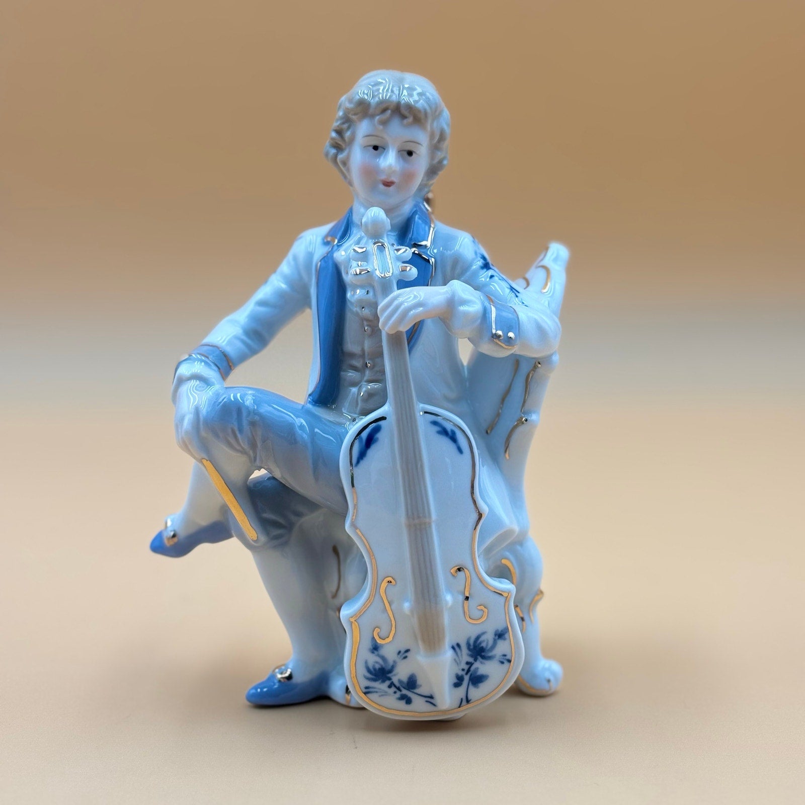 Charming porcelain figurine set depicting a Victorian couple seated with musical instruments. The woman wears a blue dress adorned with gold trim and floral details, playing a lyre beside a small table with an open book. The man is dressed in matching tones, playing a violin decorated with blue flowers. Elegant and graceful, this pair captures classic Victorian charm and fine detail.