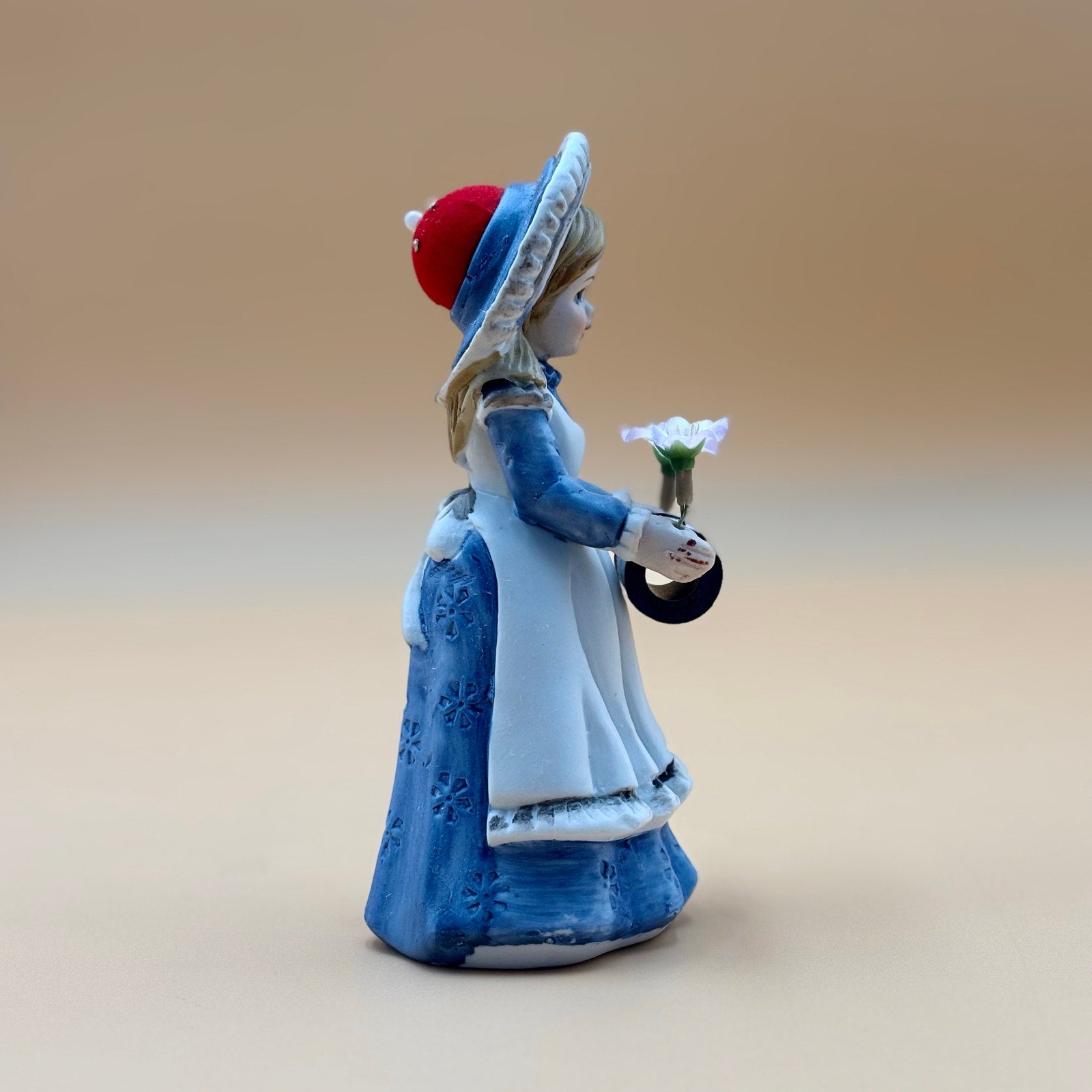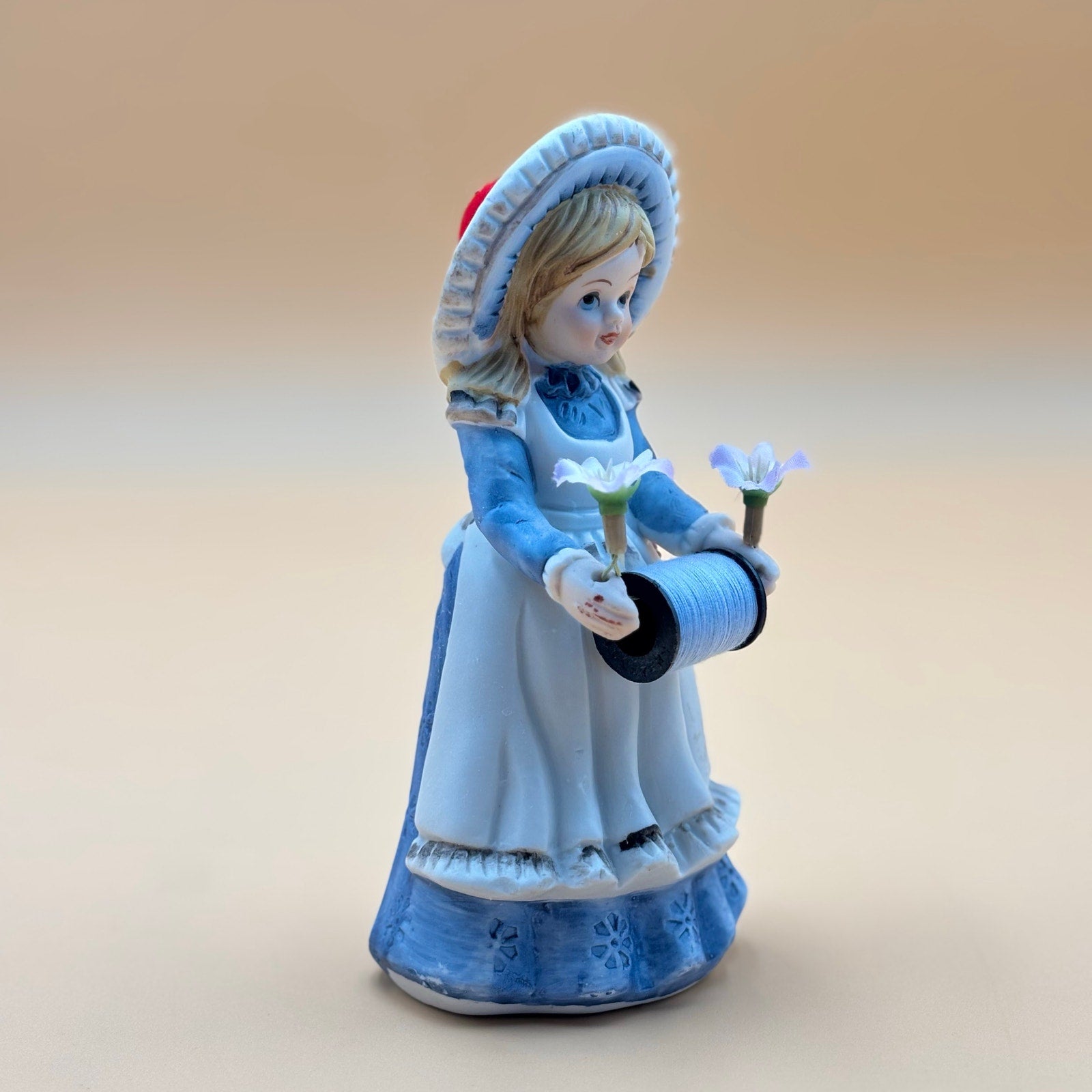 Porcelain girl figurine holding a spool of blue thread and two flowers, featuring a red pin cushion hat and a small basket on her back designed to hold sewing scissors (not included). Painted in blue, white, and soft blush tones.