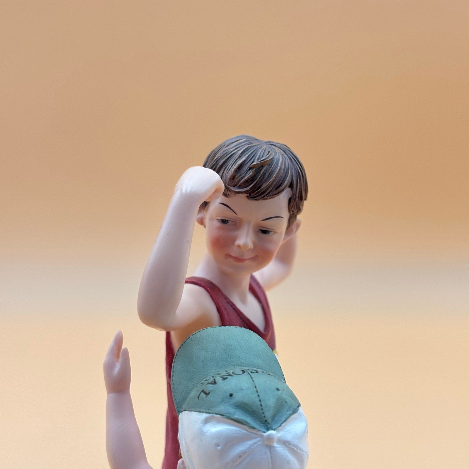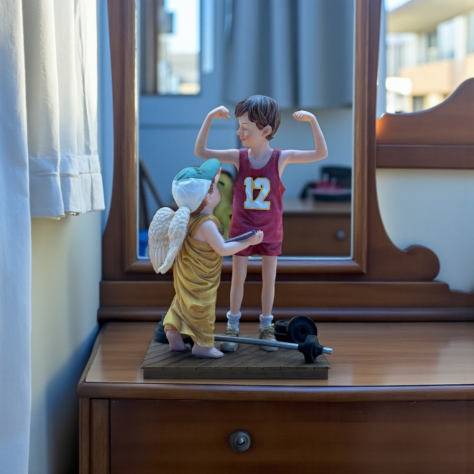 Heartwarming Prayers & Promises figurine by Bill Stross for Enesco (2002), titled A Work in Progress. Features a young angel in a gold robe cheering on a boy lifting weights — a sweet reminder of encouragement and faith.
