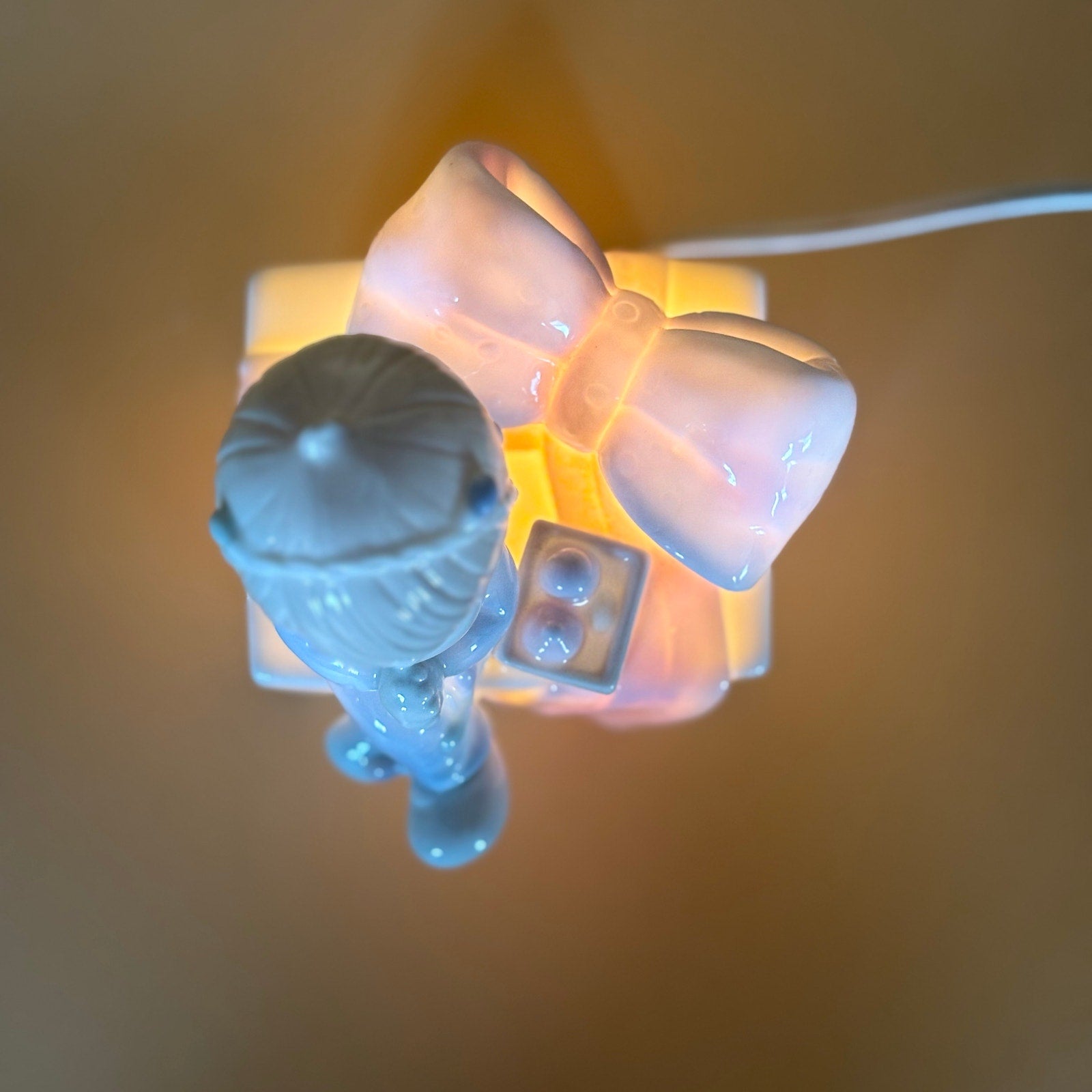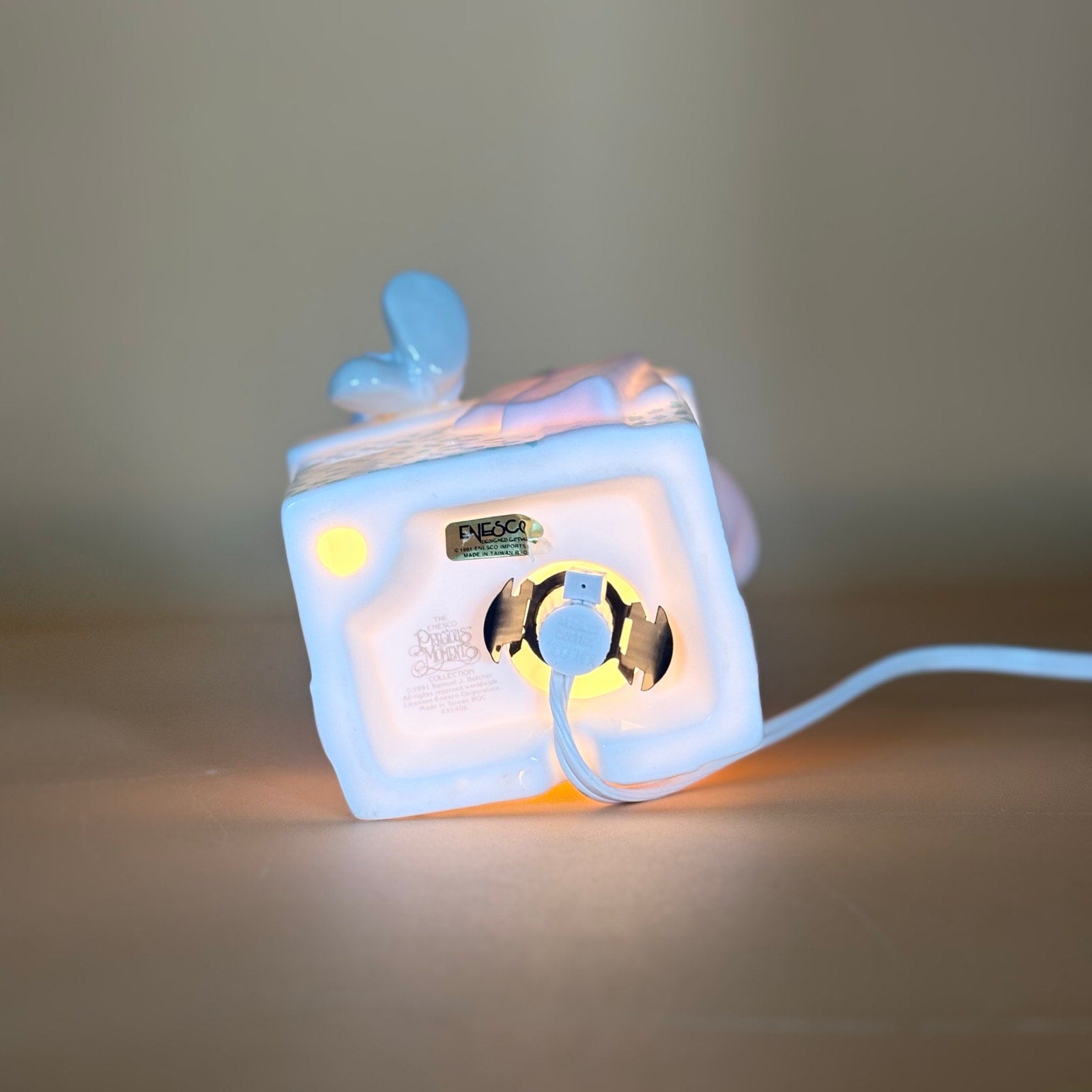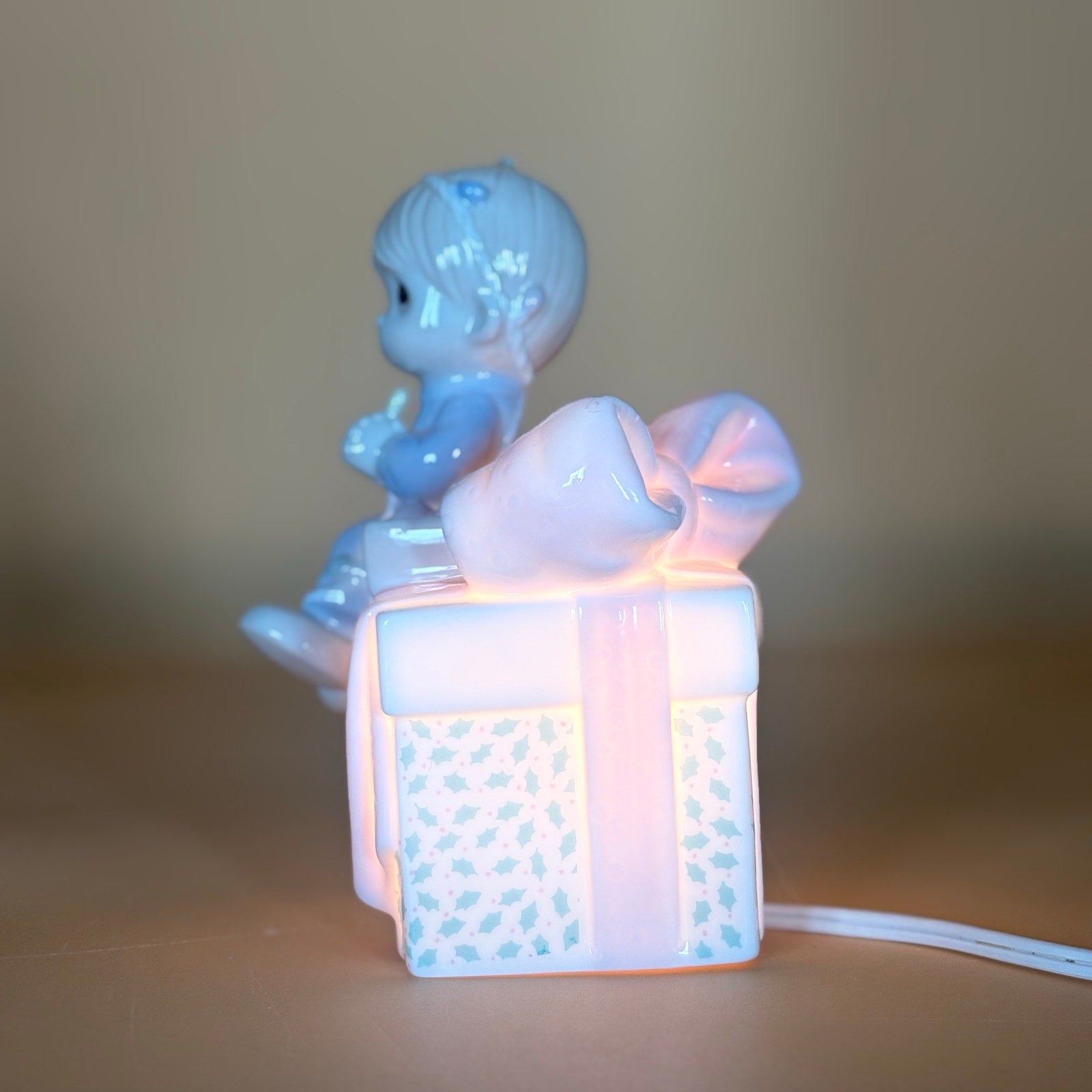 Adorable 1991 Precious Moments porcelain lighted figurine by Enesco. Features a boy sitting on a pastel gift that glows softly when plugged in. Includes the original box, which shows some wear.