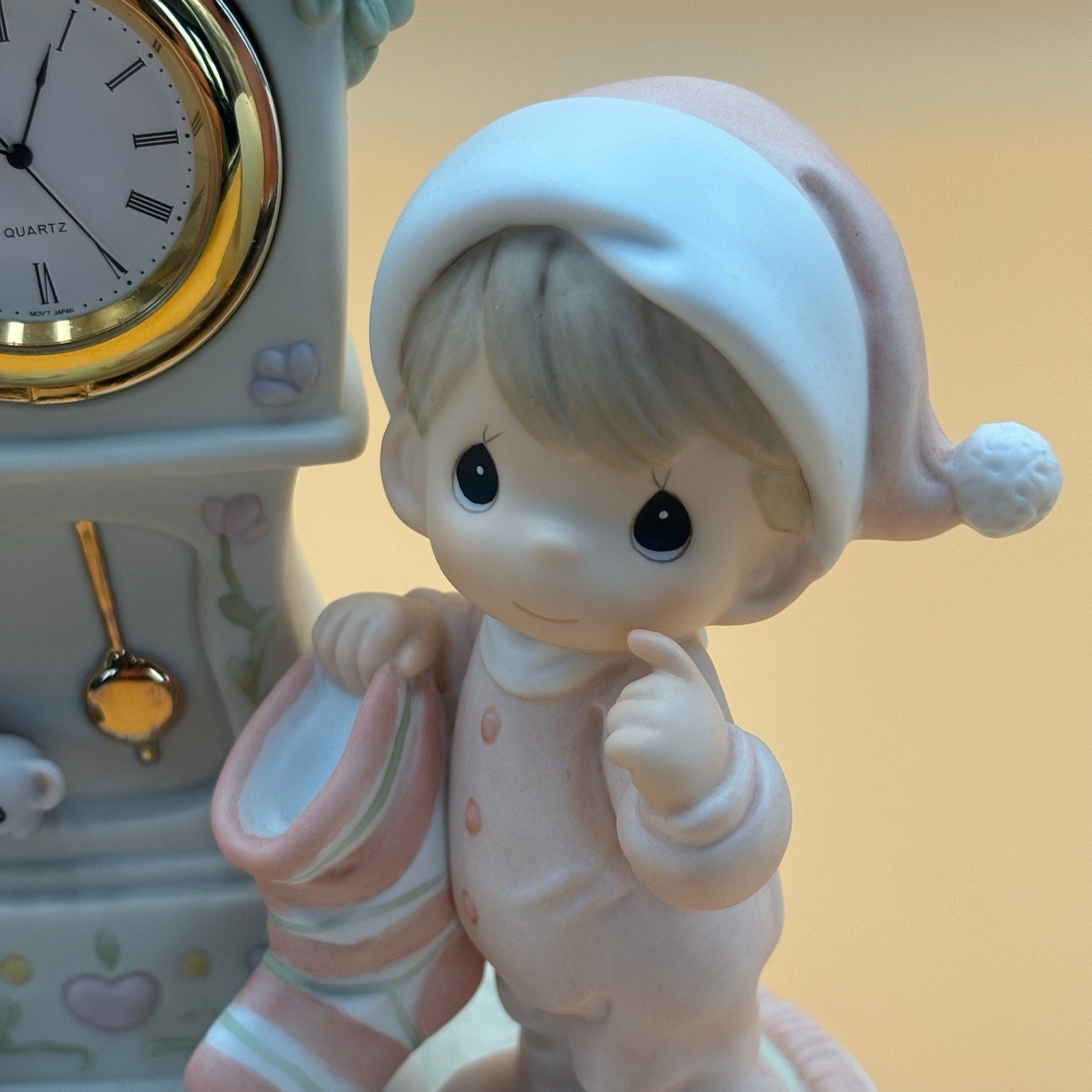 2001 Precious Moments porcelain clock figurine titled “It’s Almost Time for Santa” by Enesco. Features a child in pajamas holding a stocking beside a pastel grandfather-style clock with sweet bear and floral details. Includes original box (shows light wear and missing inner Styrofoam insert). Clock not tested.