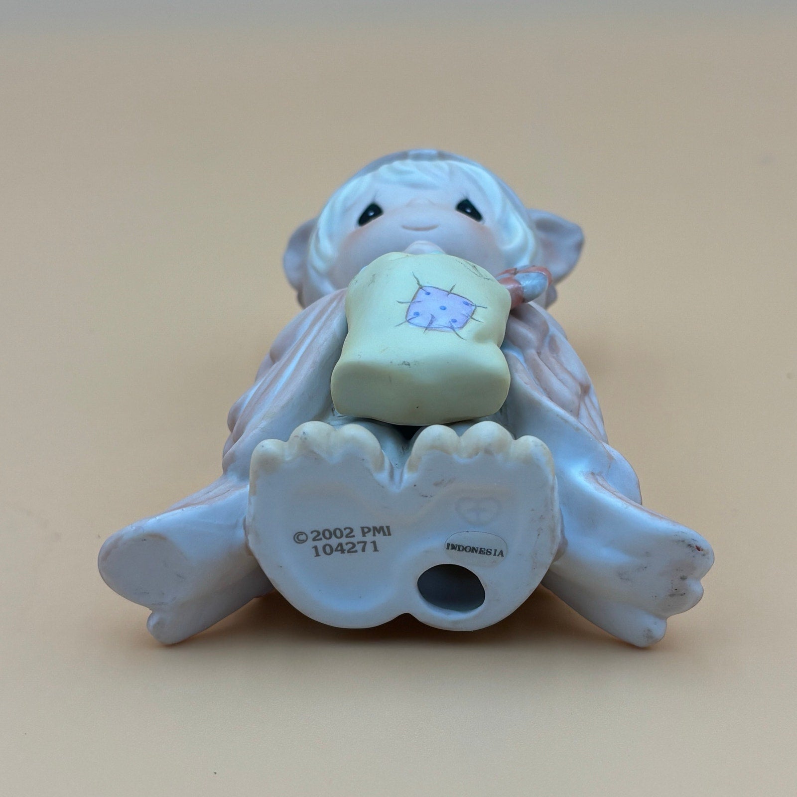 Precious Moments figurine titled “Owl Always Be There For You” from 2002, item number 104271. Features a child in a soft pastel owl costume holding a treat bag. Made of porcelain bisque. Marked PMI and Indonesia on the base.