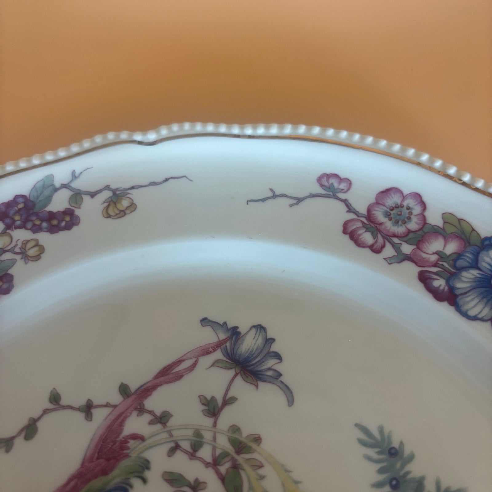 Rosenthal Continental “Phoenix” pattern porcelain, marked “Rosenthal Selb-Germany.” This set includes one 9¼″ dinner plate and six 6¼″ salad/dessert plates. Features a colorful bird and floral design with gold trim, no verge, and a distinctive beaded rim — a harder-to-find variation.