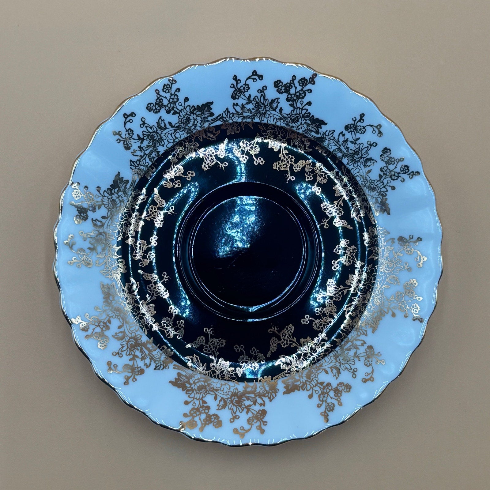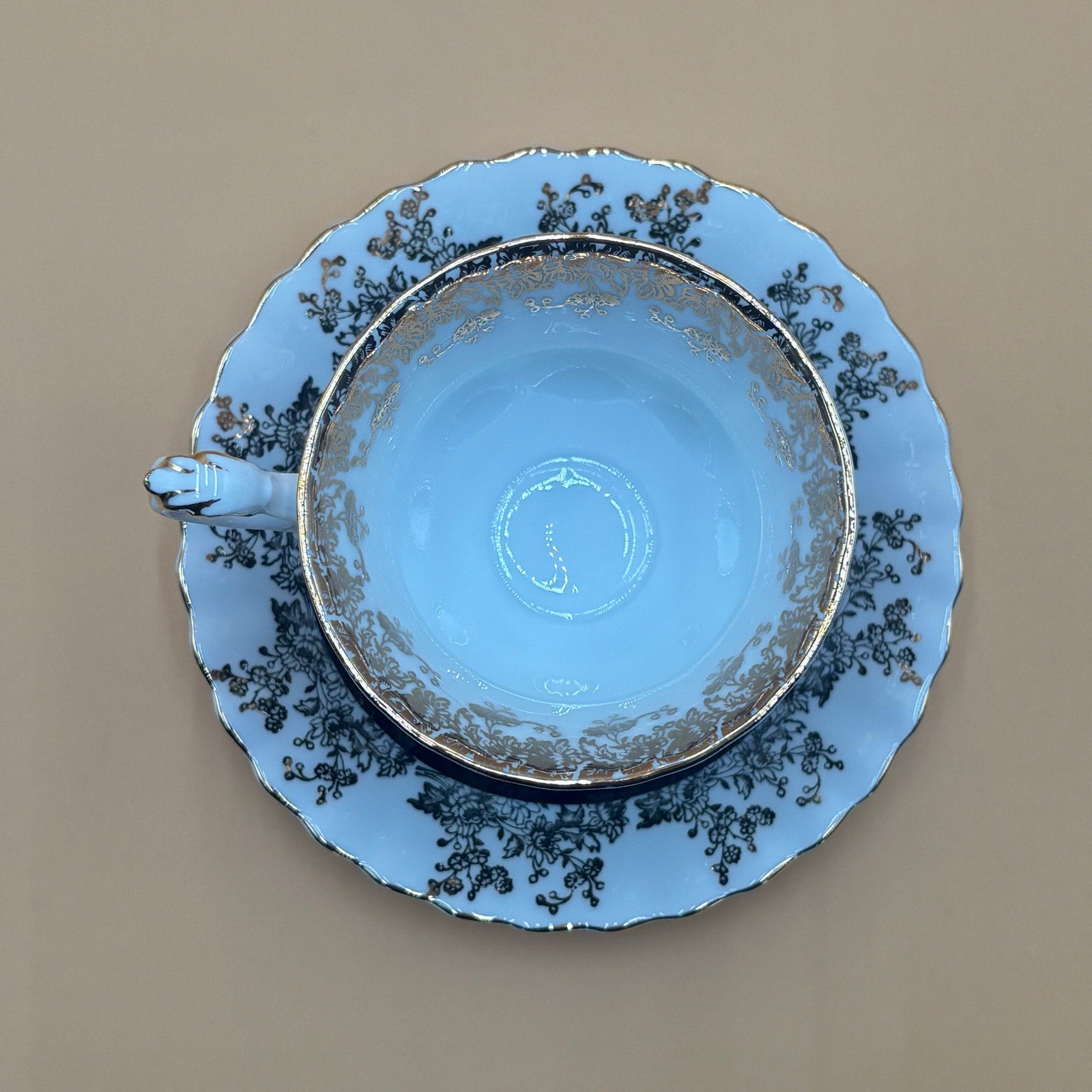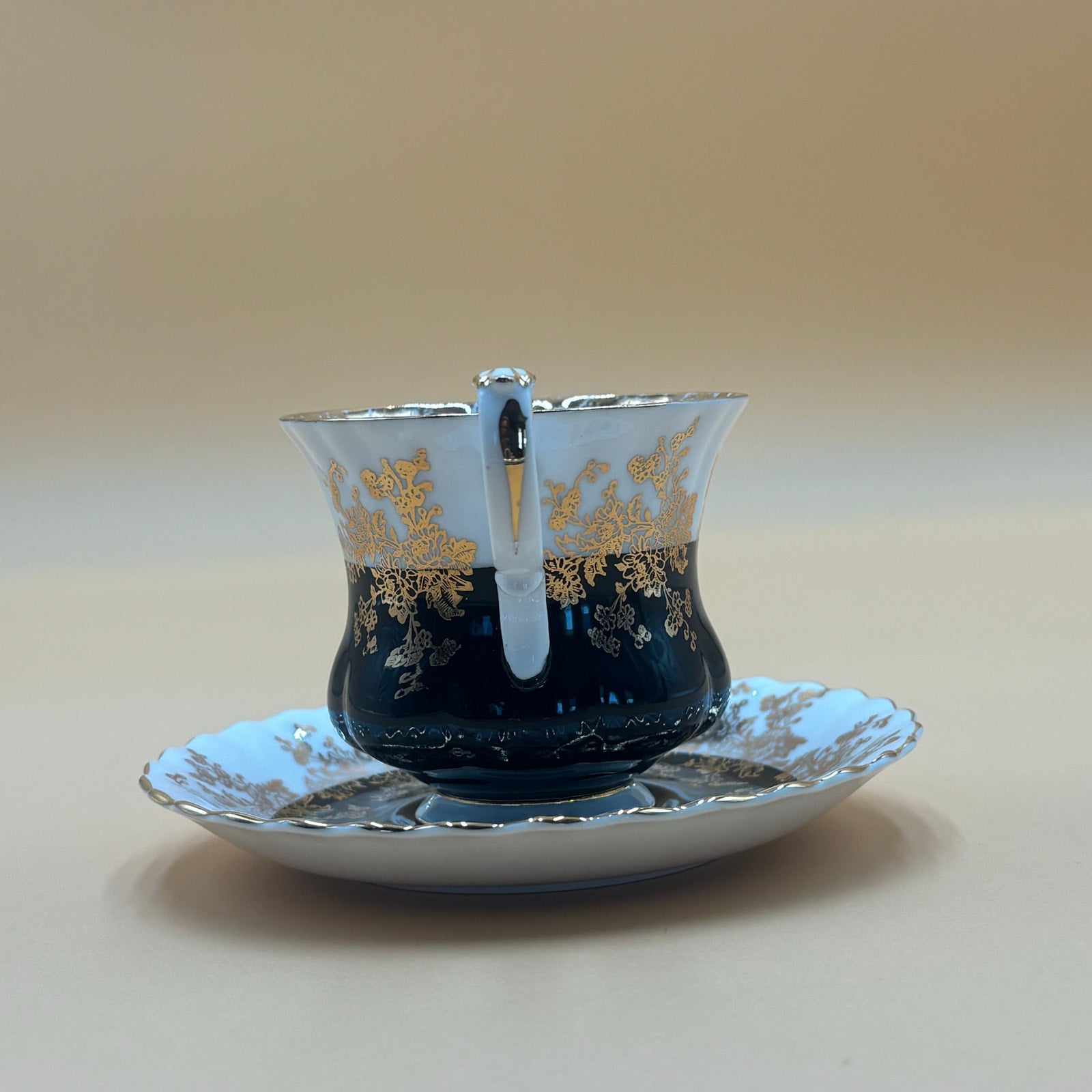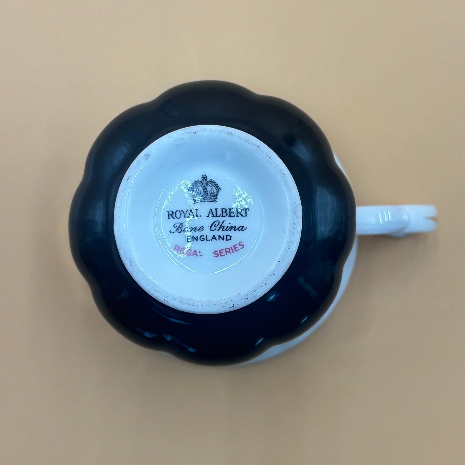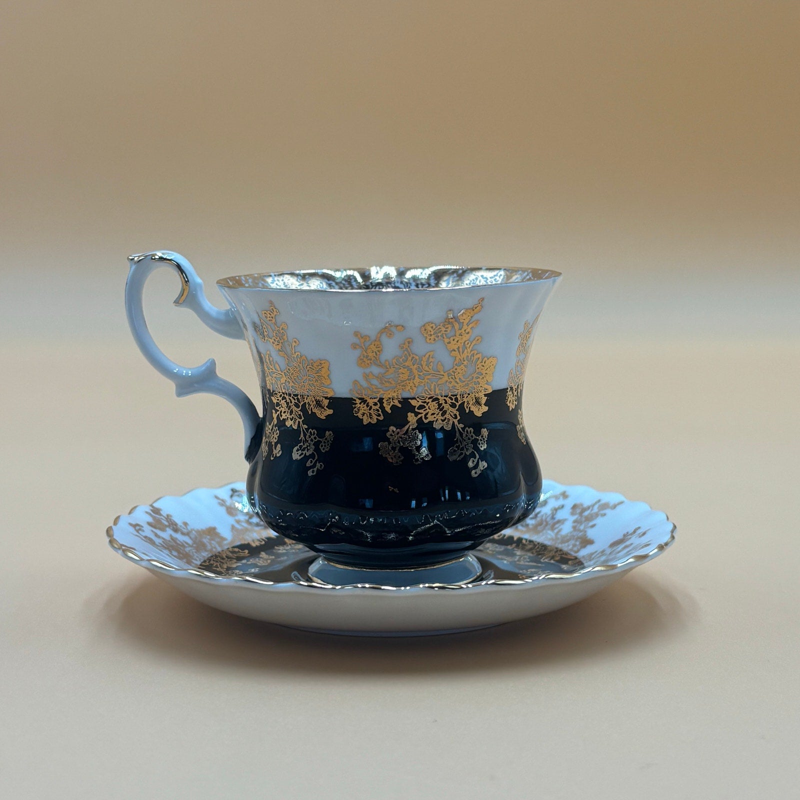 Matching teacup and saucer set from Royal Albertβs Regal Series, made in England. Black with ornate gold floral overlay and scalloped edges. Fine bone china with crown backstamp on both pieces.