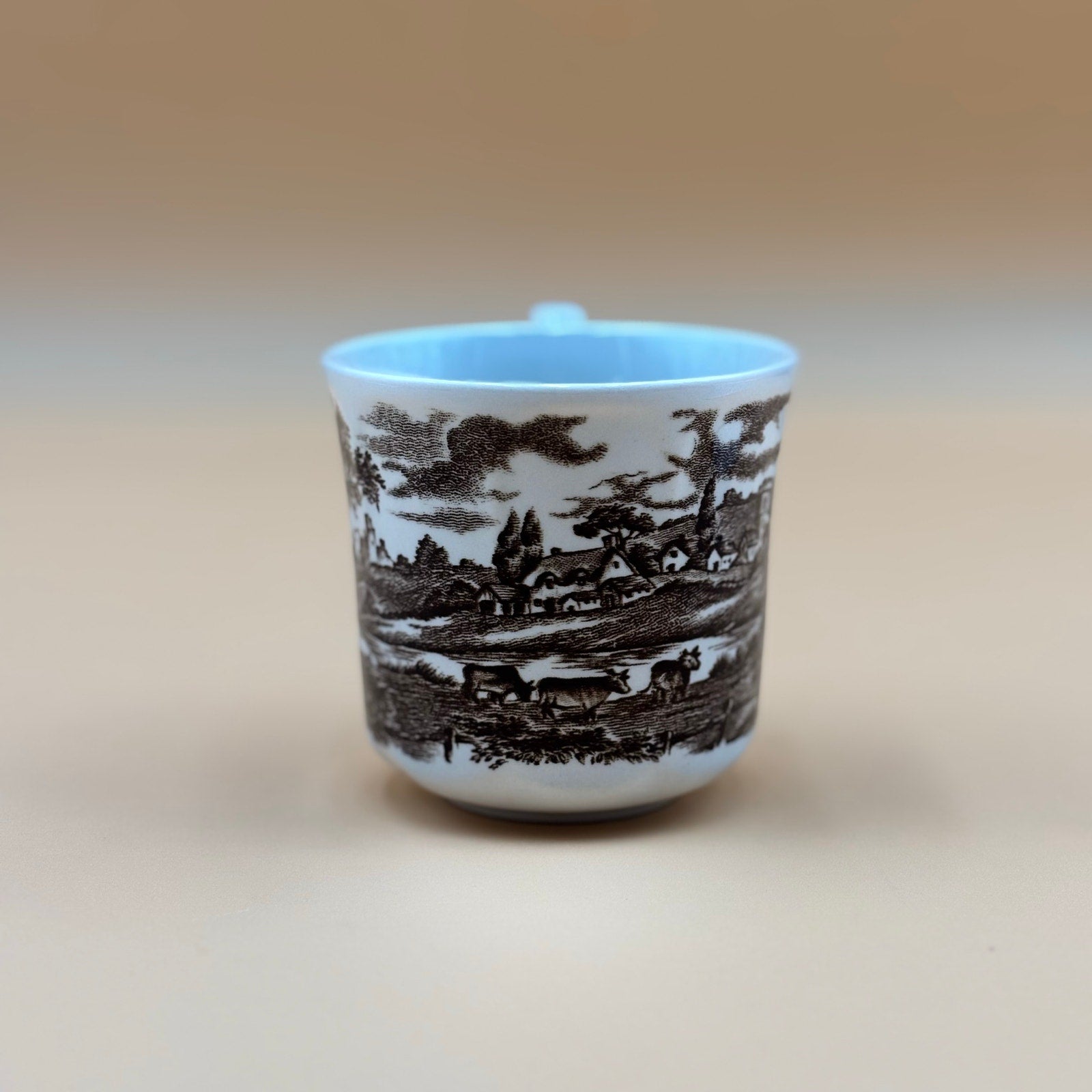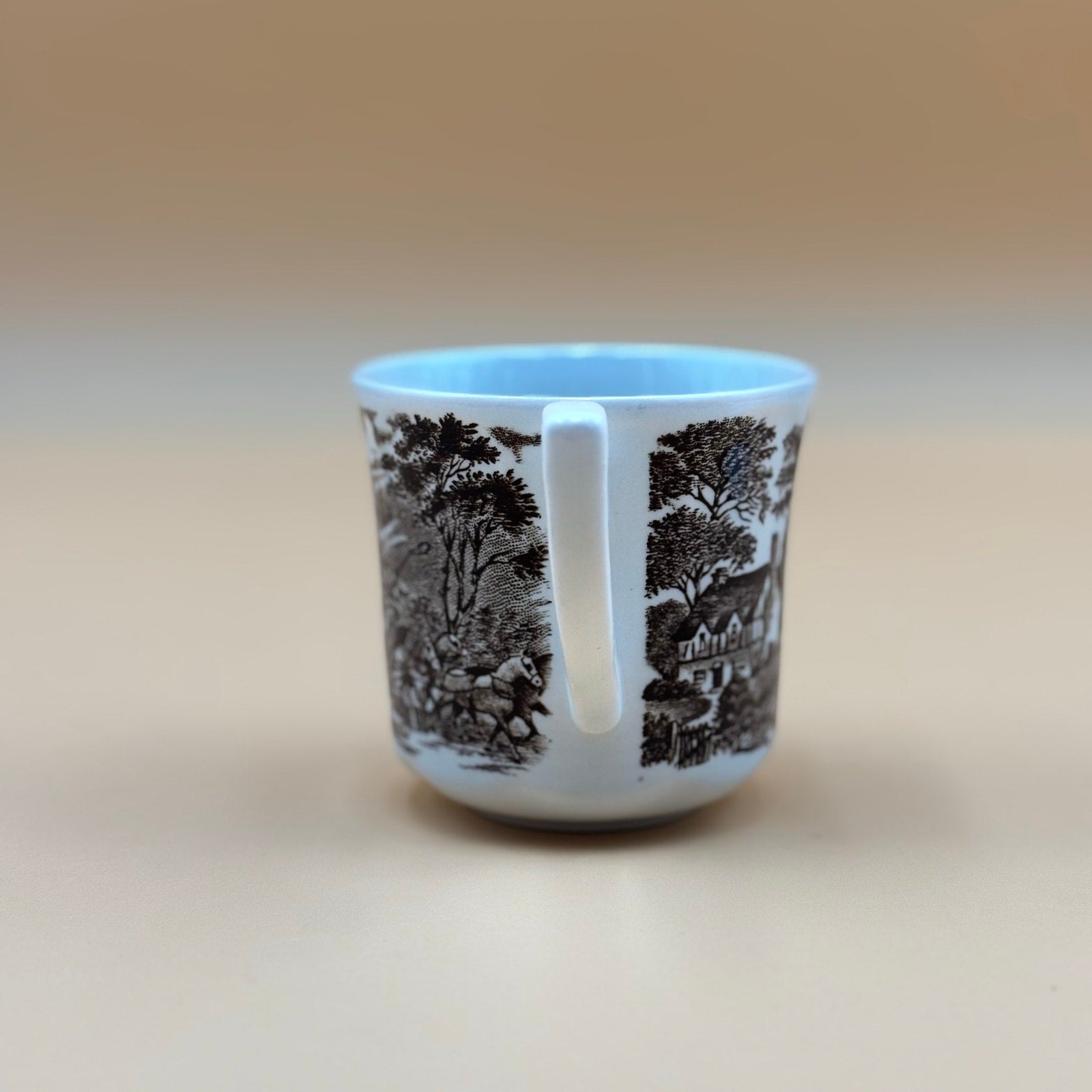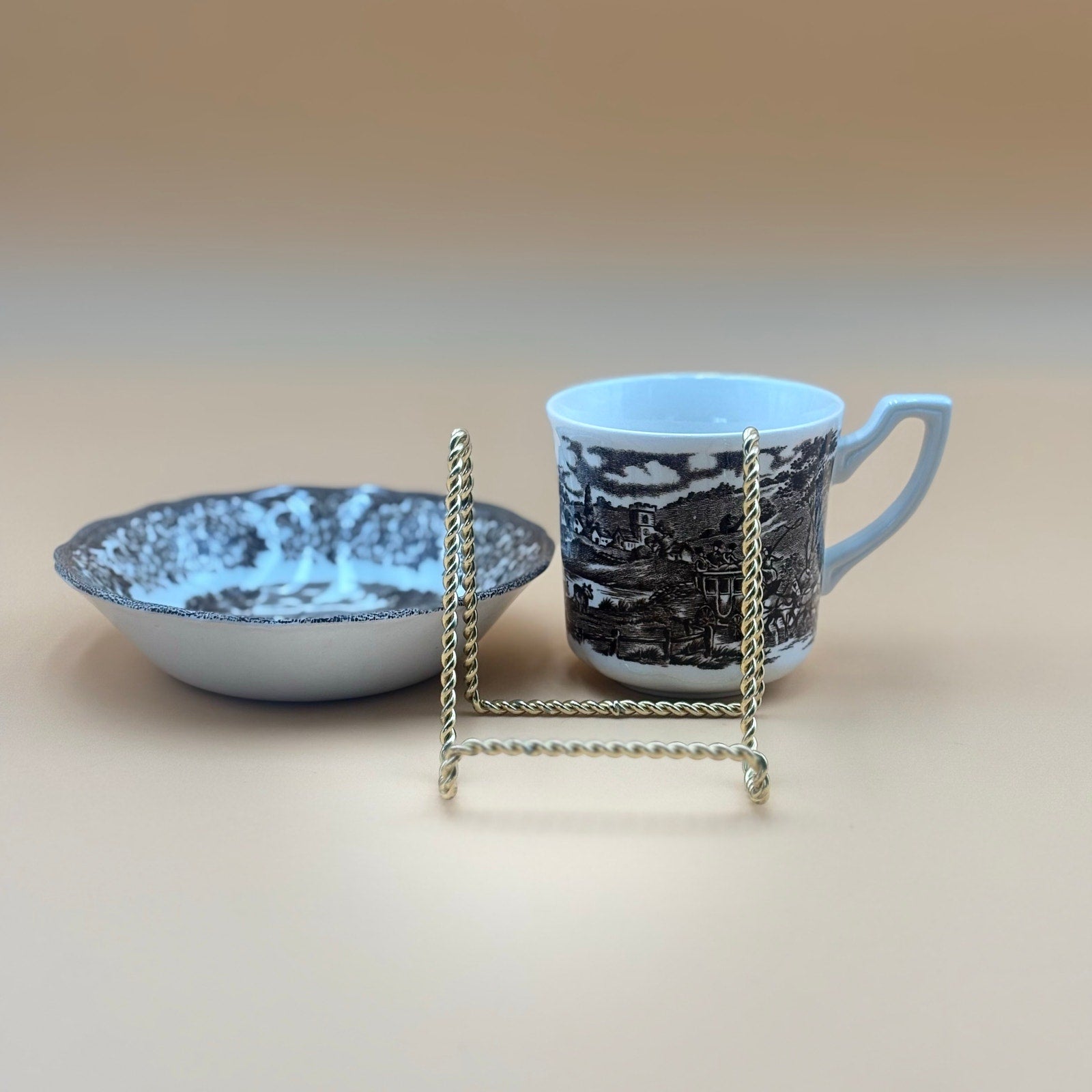 Vintage Royal Staffordshire “Stratford Stage” ironstone cup and saucer by J.&G. Meakin, England. Features a finely detailed brown transferware stagecoach scene framed by ornate floral and scroll borders. A classic English countryside design produced during the 1960s–1970s, known for its durability and timeless appeal.  Gold stand included.