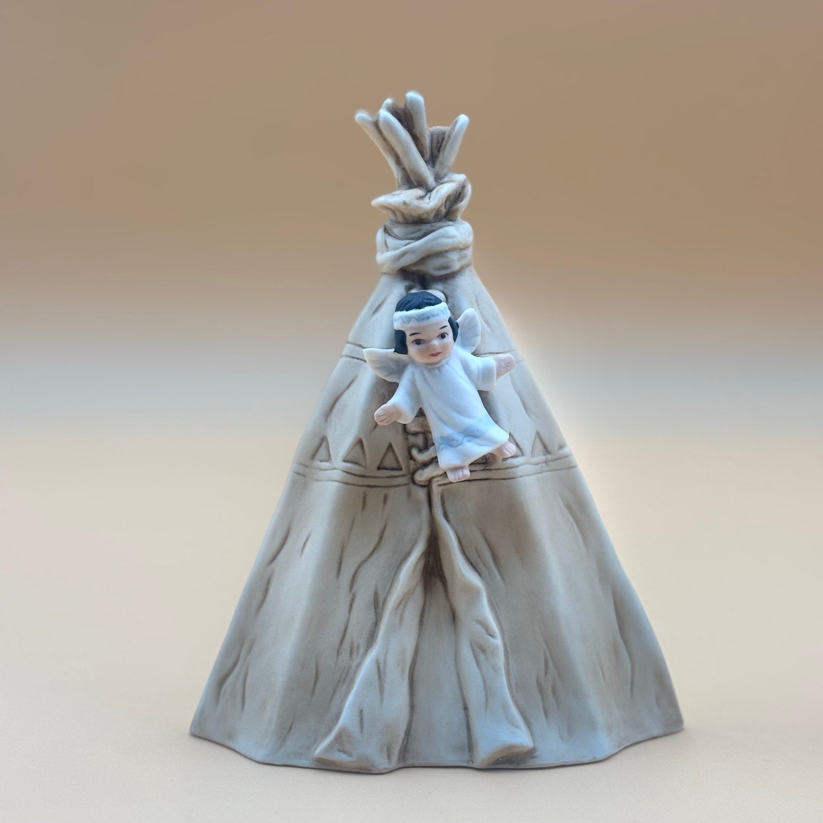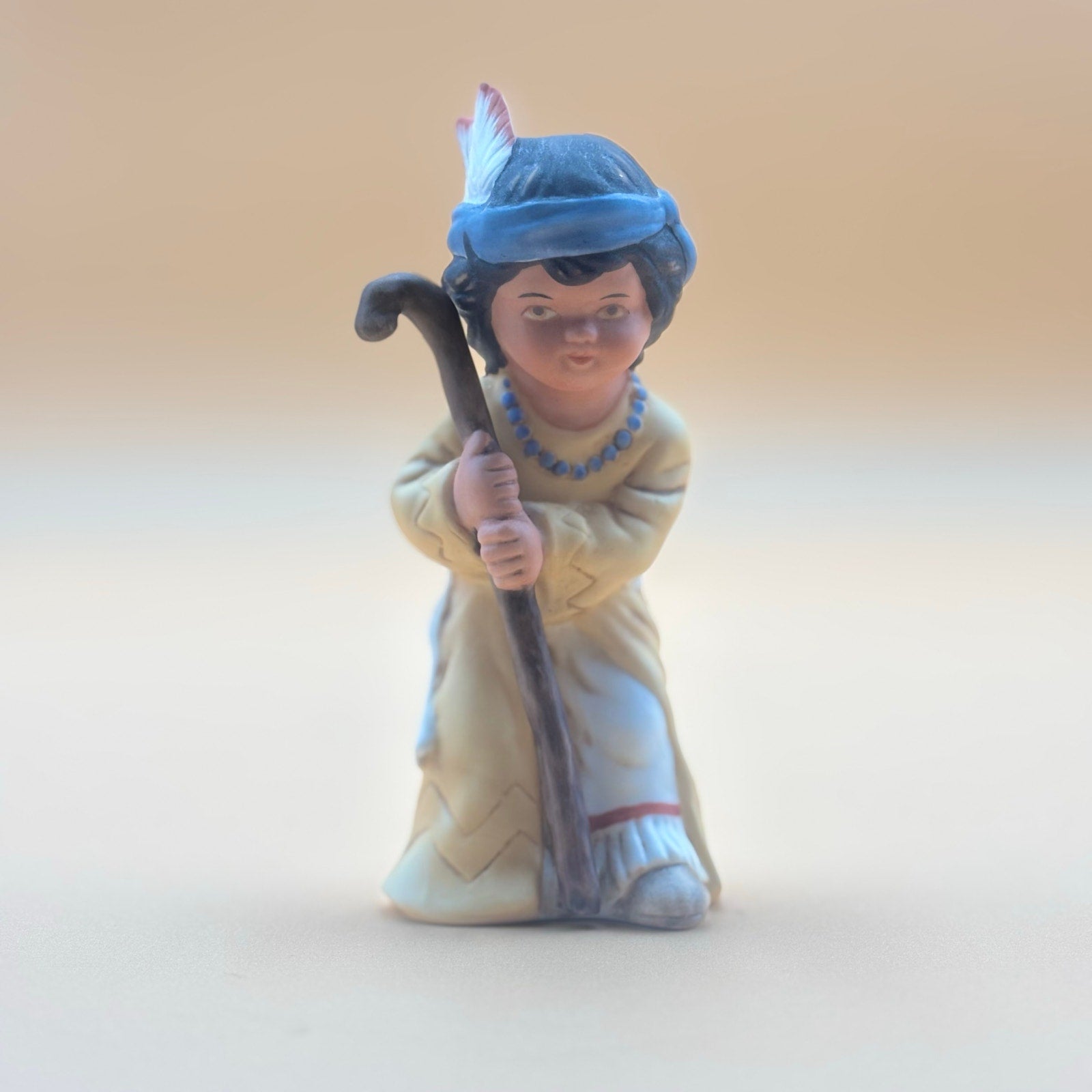 Set of three Sagebrush Kids figurines by Gregory Perillo, handcrafted in Mexico in 1985. Includes the praying girl, the figure with a cane, and a teepee piece. Marked on the base.