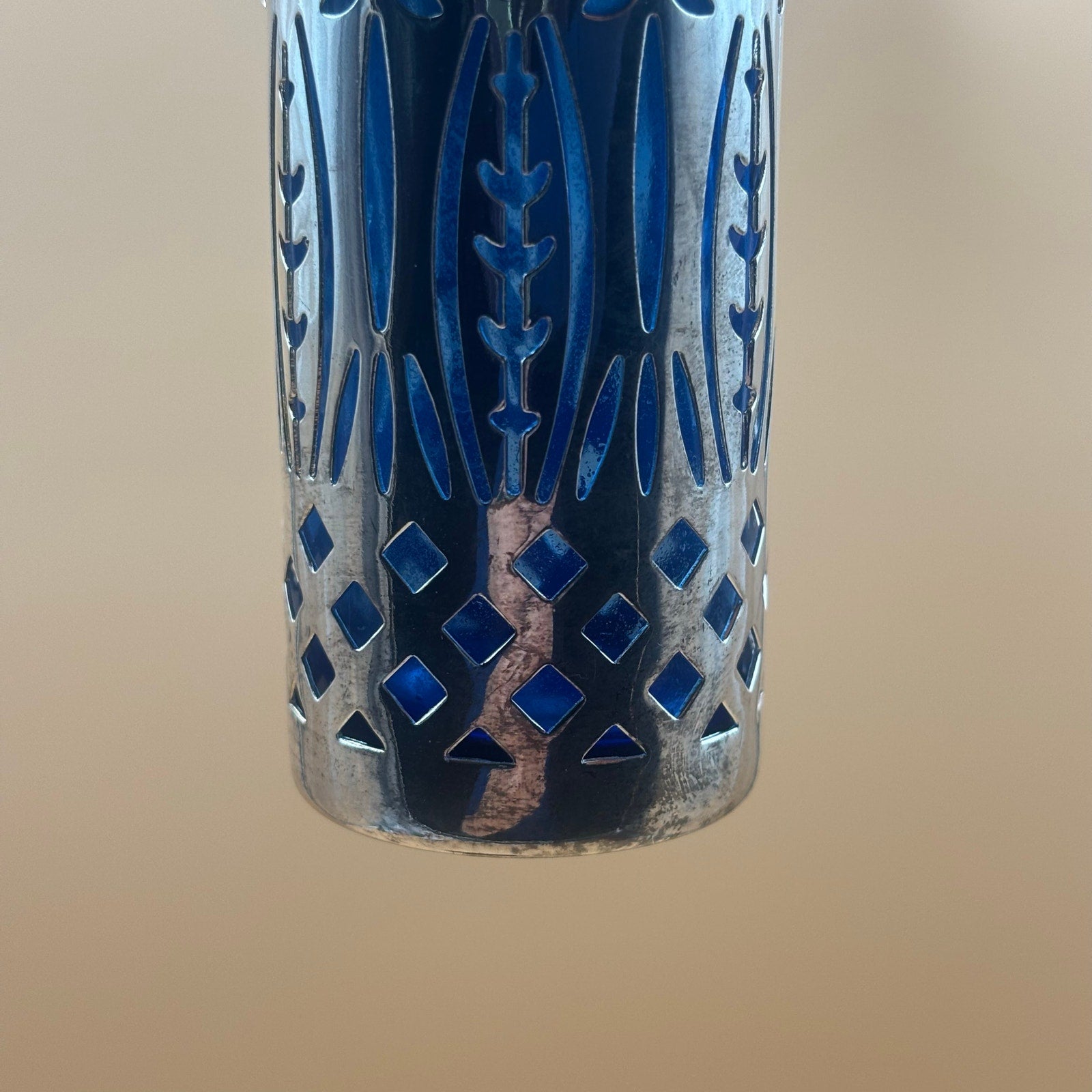Elegant pair of sapphire blue glass salt and pepper shakers with intricate silver overlay pattern. The silver shows mild patina consistent with age, with slightly more wear on the pepper shaker. Beautiful reflective finish adds a refined touch to any dining or display collection.