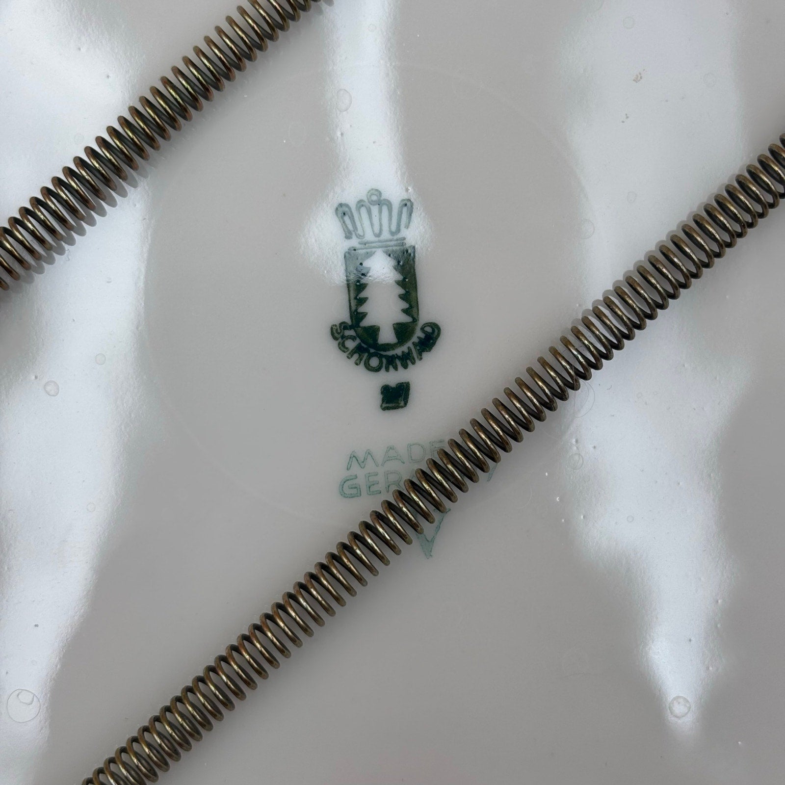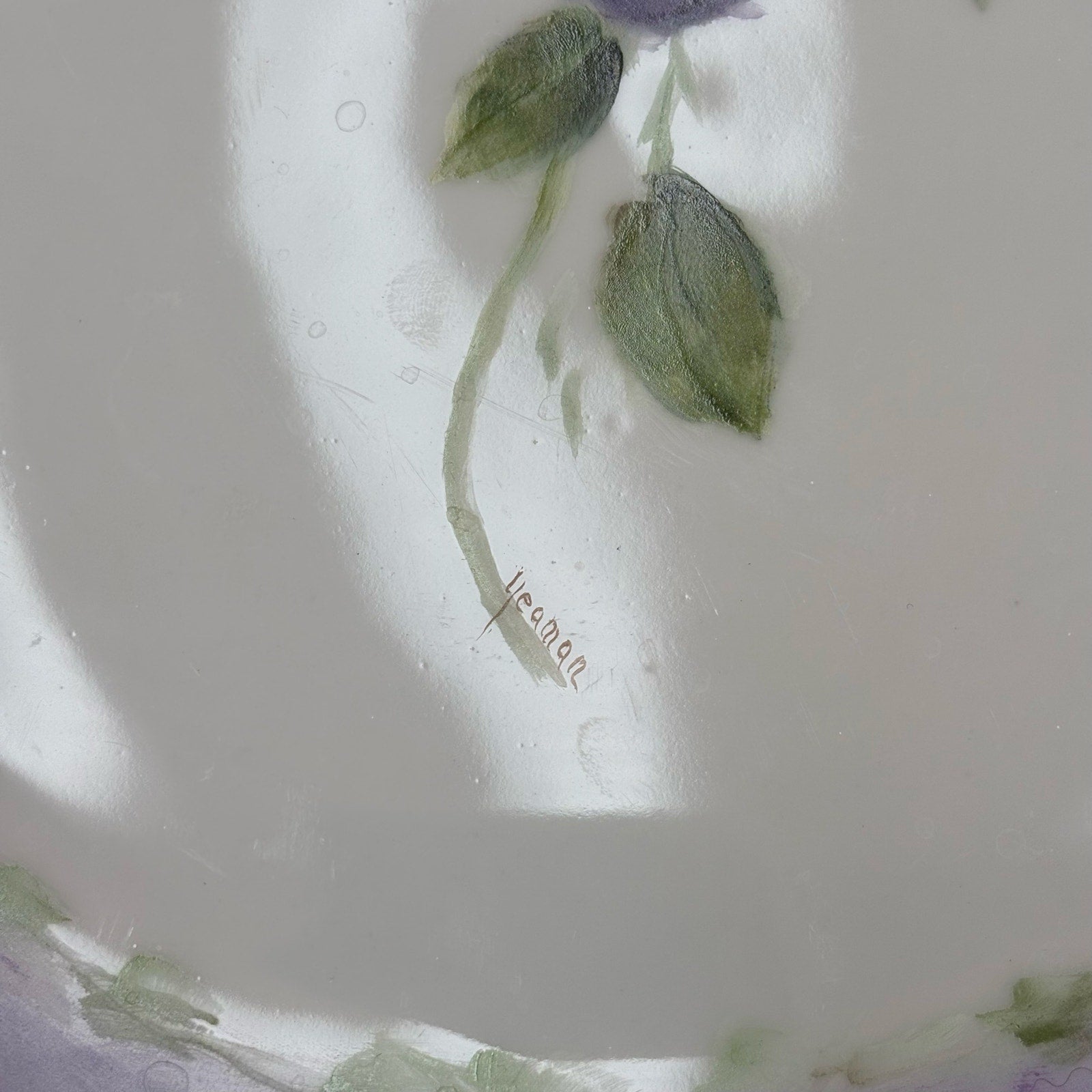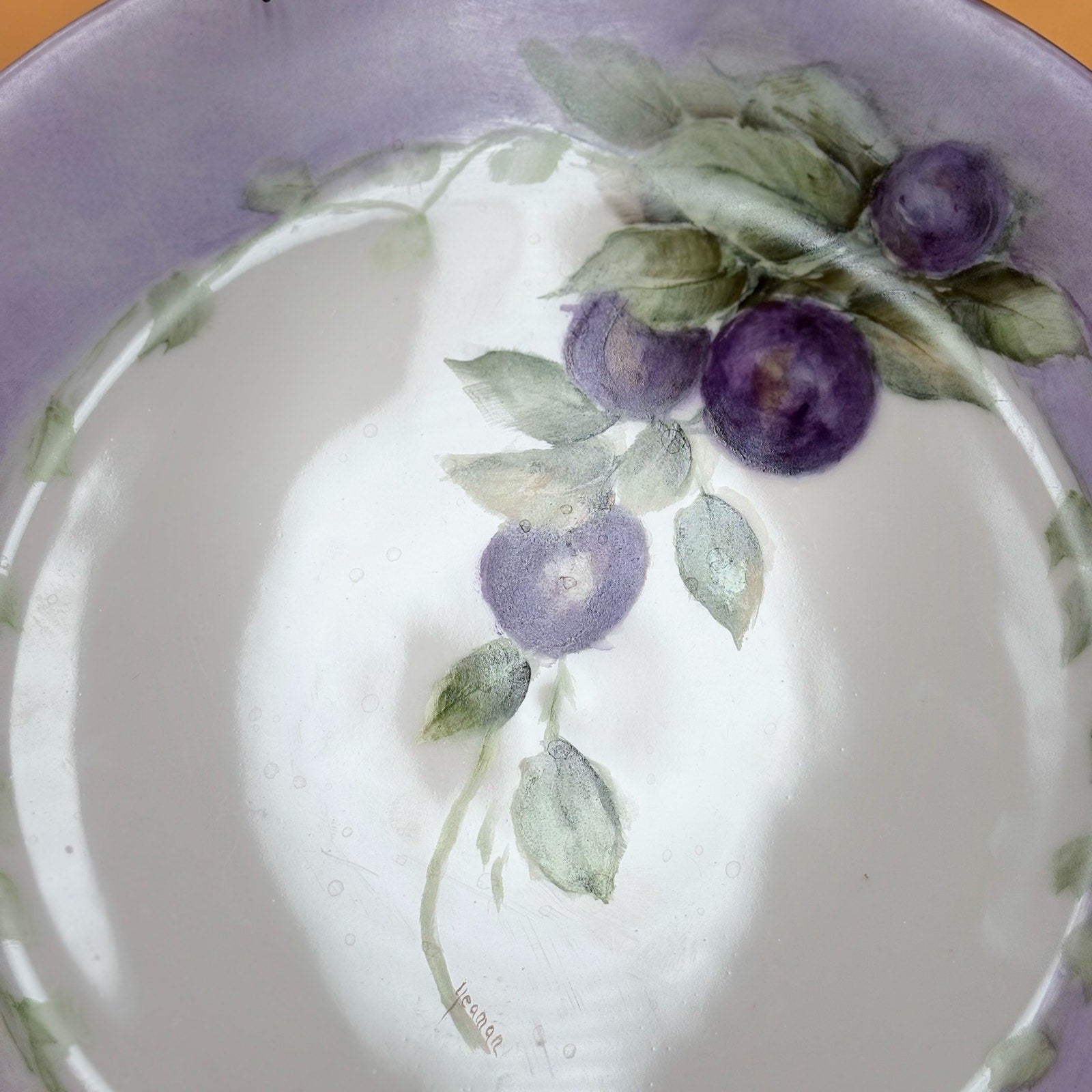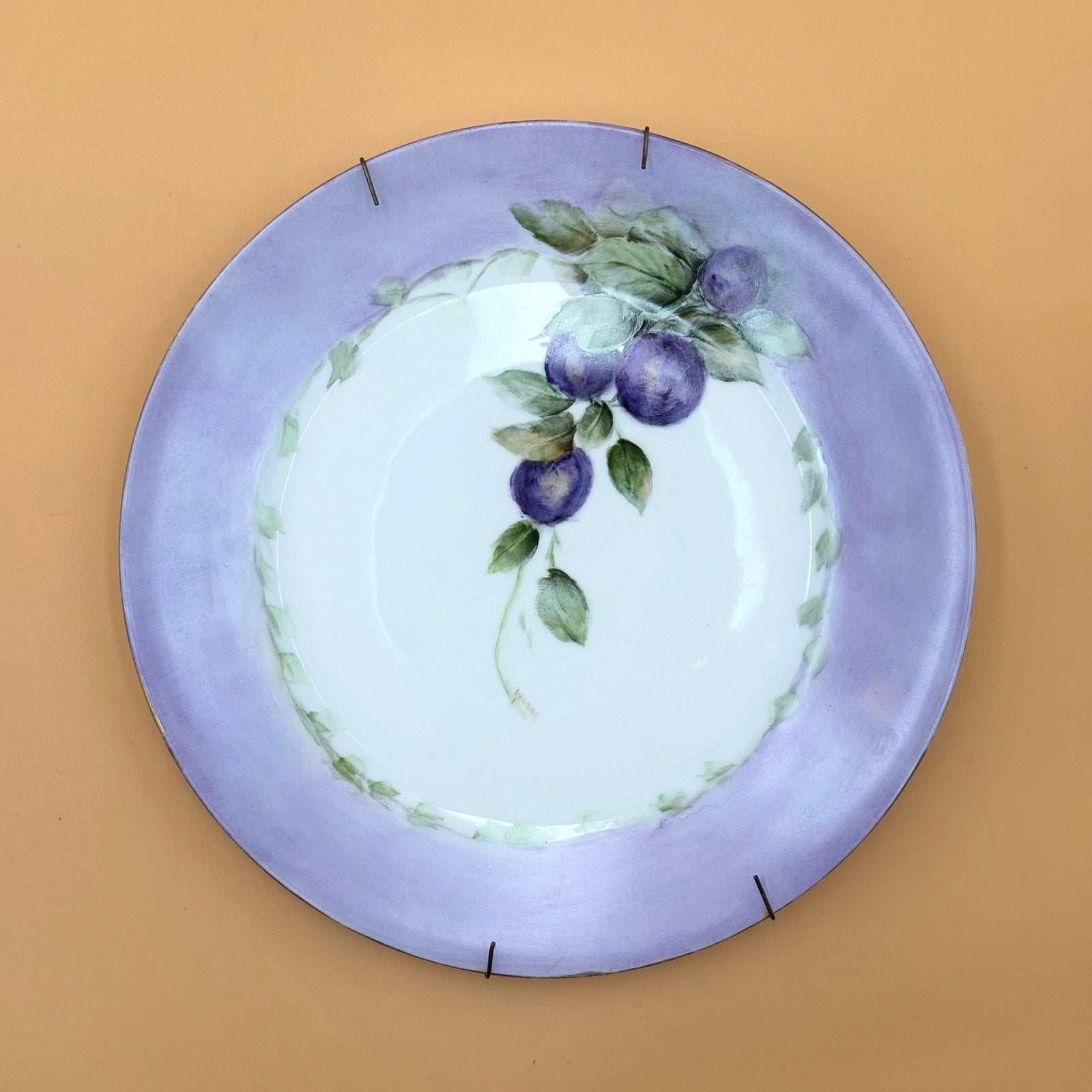 Elegant vintage porcelain plate from Schönwald, Germany, decorated with a hand-painted plum and leaf design against a soft lavender border. The plate is signed “YEAMAR” on the front, reflecting the individual who painted it. Gold outlining is present but has gently faded with age. A vintage wire hanger is attached on the back and has been left in place.