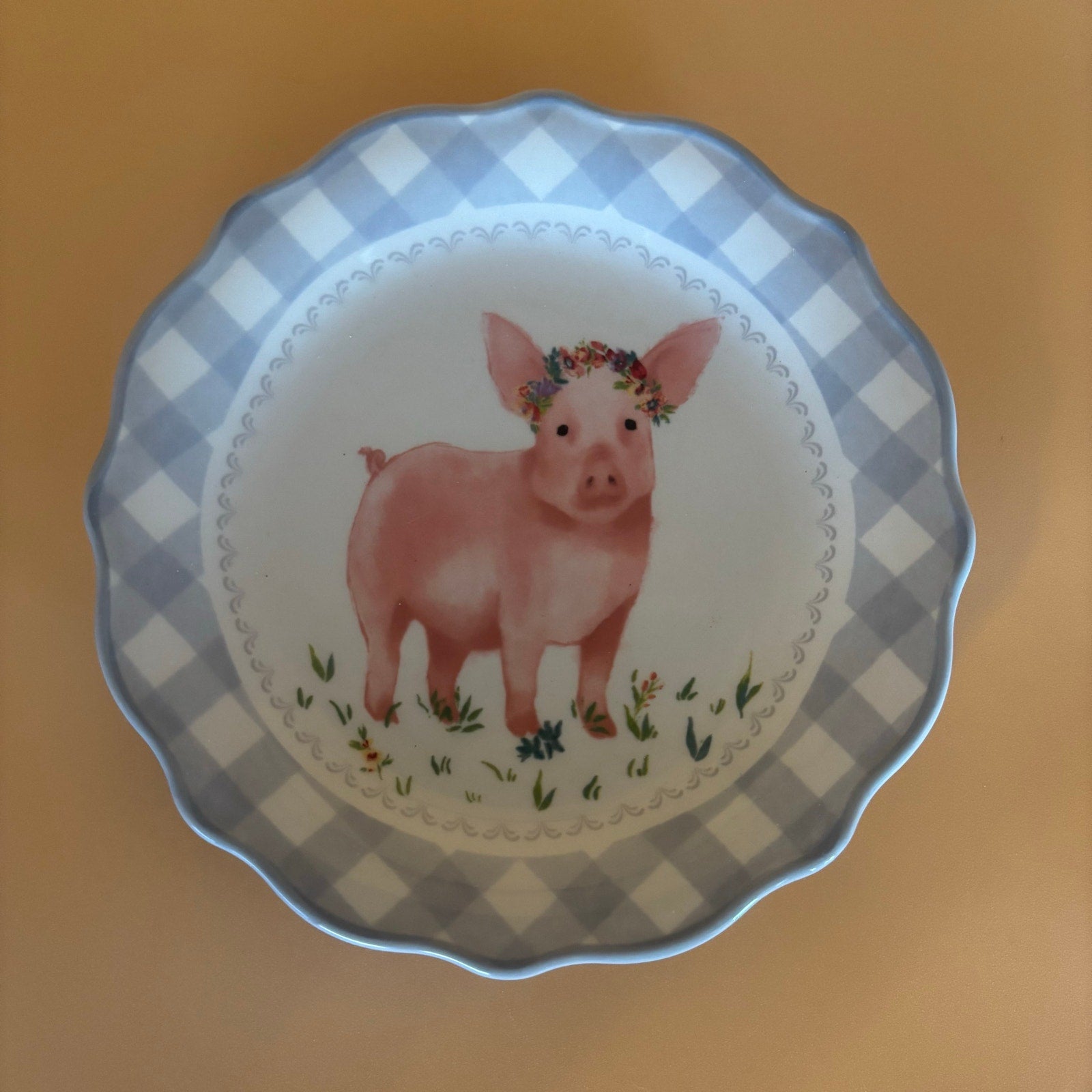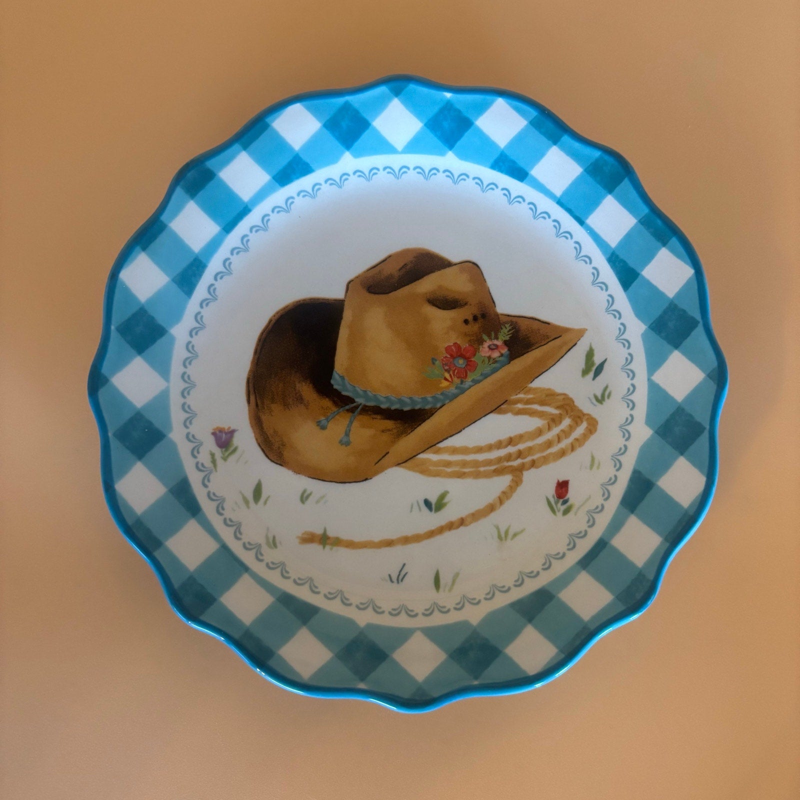 Charming set of two Pioneer Woman decorative plates featuring country-inspired designs. One plate showcases a brown cowboy hat with floral accent on a teal gingham border, while the companion plate features an adorable pink pig with flower crown on a soft blue gingham border. Both plates have scalloped edges and the iconic Pioneer Woman styling. Perfect for wall display, serving appetizers, or adding farmhouse charm to your kitchen decor.