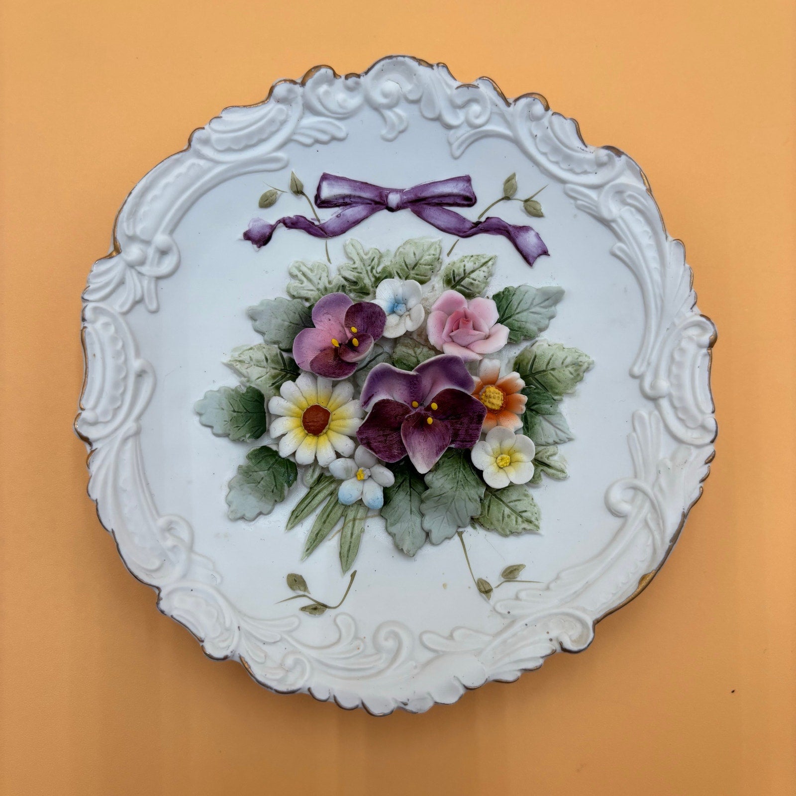 Pair of vintage hand-painted ceramic wall plaques by Lefton China, marked KW4743. Each features a raised floral bouquet with a purple bow and ornate embossed edges. Includes built-in holes for wall hanging. Perfect for cottagecore, shabby chic, or vintage-inspired decor.