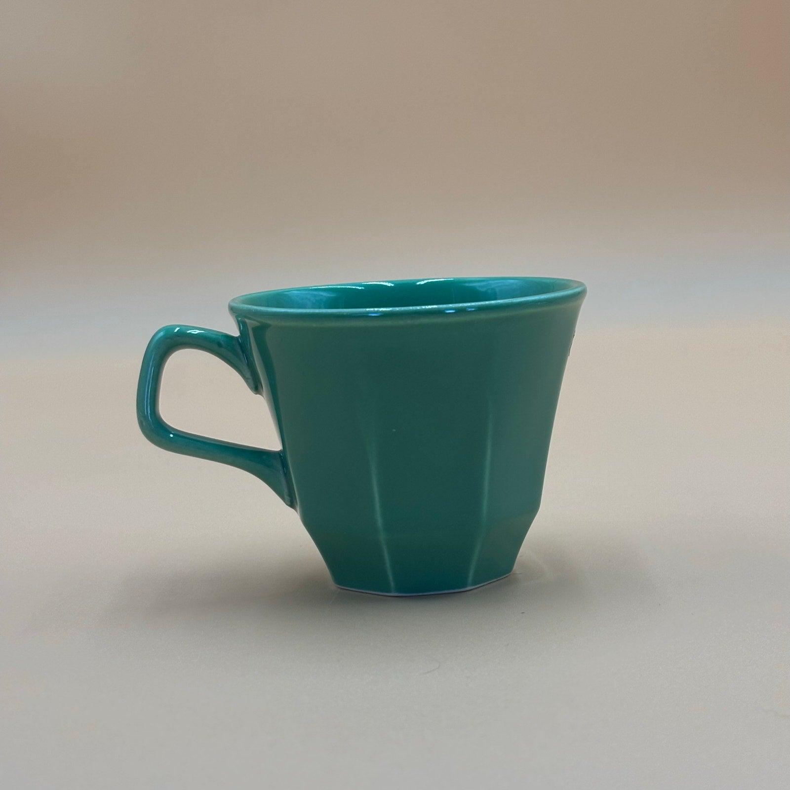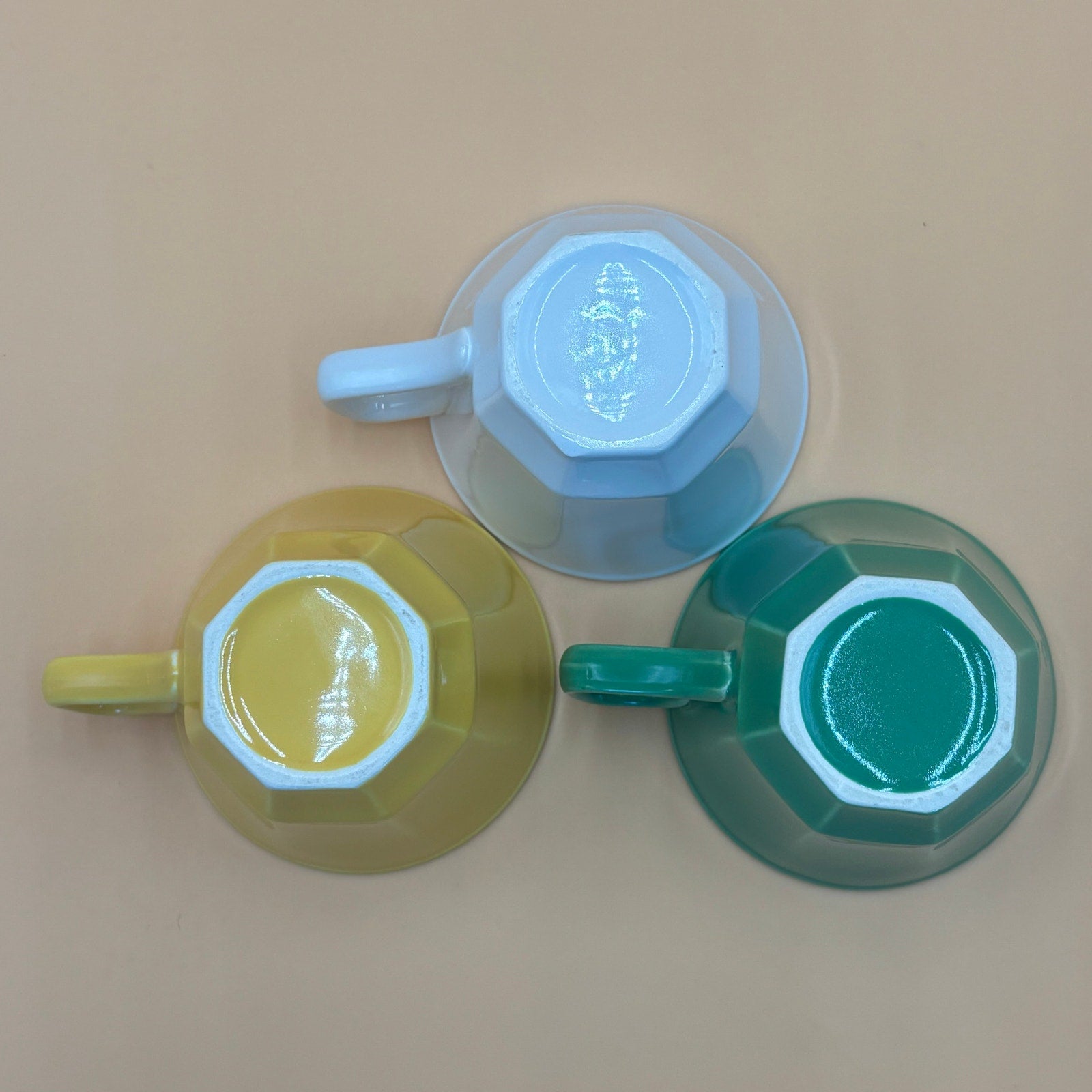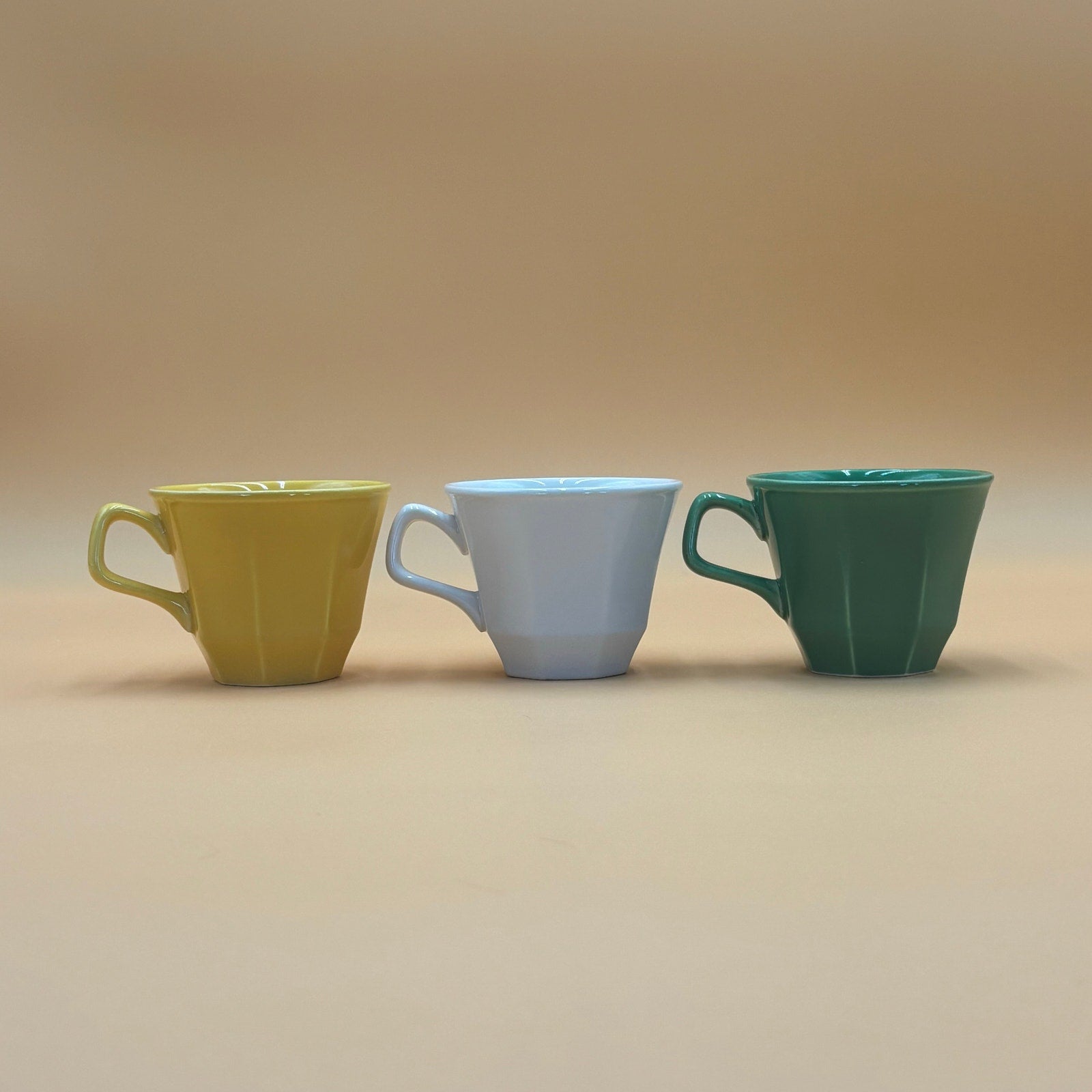 Set of three vintage Homer Laughlin tea cups in yellow, white, and green to match their colorful dinnerware collections. These charming cups feature a simple geometric design with comfortable handles. Perfect as replacement pieces for your collection or to mix and match with other vintage dishware.